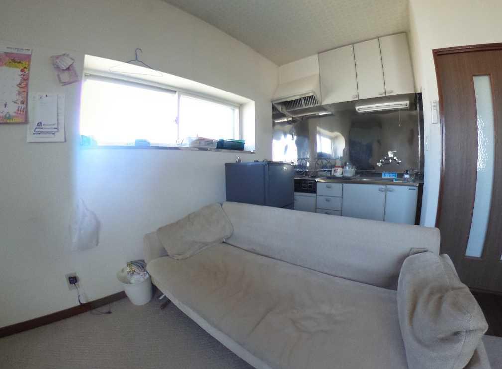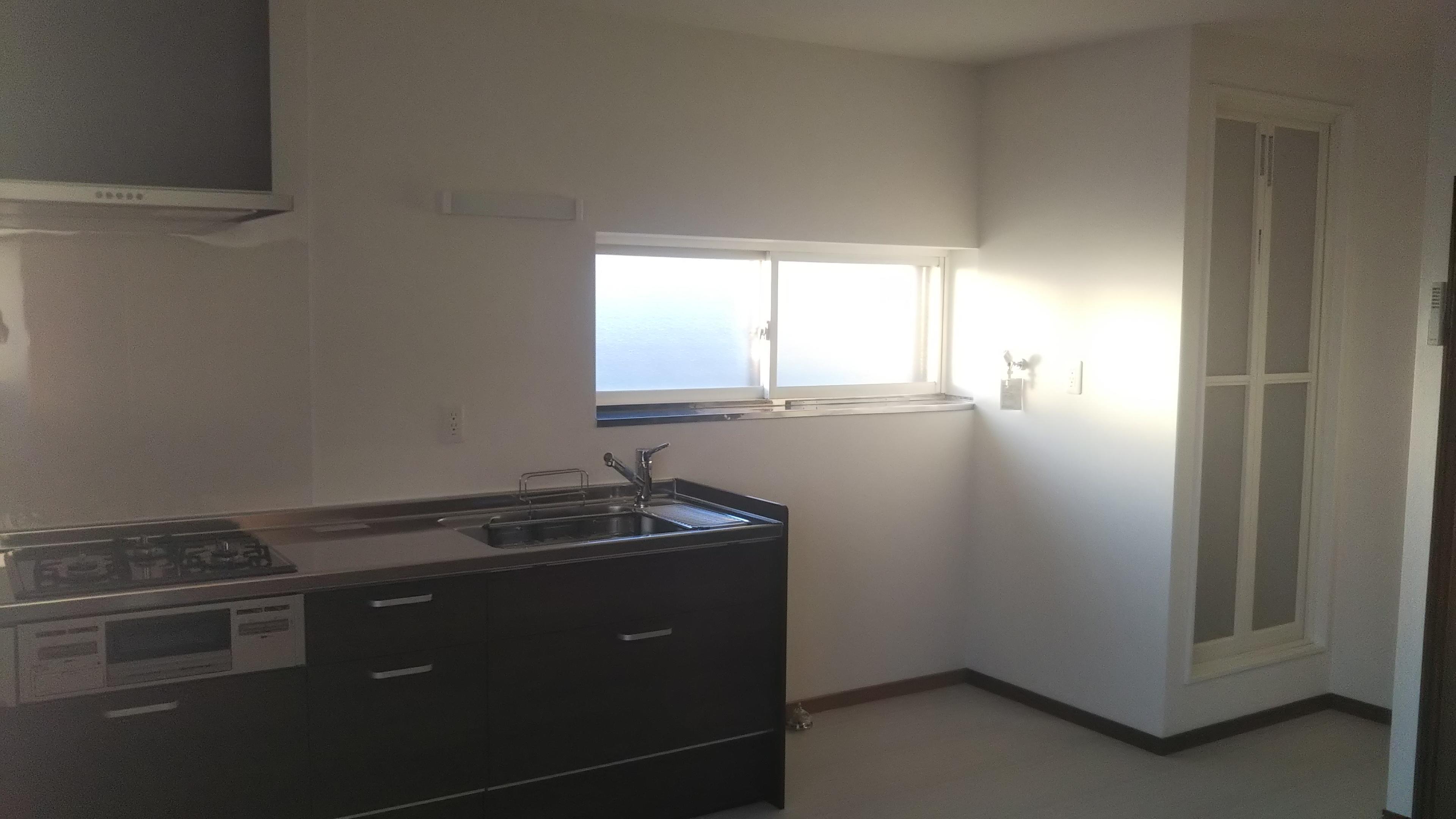 キッチンの位置を変更し、シャワーユニットを設置しました。シャワーユニット横には洗濯機も置けるようにリフォームしています。クロスも貼り替えて床にはクッションフロアを貼りました。清々しい気持ちで新しい生活をしていただければと思います。