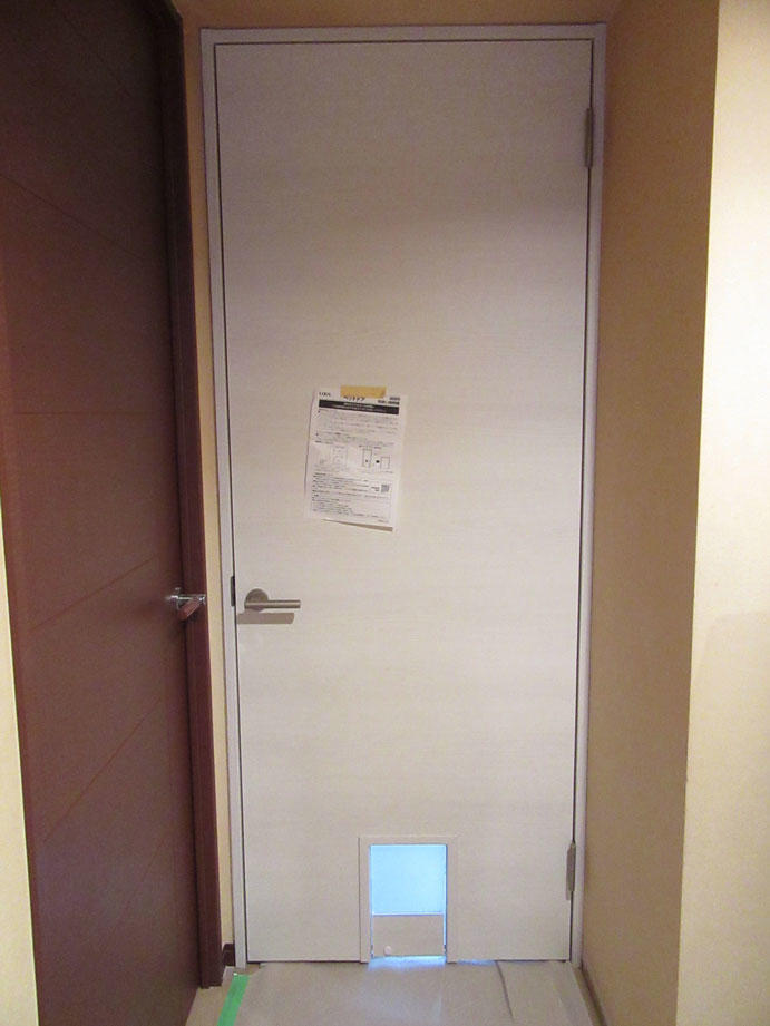 ご用命いただきありがとうございます。 今回はペットのことを考えた内部建具の取替工事を担当させていただきました。 私自身昔猫を飼っていたので、昔のことを思い出しつつご担当させていただきました。 今度は是非猫ちゃんと一緒に遊びにいらしてください! ありがとうございました。