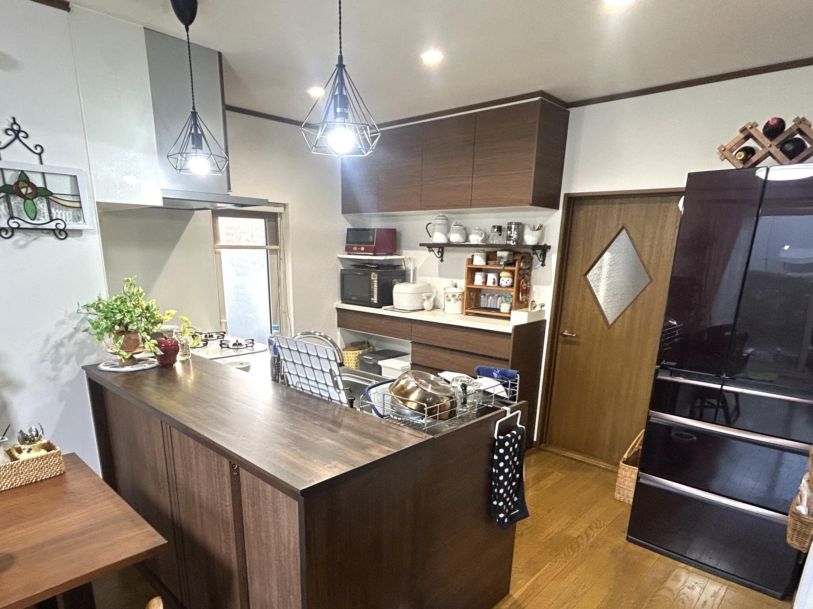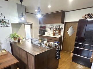 もともとのキッチンとカップボードの距離が遠かったため、壁をふかすなどし、使いやすい位置にキッチンを設置しました。 キッチン前の収納は大工さんと建具屋さんに造作してもらい、建具の面材と塗装をキッチンの面材に合わせるようにし、色の統一感を出しました。 お客様の方でご準備いただいた照明と相まってオシャレな雰囲気に仕上がりました。