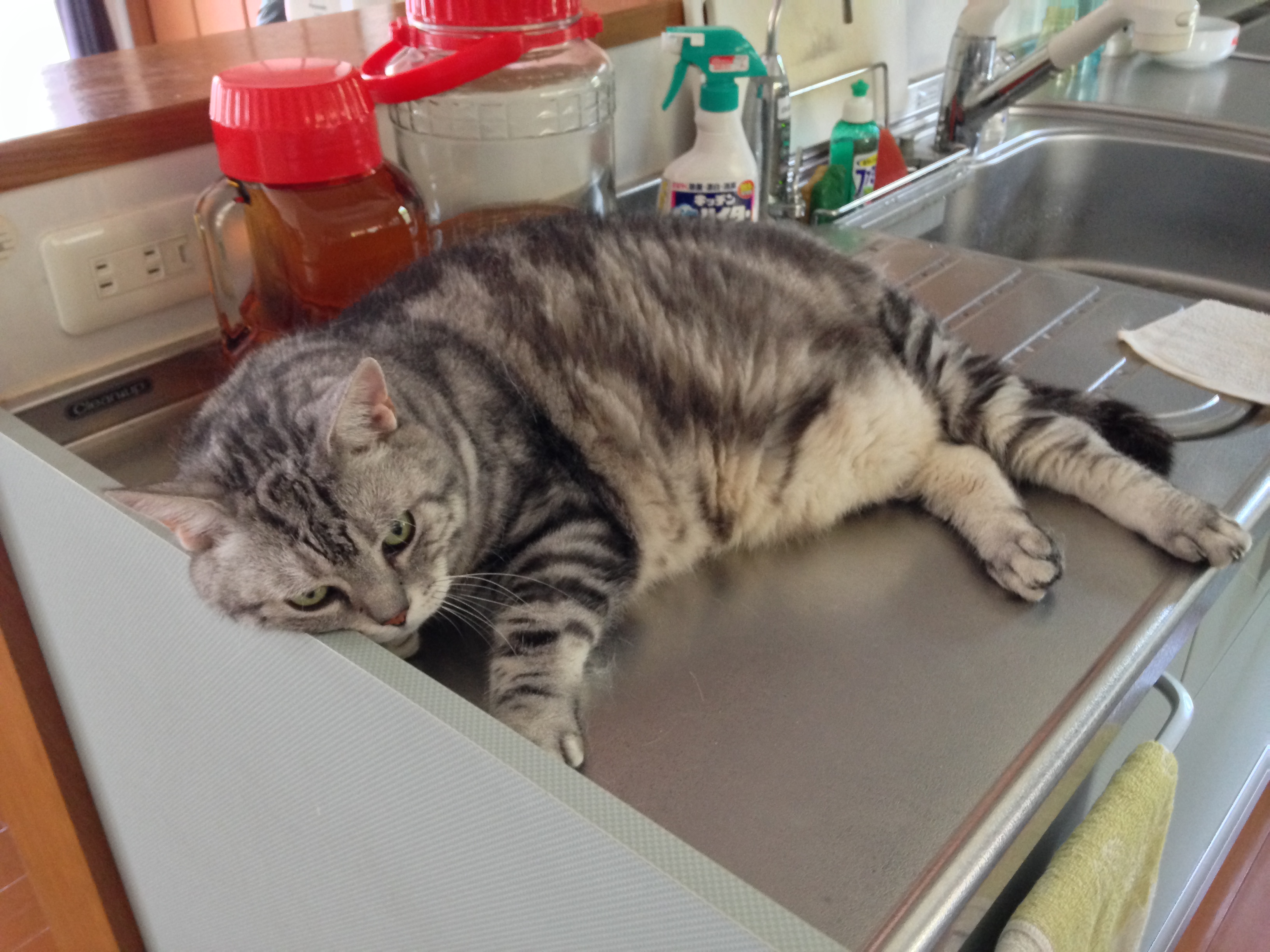 キッチンのステンレス天板部分が冷たくて気持ちいいみたいですね~