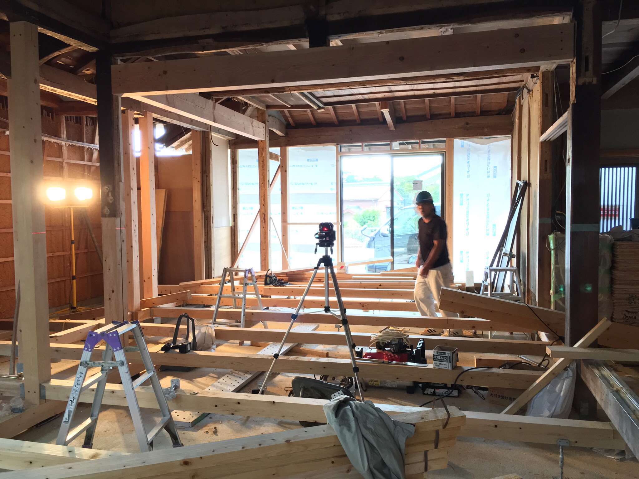 厚みのある下地合板にて、根太を使わない工法が増えてきました。