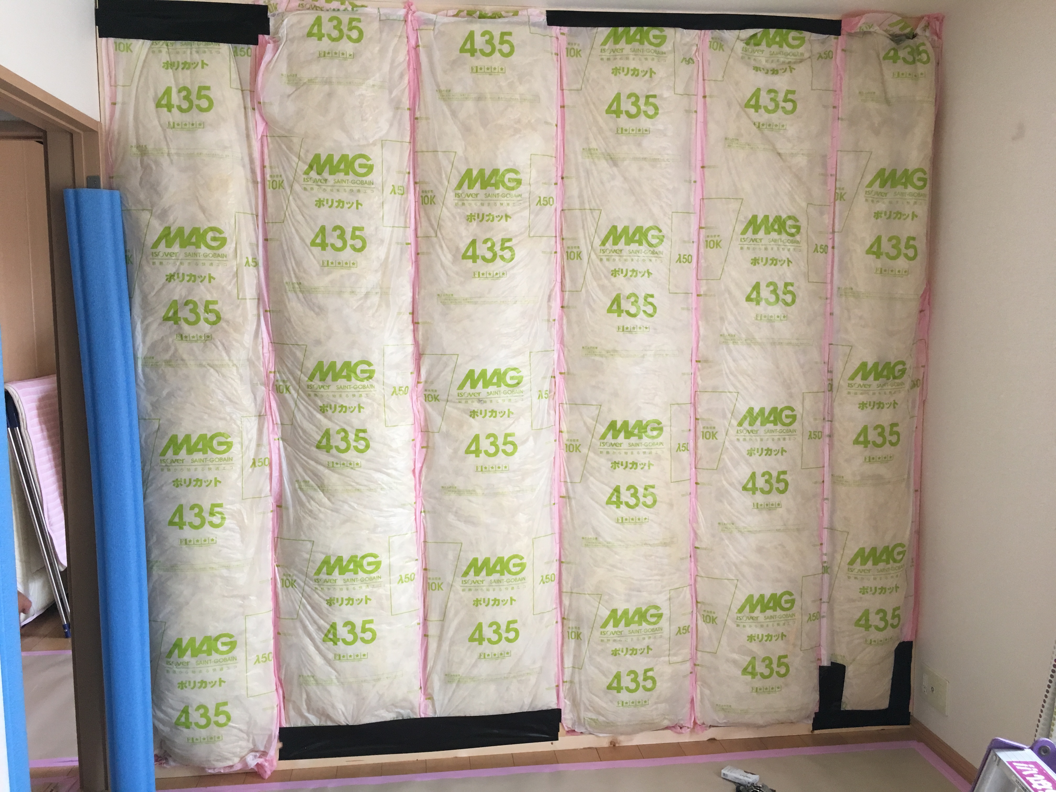断熱材のを入れてこちら側も遮音しーとを張ります。