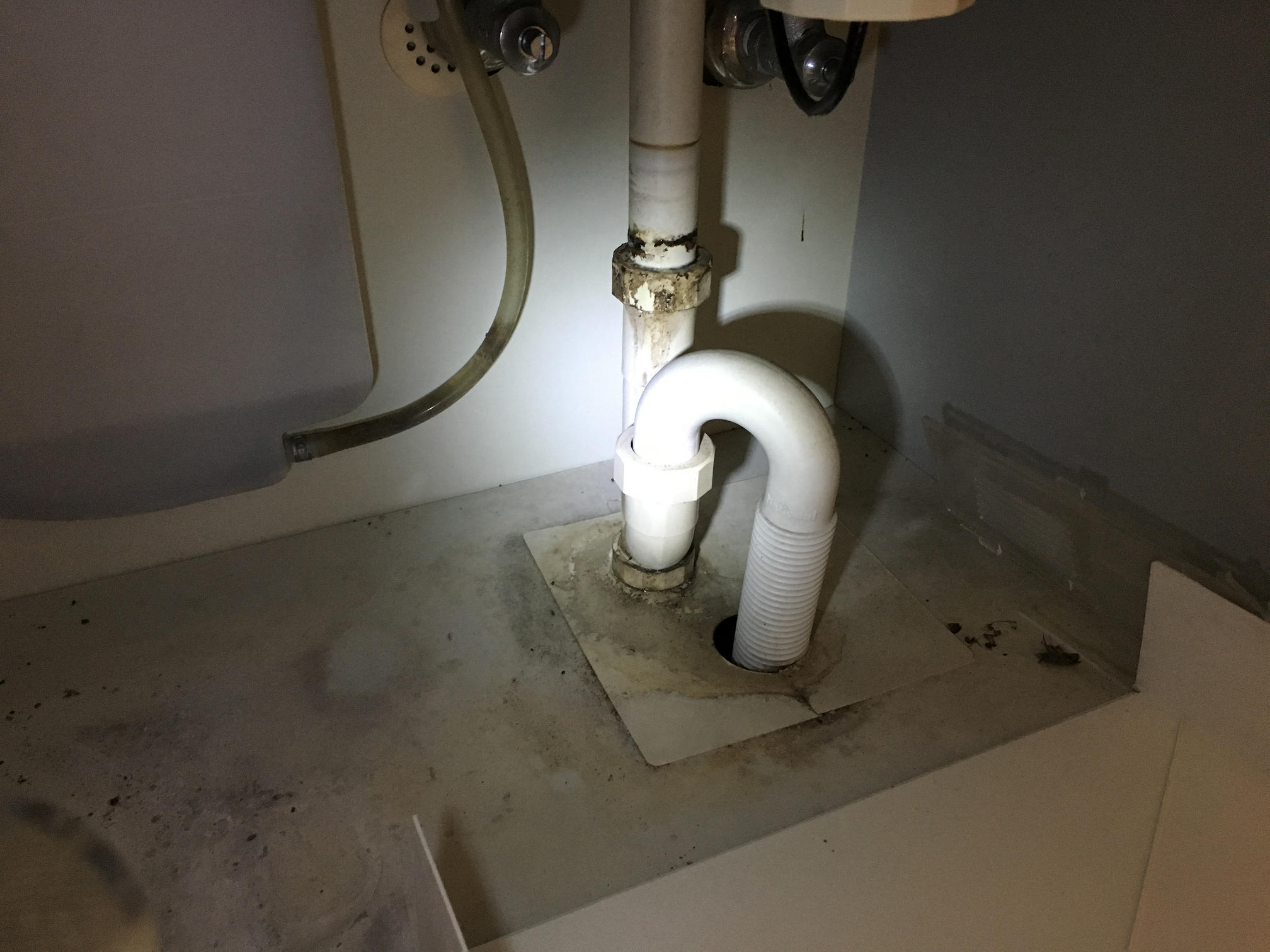 化粧台ボウル下の排水管のトラップ接続部分が抜けていました。