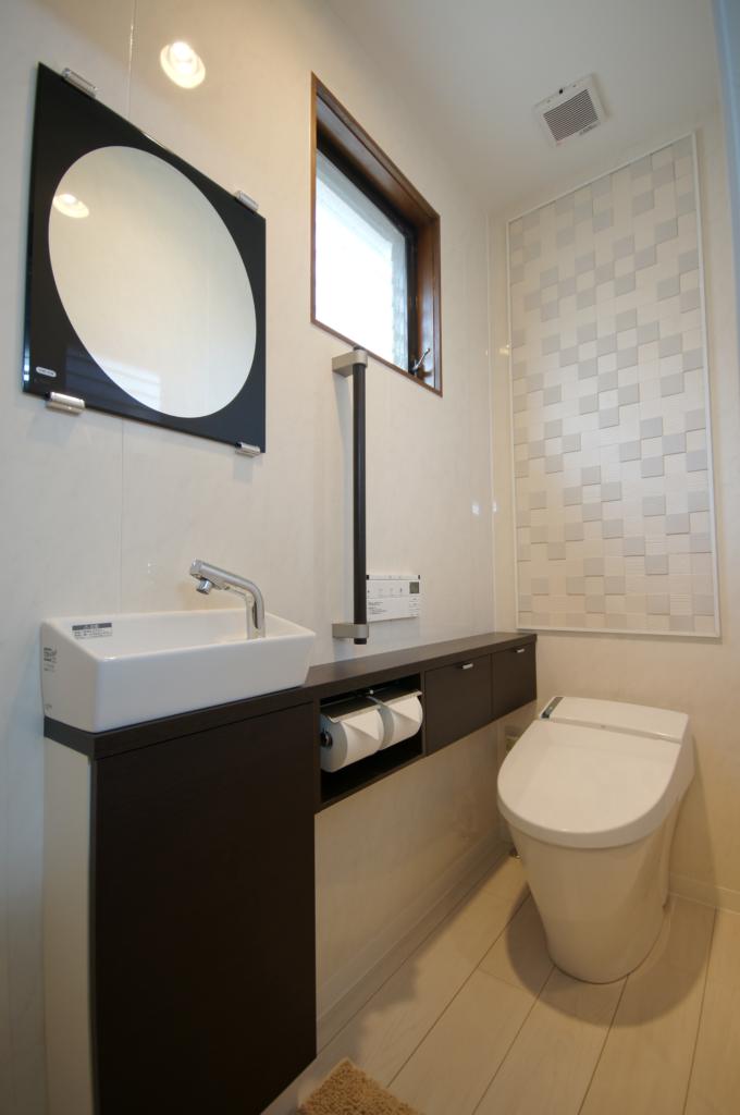 トイレ Re・home 段になっている部分の床のみを便器共解体、床はバリアフリーにしました。壁は鏡面不燃化粧板、一部エコカラット貼で脱臭・調湿。「トイレ」よりも落ち着きある「パウダールーム」に近いものにしたい!というM様のご要望でした。