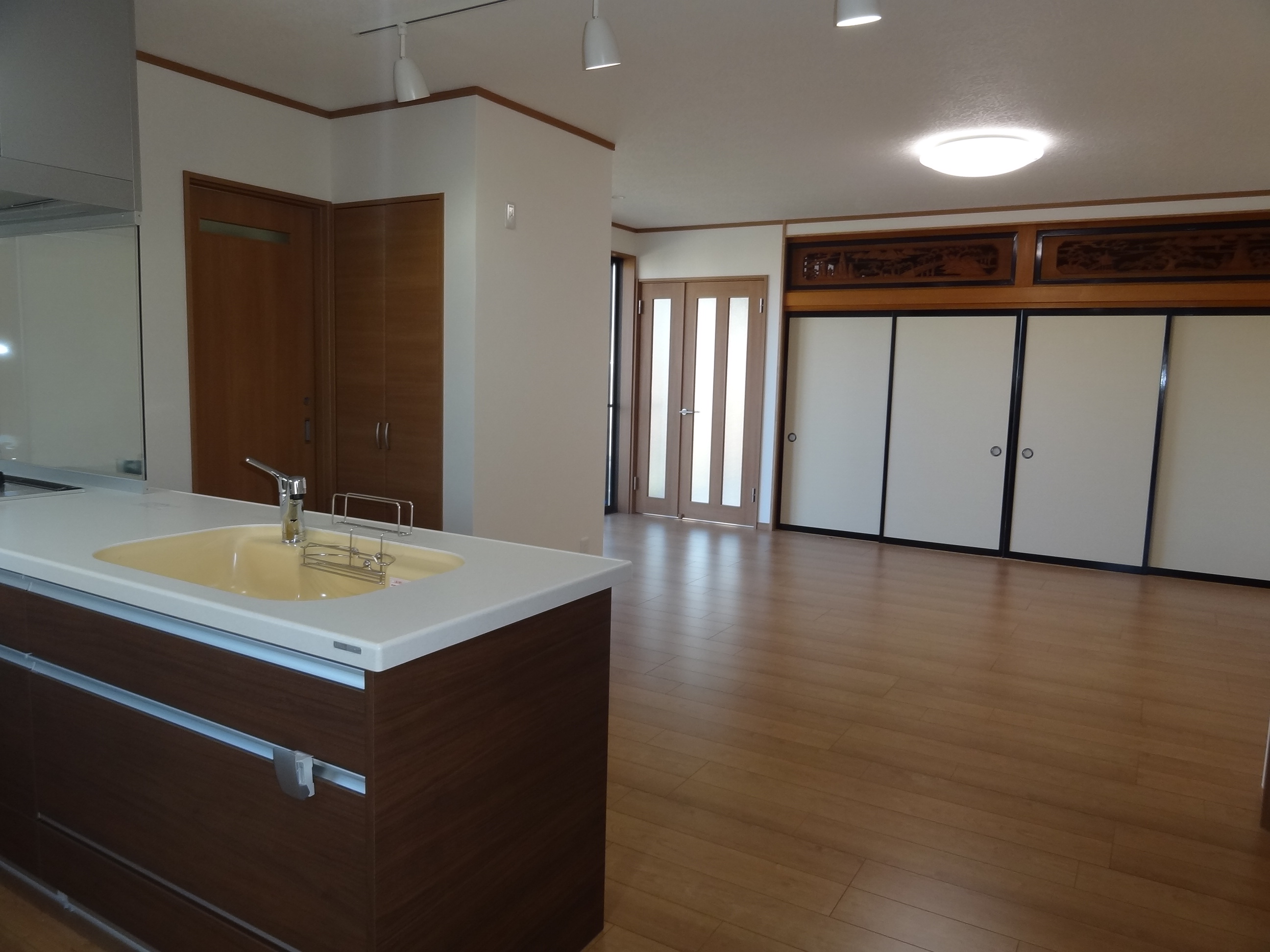 台所と和室を改装して広々としたLDKにリフォームしました。残した仏間との間仕切りの襖はそのまま張替えただけで再利用しています。襖の上の欄間もきれいに洗って元に戻して、リフォーム前の面影を残しました。