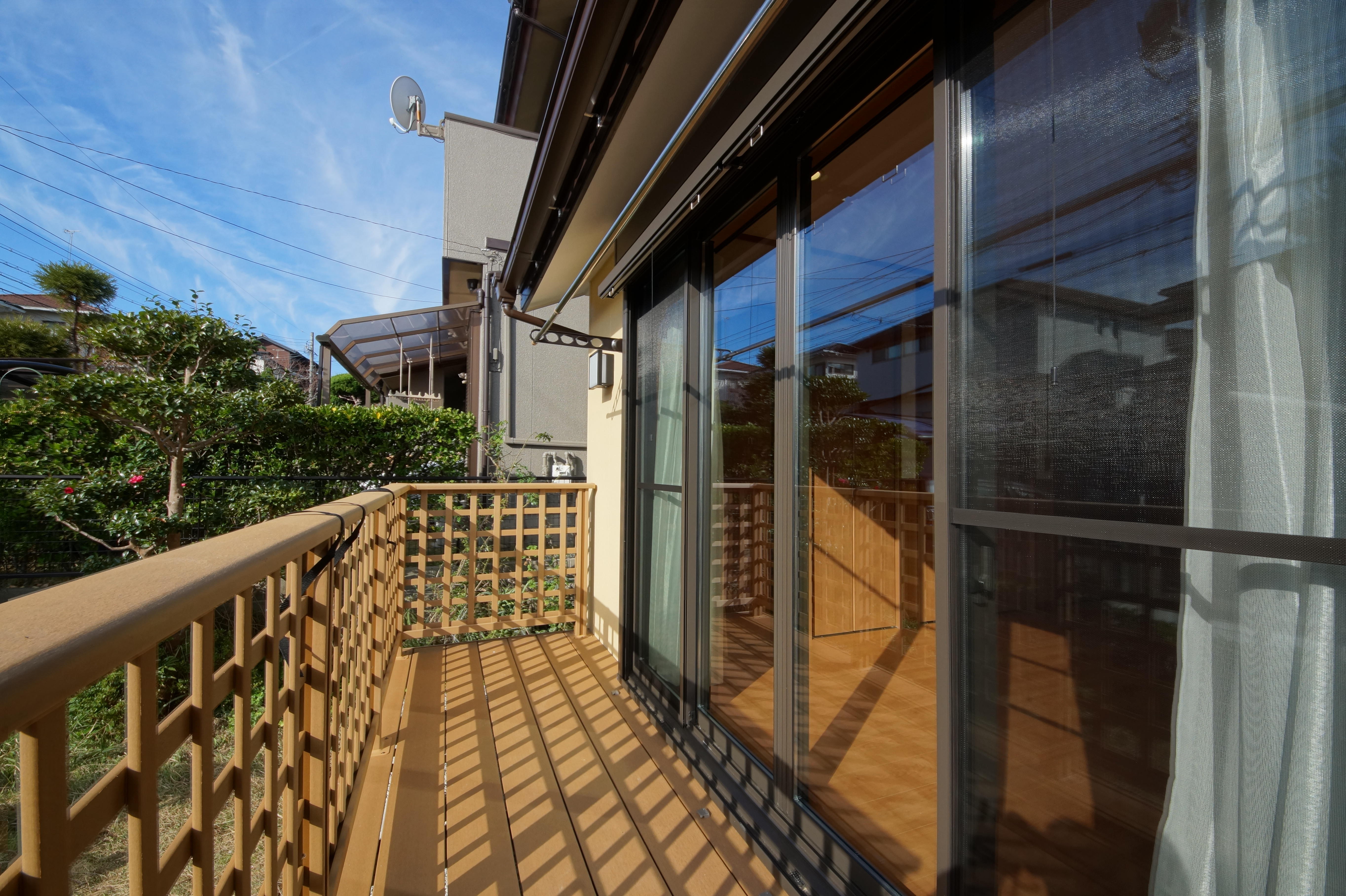 将来的に、外で日向ぼっこをしたり窓を開放してゆったりと本を読んだりして過ごしたい、とご要望がありました。ウッドデッキを新設し、物々しい塀などで目隠しを造るのではなく、風を感じながら外からの視線を遮ることのできるスタイルシェードを設置しました。