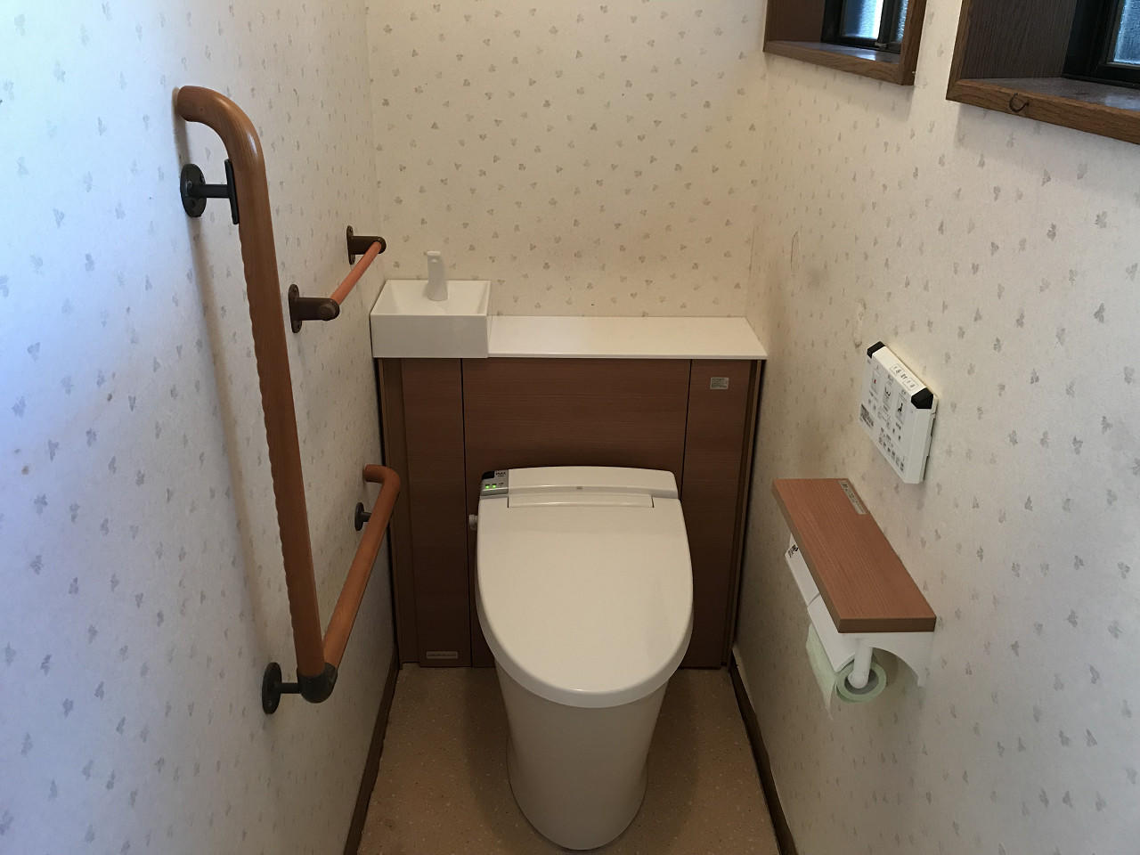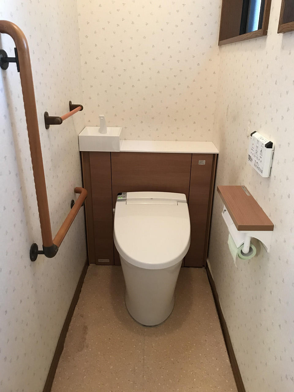 大規模なリフォーム工事が必要なく便座を取替えるだけの「リフォレ」でトイレの印象が変わりました。タンクや給水管を隠したすっきりとした見た目だけでなく、掃除のしやすさもアップしました。手洗器をコーナーに配置しているので、来客時の使用にも対応できます。