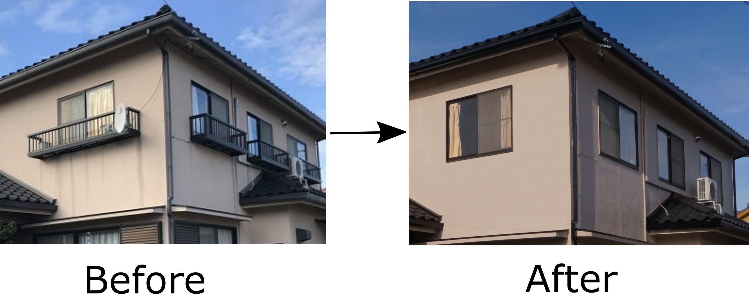 新築時から付いている腰窓の手すり兼プランターボックスの取り付け部の外壁にヒビ割れがあり、そのヒビは年々少しずつ拡がっていたので、この機会にすべて撤去することになりました。ヒビ割れを補修することで、今後の雨漏りへの心配事が無くなりました。