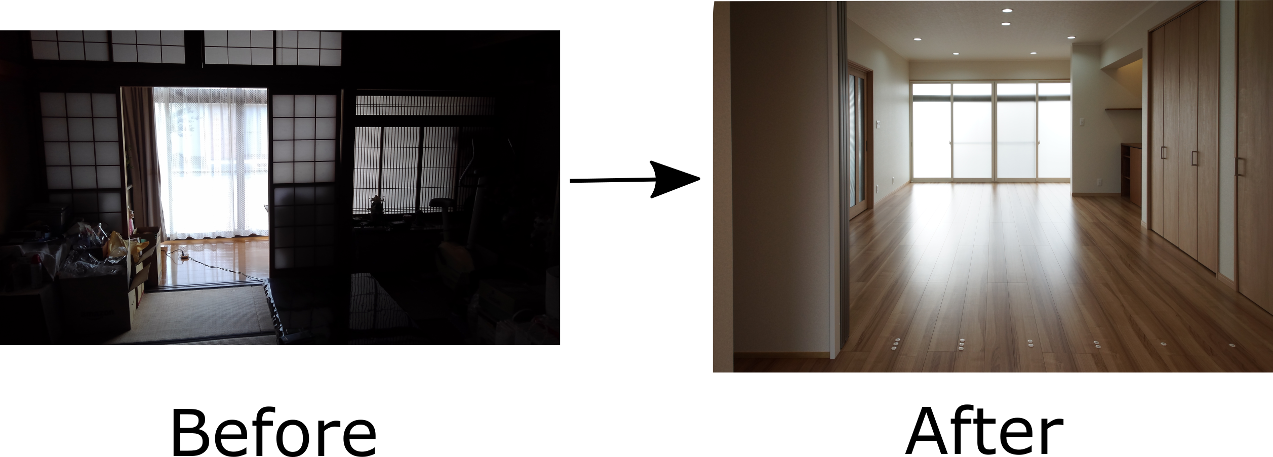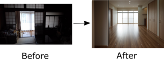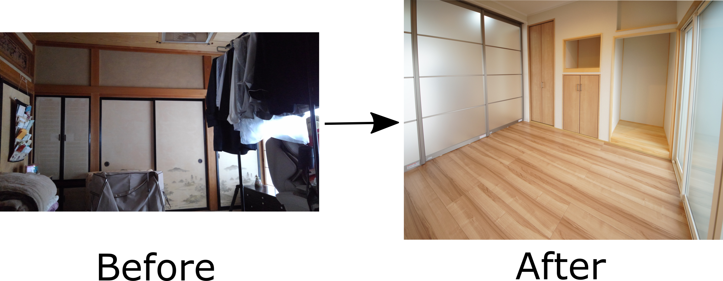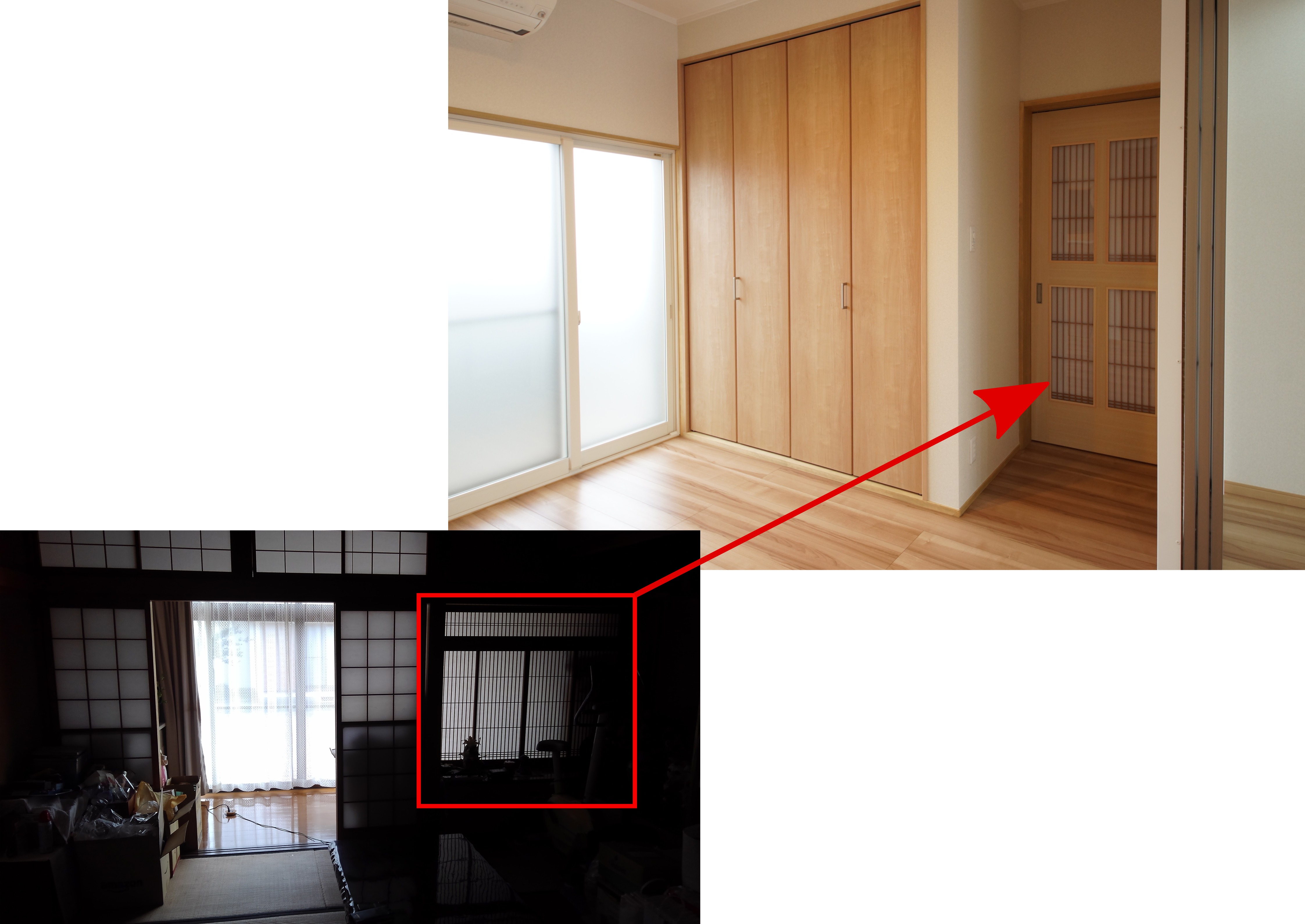 すっかり雰囲気の変わった部屋ですが、実は部分的に以前のお部屋の名残を残しています。奥の部屋の建具には、広縁との間にあった障子を組み合わせて和洋折衷に。フローリングの洋室でも、ユニット畳を敷いた和室でも、どちらにも合いそうです。