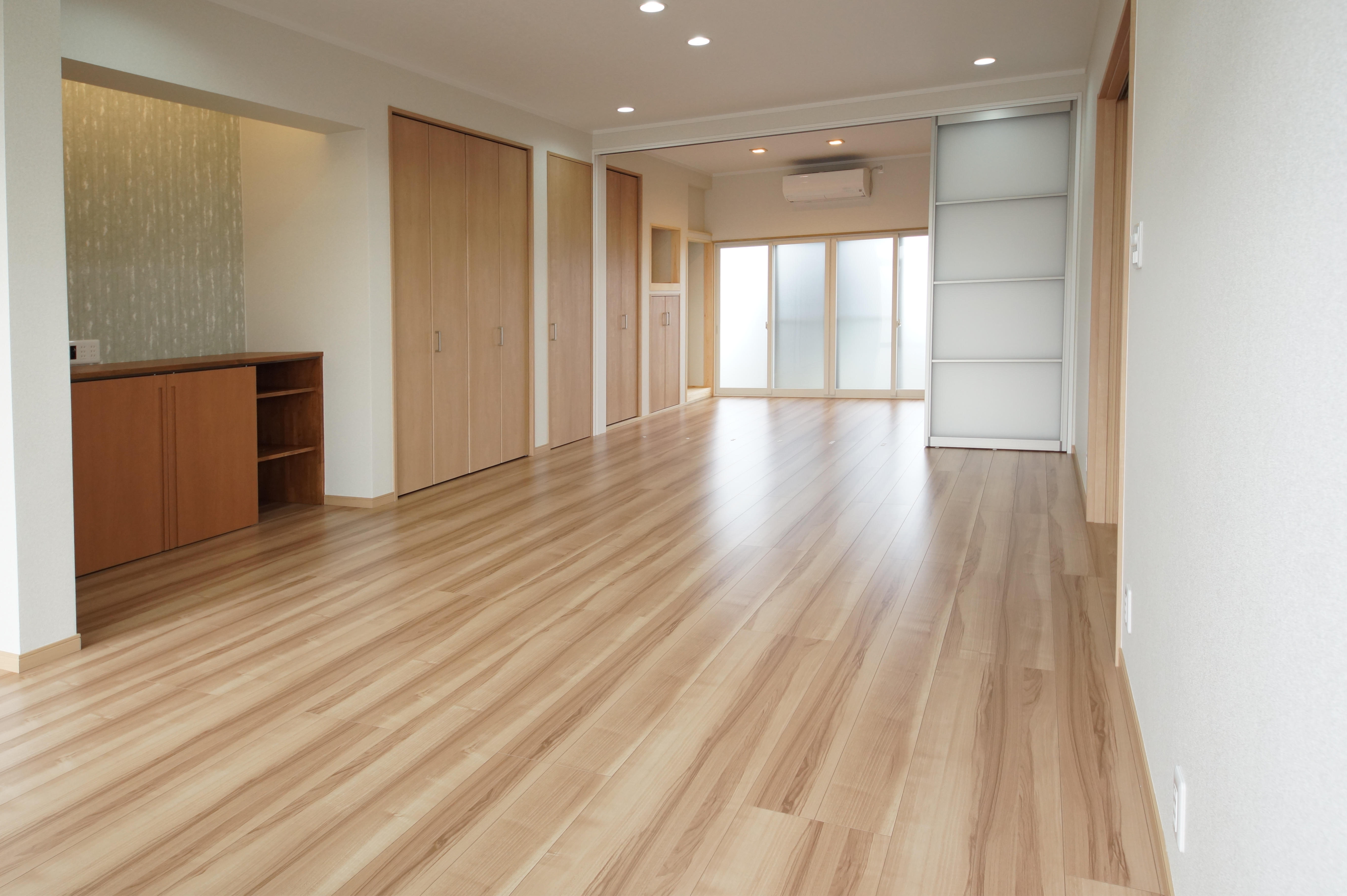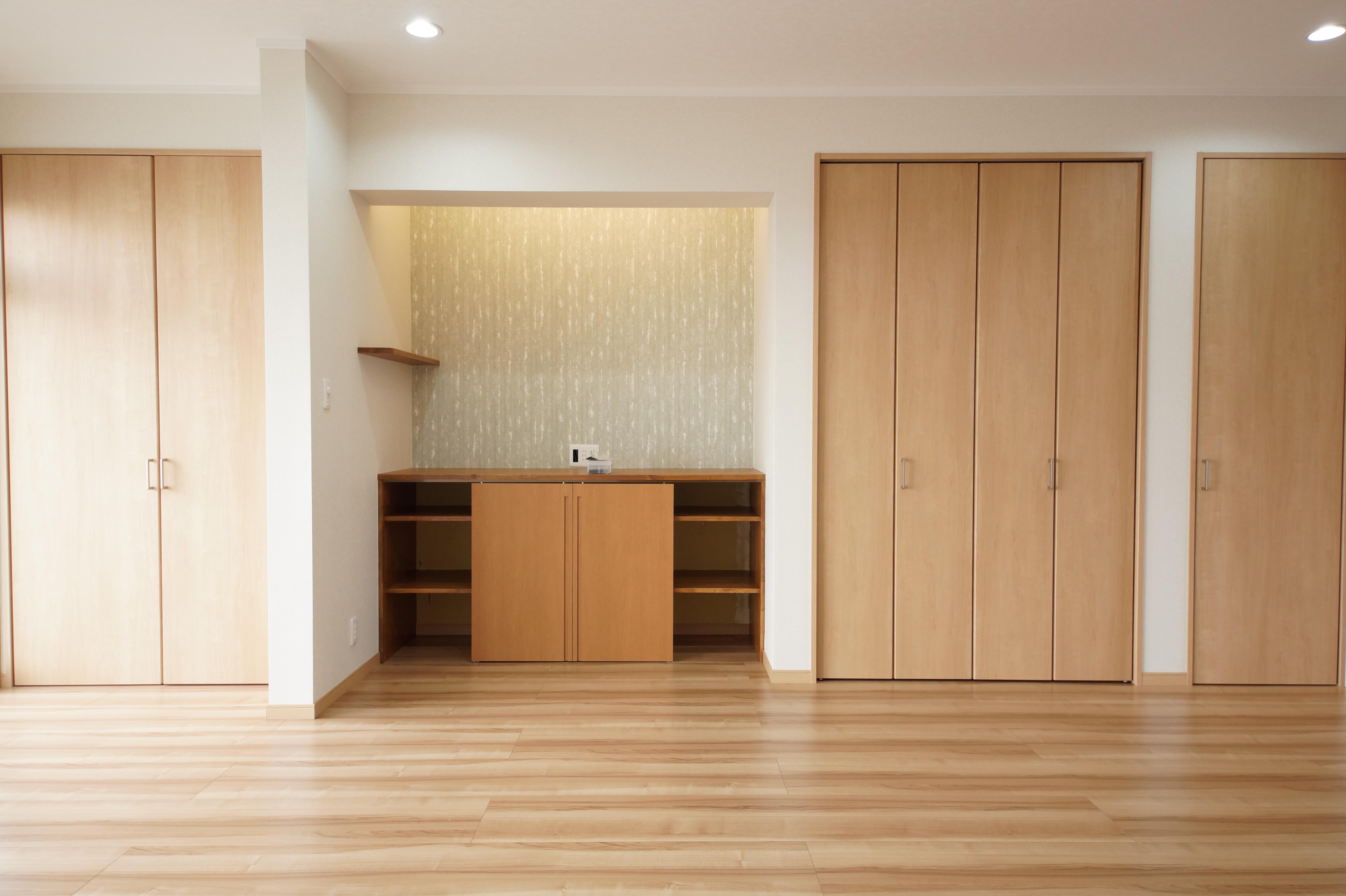 奥の部屋は引戸で間仕切ることもできます。閉めても暗くならないように、半透明の引戸を採用。また、ユニット畳を敷いて和室としても使えるように、収納は床面より少し上げて設置しています。