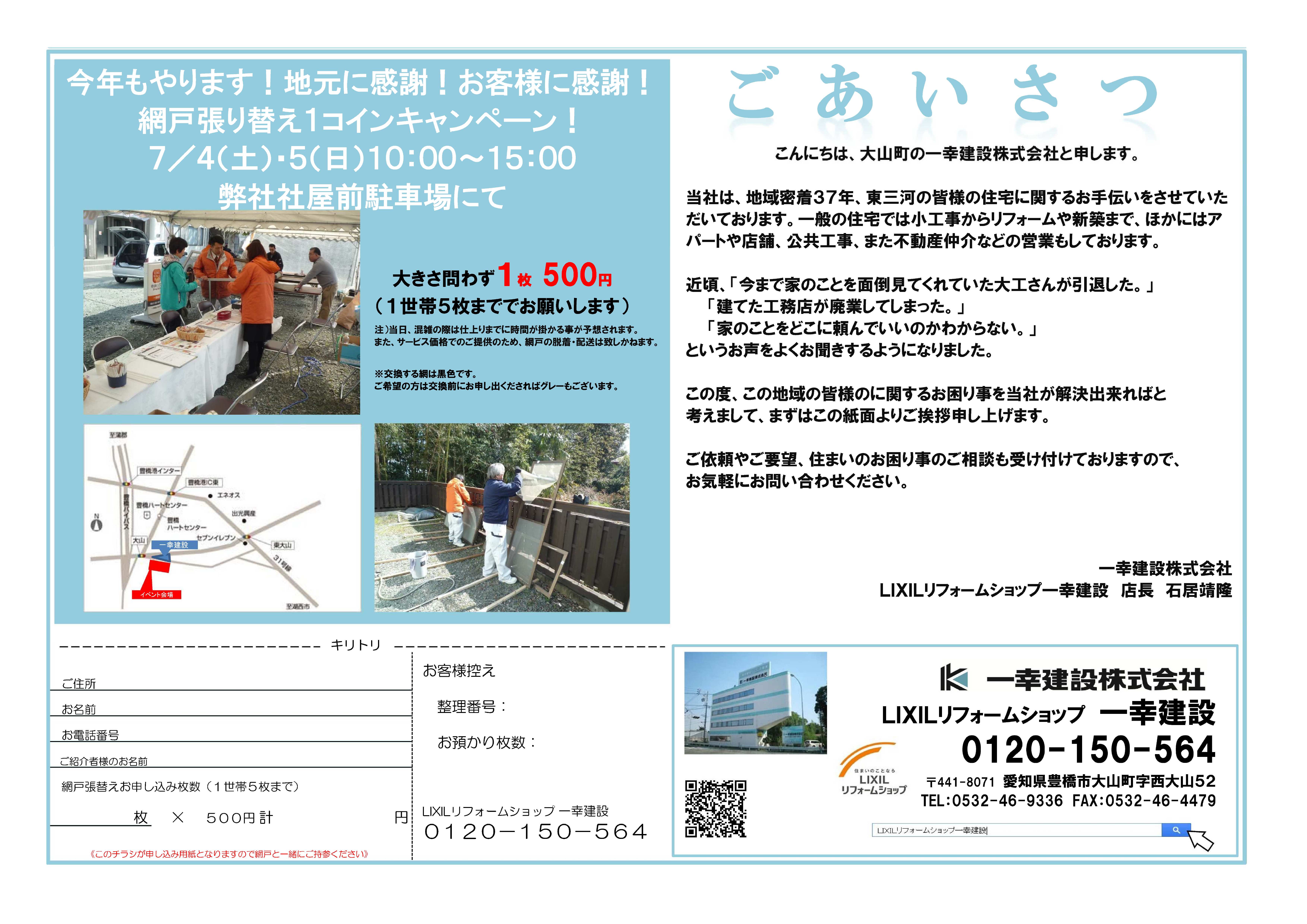 弊社では年に2回 ’’網戸張替1コインキャンペーン’’ と題しまして
