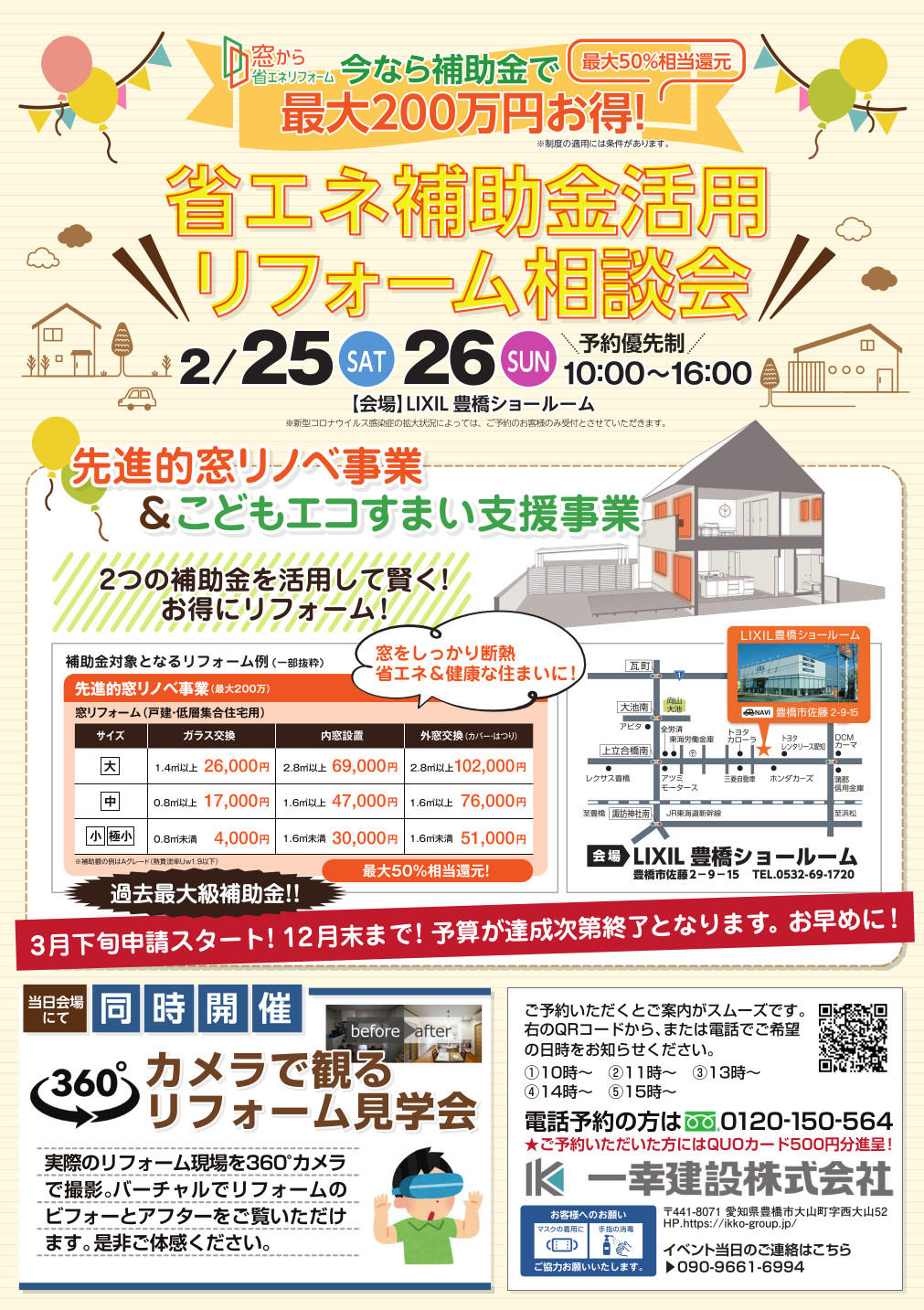 2/25(土)・26(日)に『省エネ補助金活用リフォーム相談会』をLIXIL豊橋ショールームで開催します。
