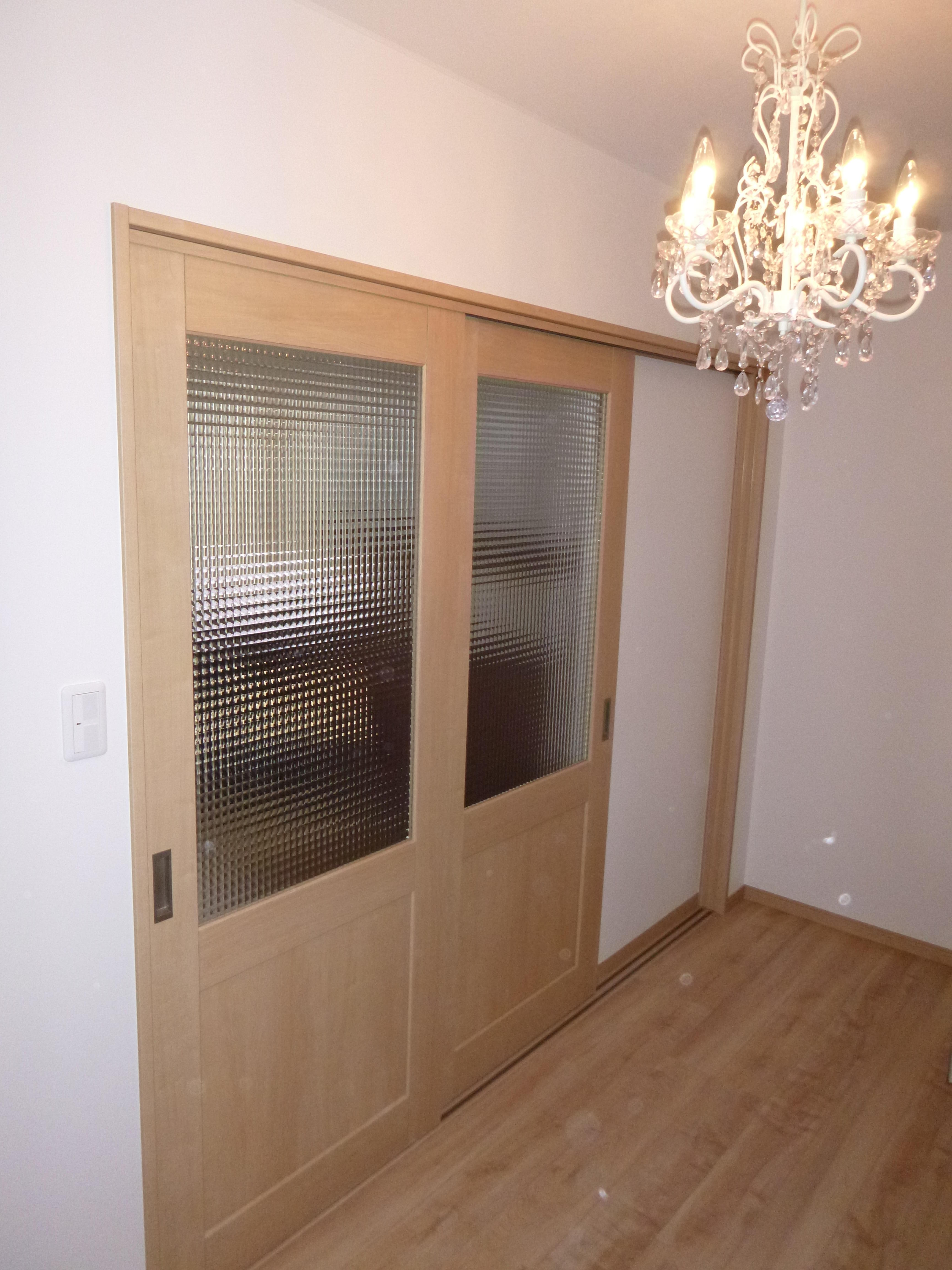 玄関ホール大人かわいいシャンデリア。リビングにつながる引き戸のガラスはおしゃれなチェッカーガラス。