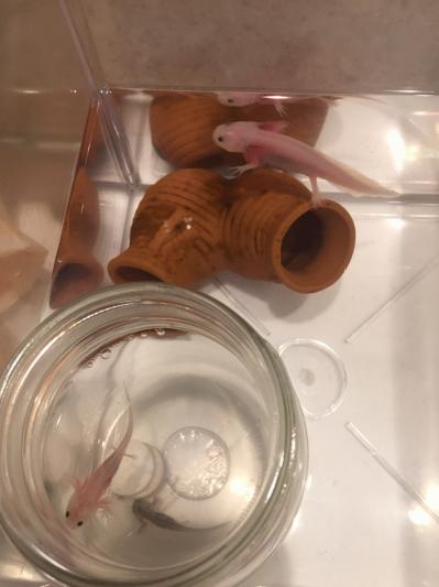 愛くるしい子です。そして、共食いの心配もあるのでビンの中にいる赤ちゃんたちも手足も生え固形のエサも食べるようになり元気に成長中です。