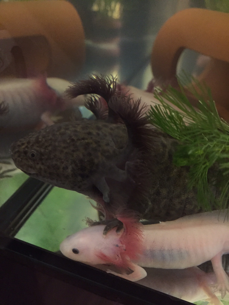 そして我が家のウーパールーパーちゃん、一番のおチビちゃんも大人たちと同じ水槽にいれてみました!!