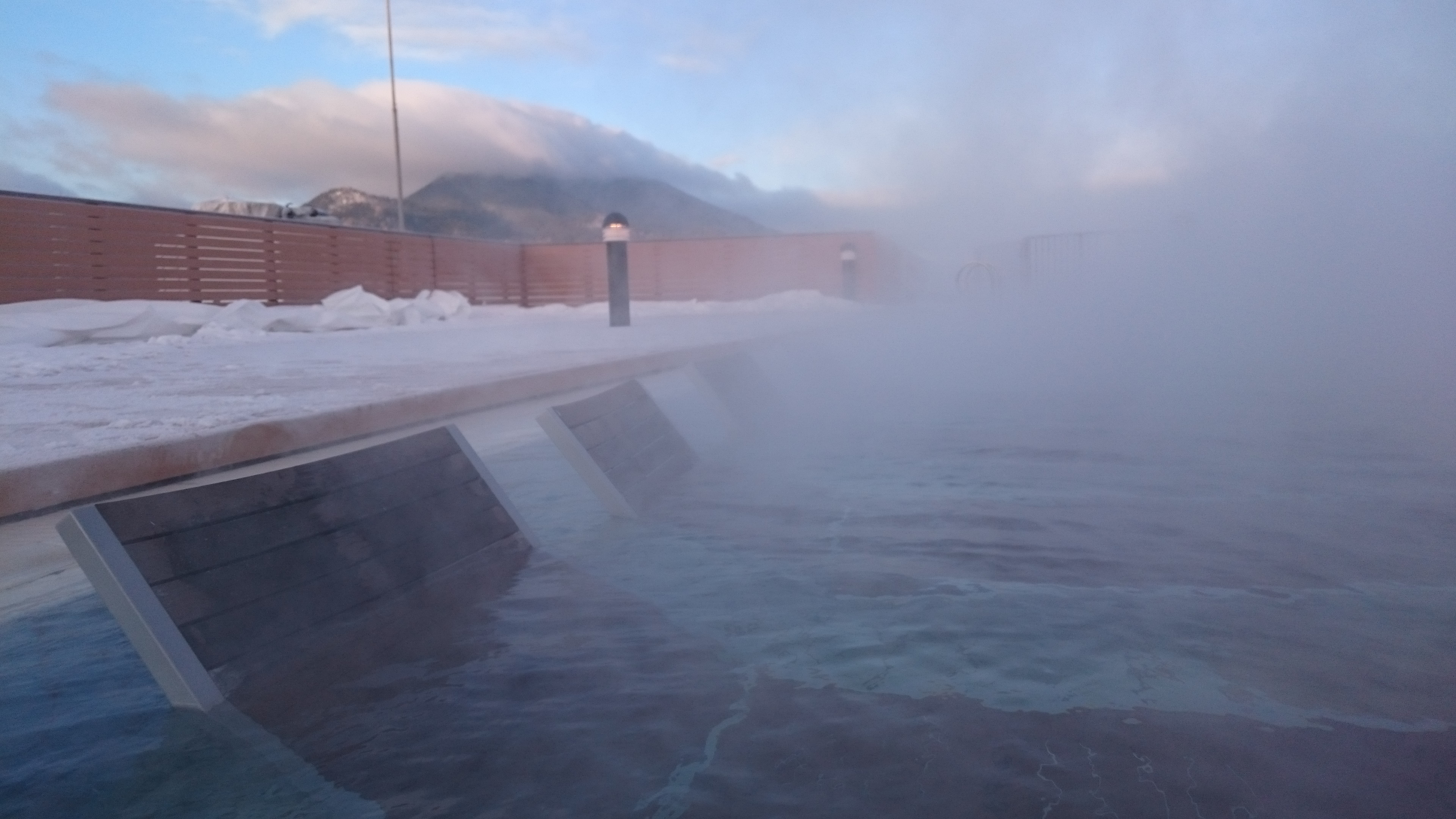 この前、阿寒湖畔のホテルの屋上温水プールに行ってきました。この寒い中でしたが、プールといっても温泉でしたのでとっても気持ちのいい感じで、