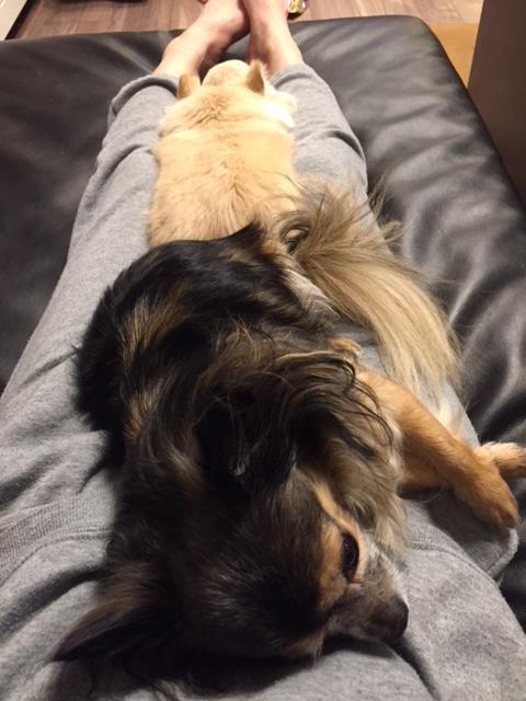 我が家の愛犬パールとマックですが、、、私がソファーに座ると「待ってました♪」と言わんばかりに