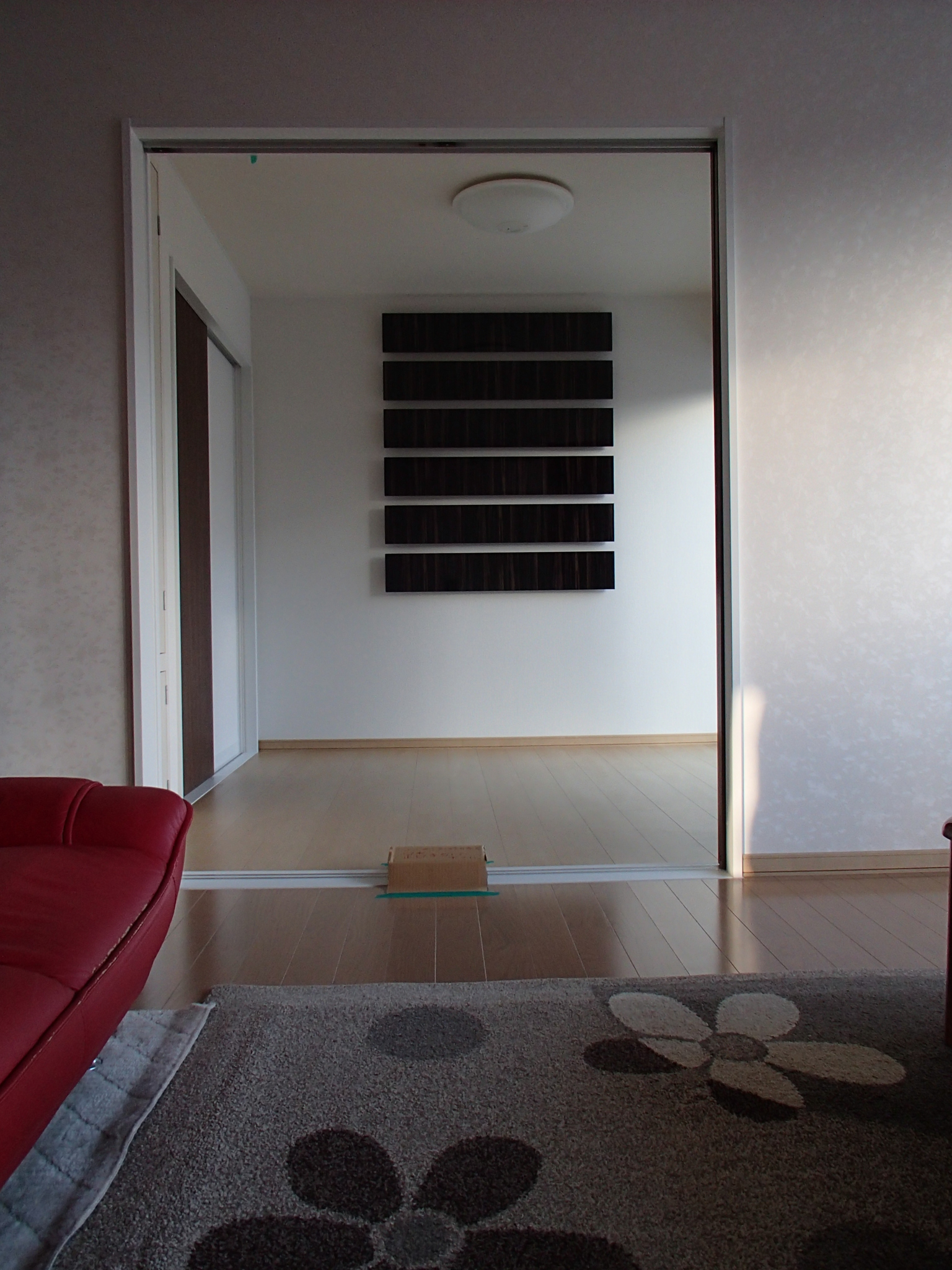 居間に隣接する和室が1段高くなっていたので、フラットに。 奥に見えるのはちょっとした物を掛けられる棚です。