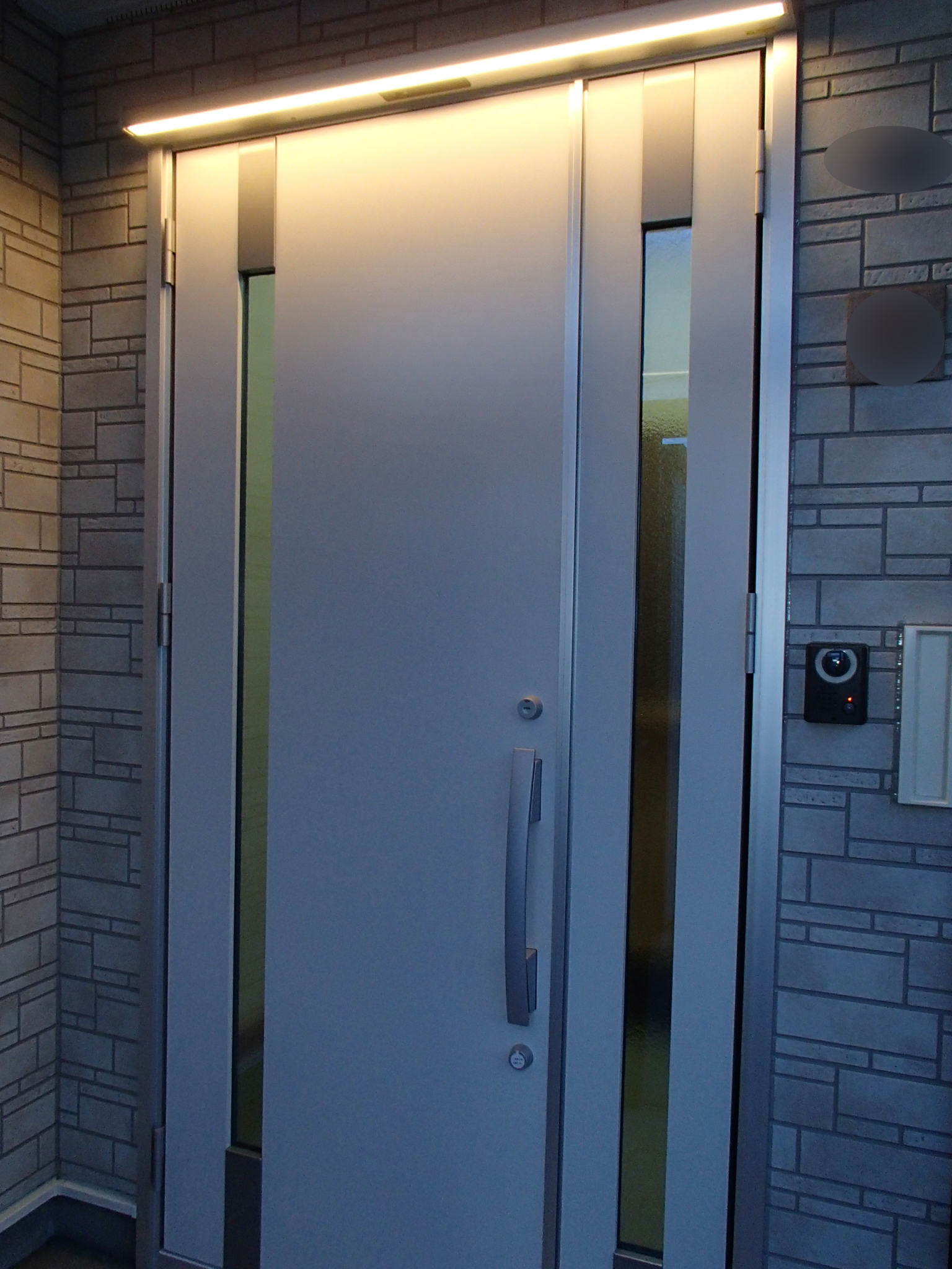 既存はアルミの玄関ドアでした。 LIXILの断熱玄関ドア、ジエスタと専用LED照明を取り付けました。 明暗センサー、人感センサーがついて、夜になると玄関をかっこよく照らします。
