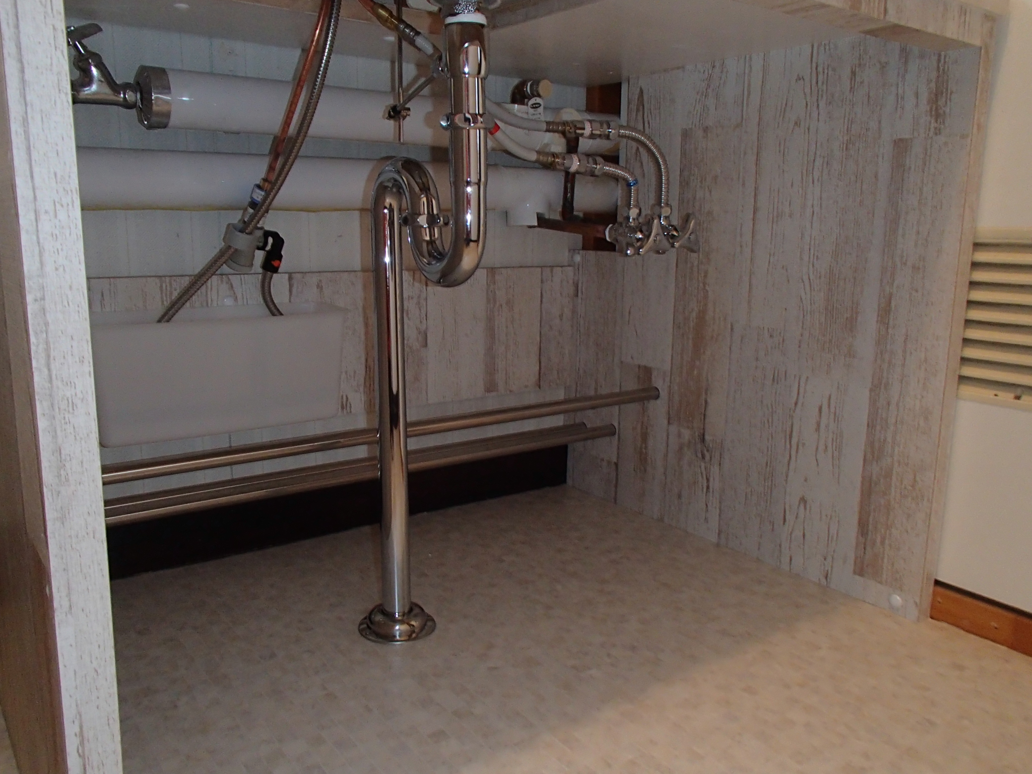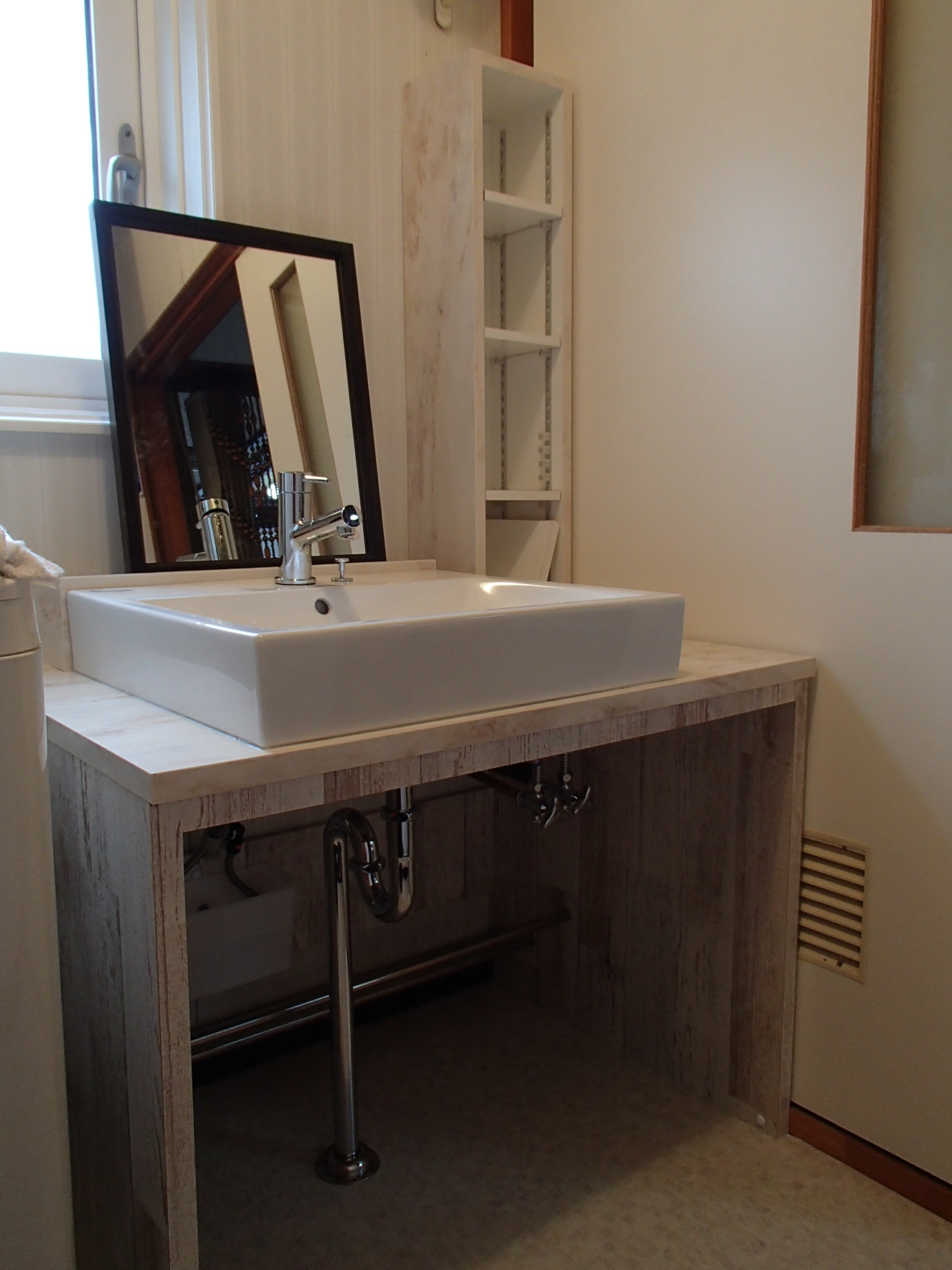 椅子に座って洗髪できる洗面台を、とのご要望でした。配管が通っていたため、既製品ではなく造作しました。収納はステンパイプで確保しています。