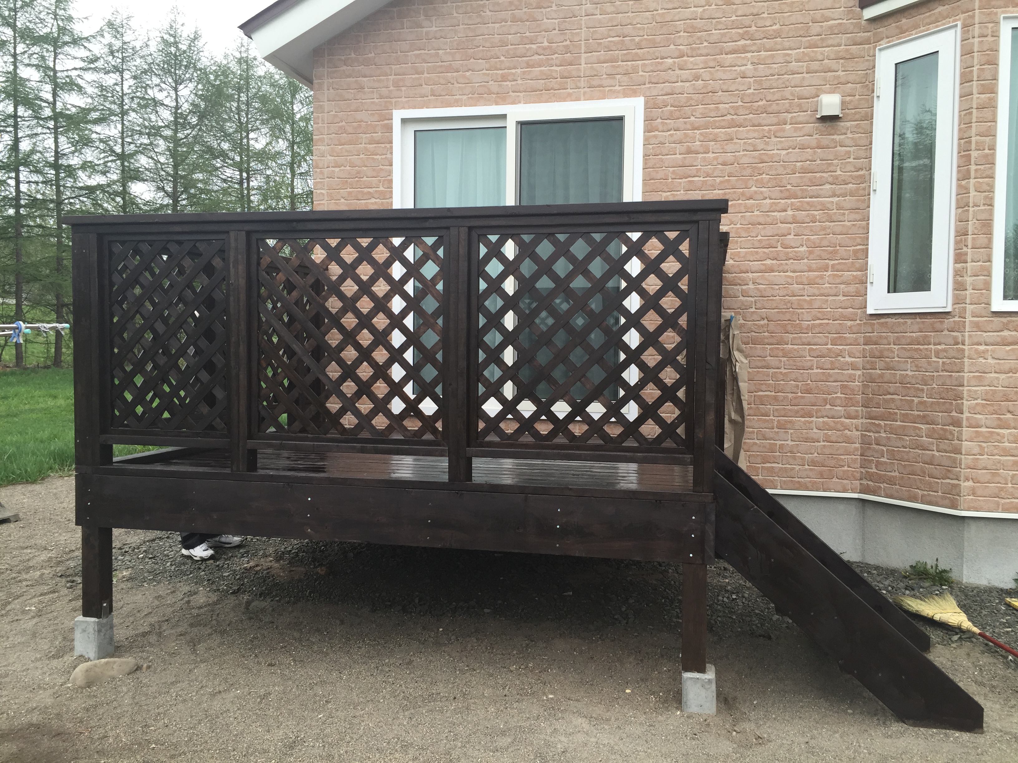 バーベキューや洗濯物干しに!使い勝手の良いウッドデッキが、たった二日で完成します。寒冷地特有の地面の凍結も考慮し、足となる束石にもしっかり断熱材をまきました。