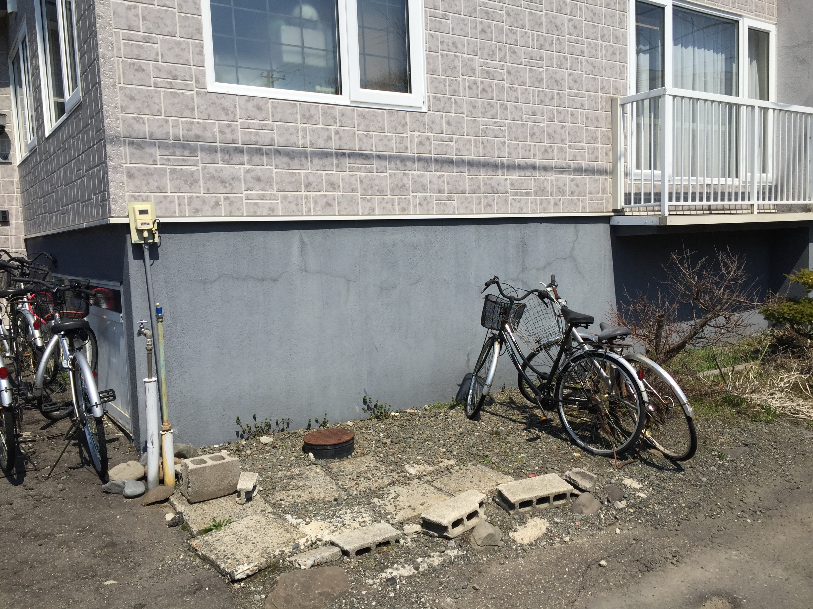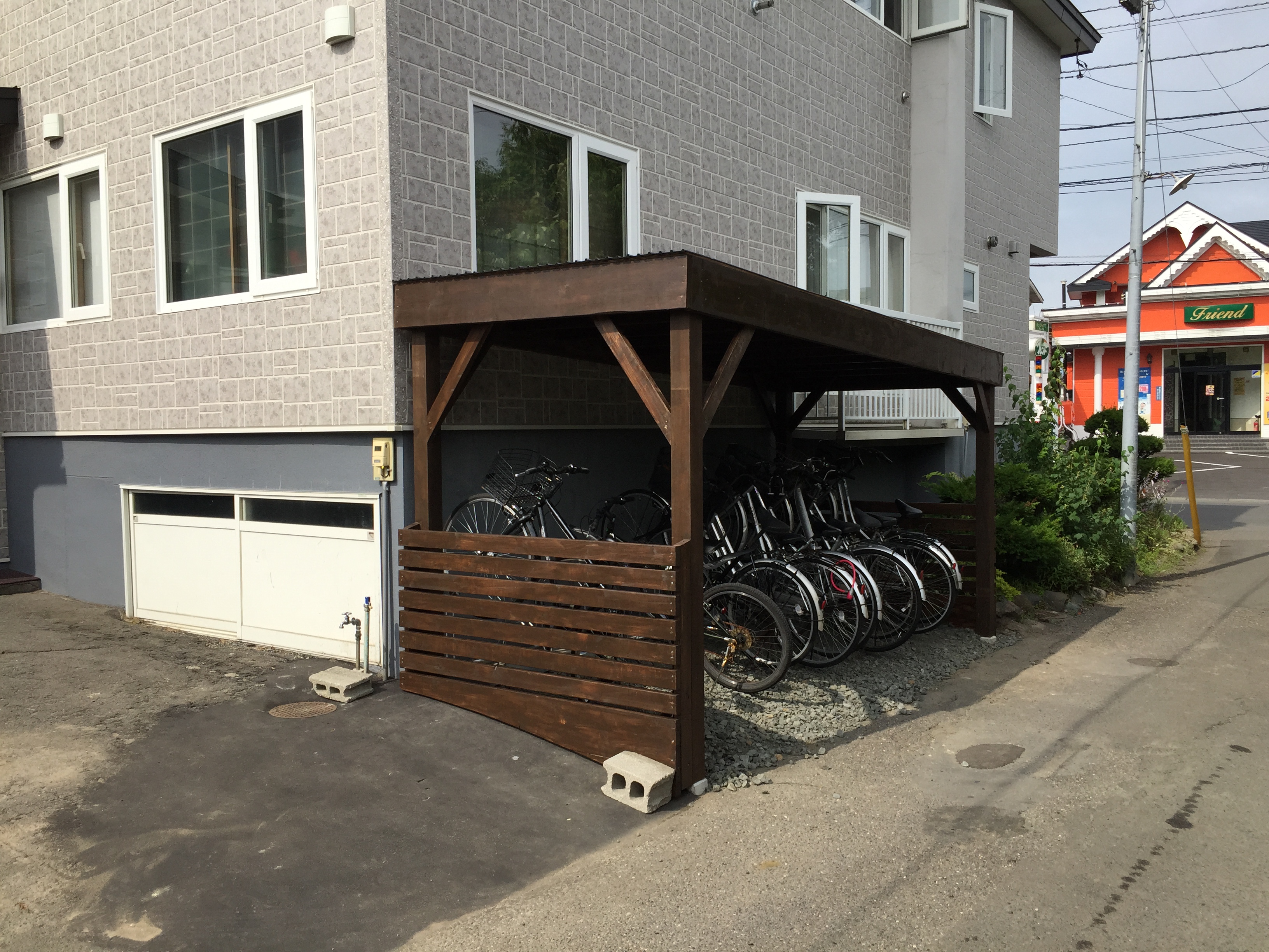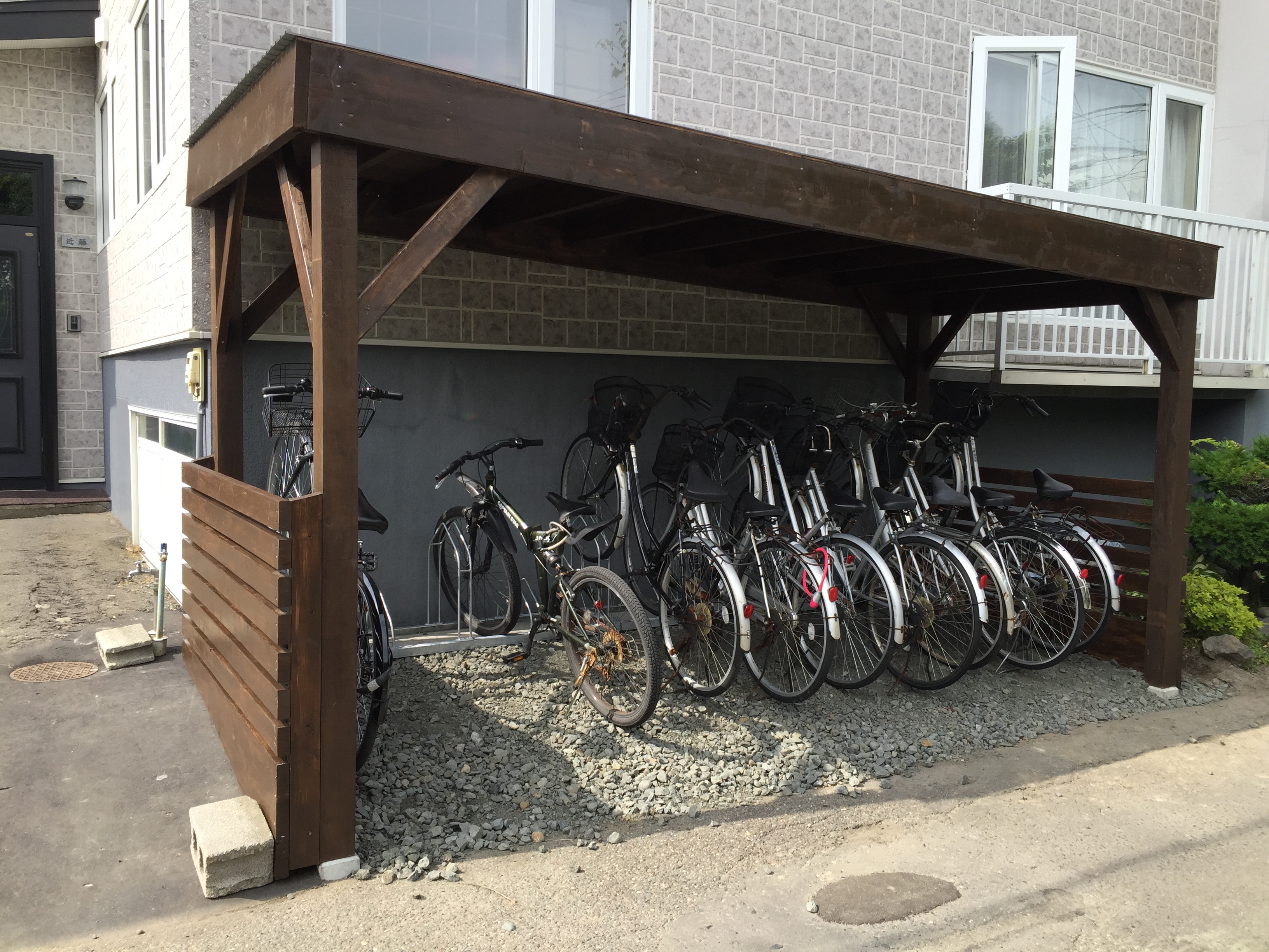 地面を路盤改良し、束石の上に防腐塗料を塗った木材で組みました。地面にRC板を置き、その上に既製品のサイクルスタンドを加工し取り付けました。