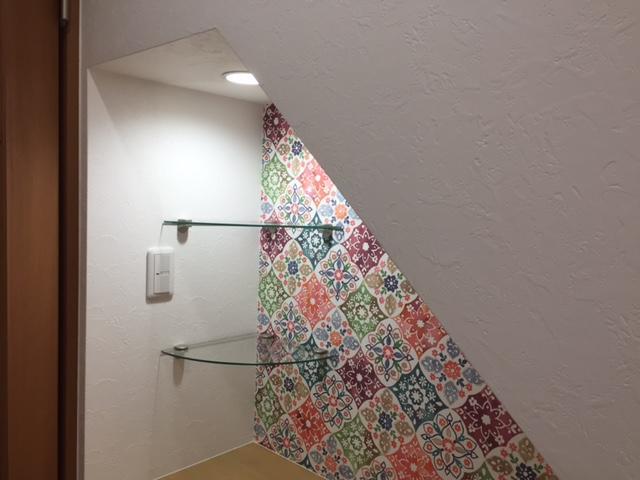 階段下を有効活用おしゃれに演出。下は収納になっております。上部はガラスの棚と照明を取付しインテリアコーナーに仕上げています