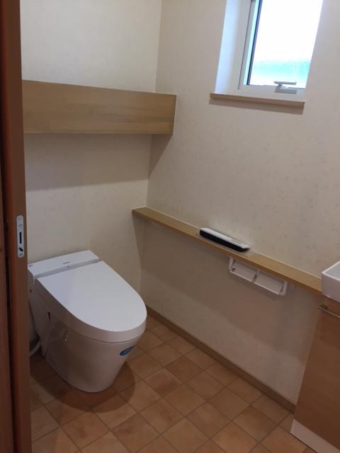元々広々していたトイレスペース。タンクレスのトイレに手洗い器を取付しても広々としております。色合いもナチュラルに仕上がっております。各部屋ともに奥様のセンスが光るチョイスでした