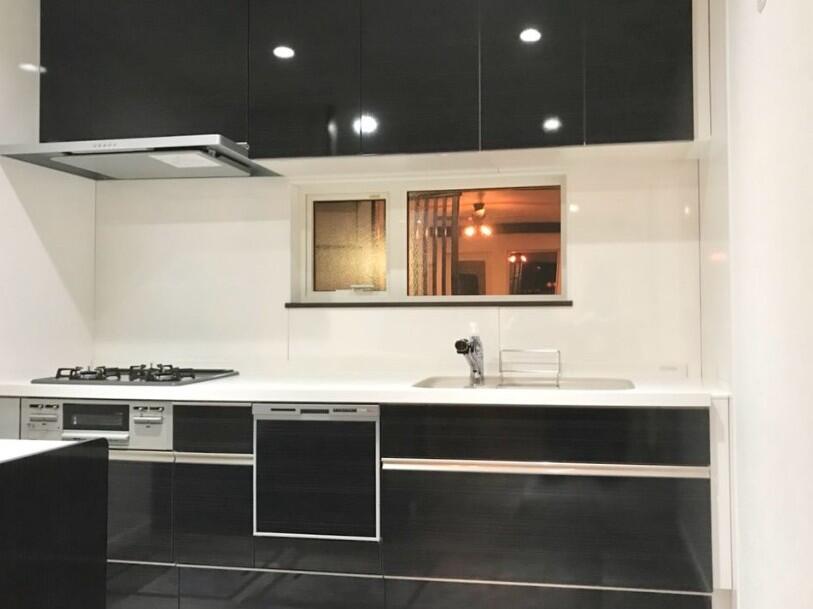 流し台中心のキッチンから、収納一体のシステムキッチンへ刷新しました。 ブラック×ホワイトでトーンを整え、空間が引き締まった印象に。 見た目のスッキリ感だけでなく、調理も片付けも動きやすいキッチンになりました。
