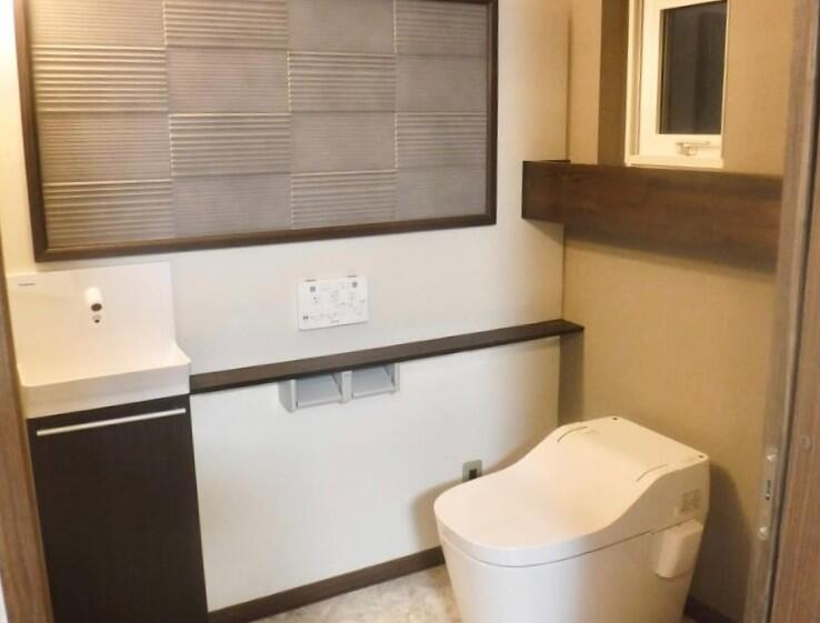 設備を新しくするだけでなく、壁面にエコカラットをプラス。 デザイン性はもちろん、トイレで気になりやすいにおい・湿気への配慮にもつながる施工です。 すっきり美しく、心地よさまで整ったトイレ空間になりました。