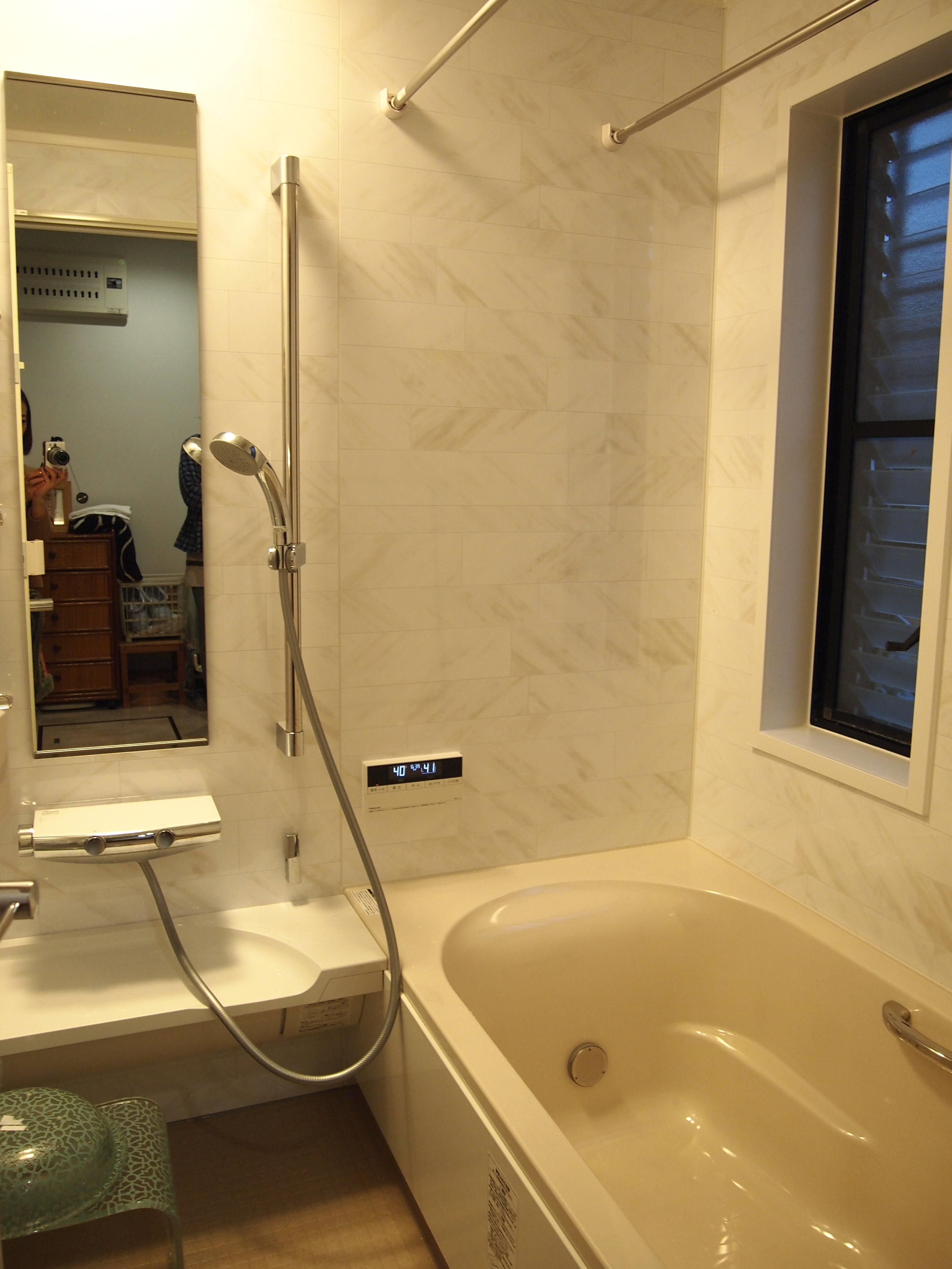 1階はCMでもおなじみのネオレストにされました。新しいネオレストはデザインも美しく、惚れ惚れします。壁もクロスではなく、お手入れのしやすいTOTOの壁パネルグラビオを使いました。床のフロアタイルとコーディネートしています。2階は背面に木目のカウンターのついたレストパルにされました。