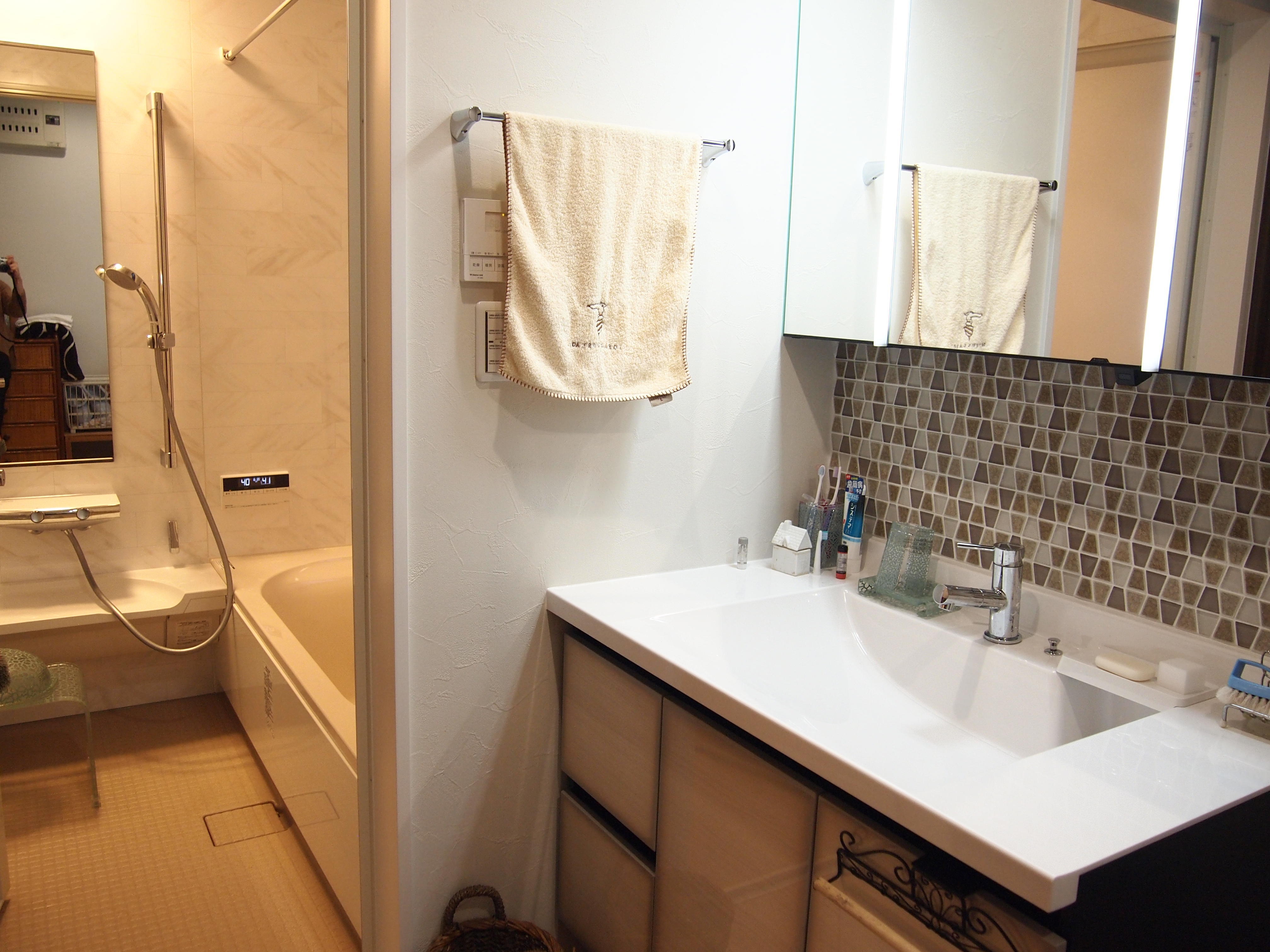 ユニットバスはLIXILのアライズにしました。お風呂は断熱材で覆われているサーモバスなので、寒い冬でも、お湯が冷めにくくなりました。ベージュカラーでお風呂と洗面化粧台をコーディネートしました。