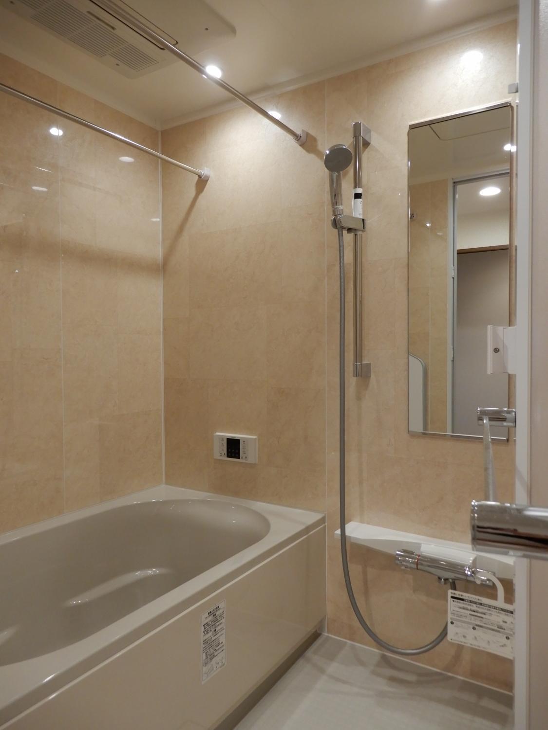 落ち着いた色のタイルと浴槽のLIXILアレスタを