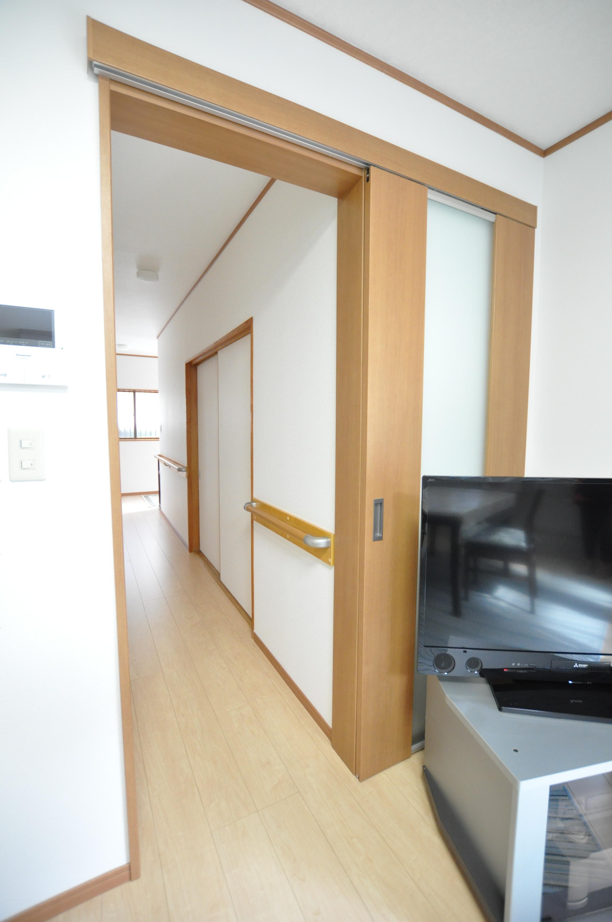 キッチンの取替とバリアフリー工事をさせていただきました。 白い壁紙と明るい色の床でお部屋が広く感じられます。