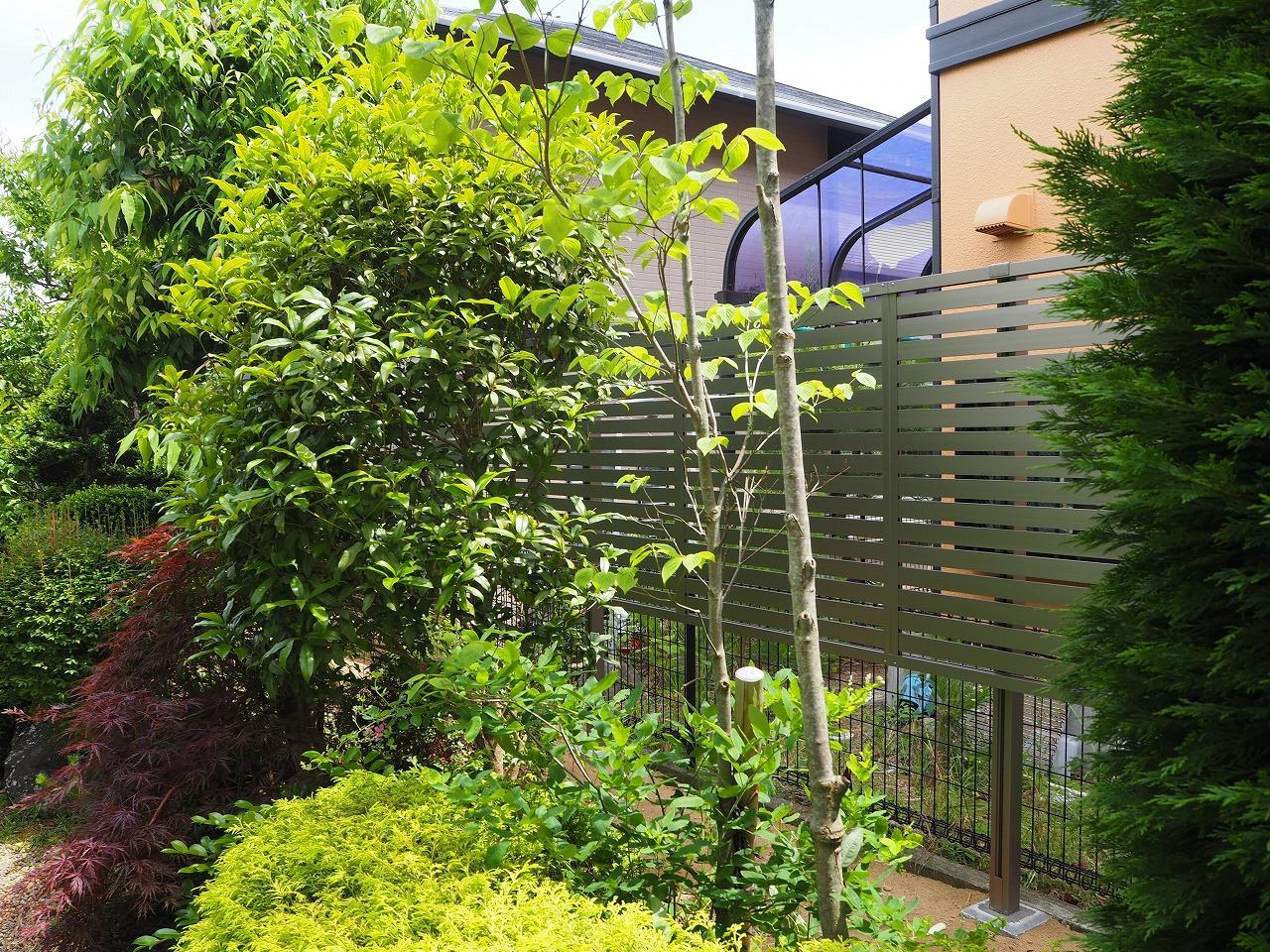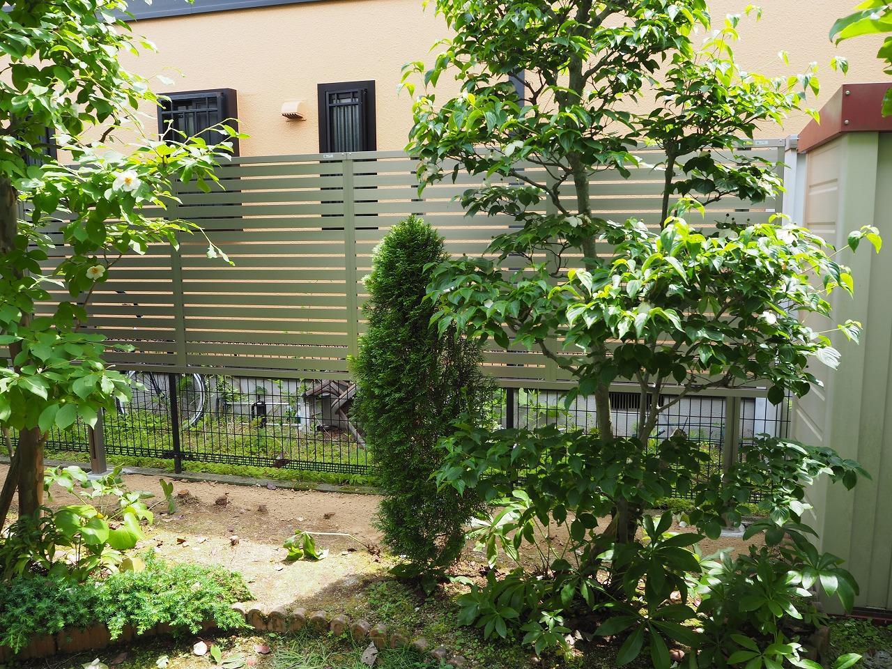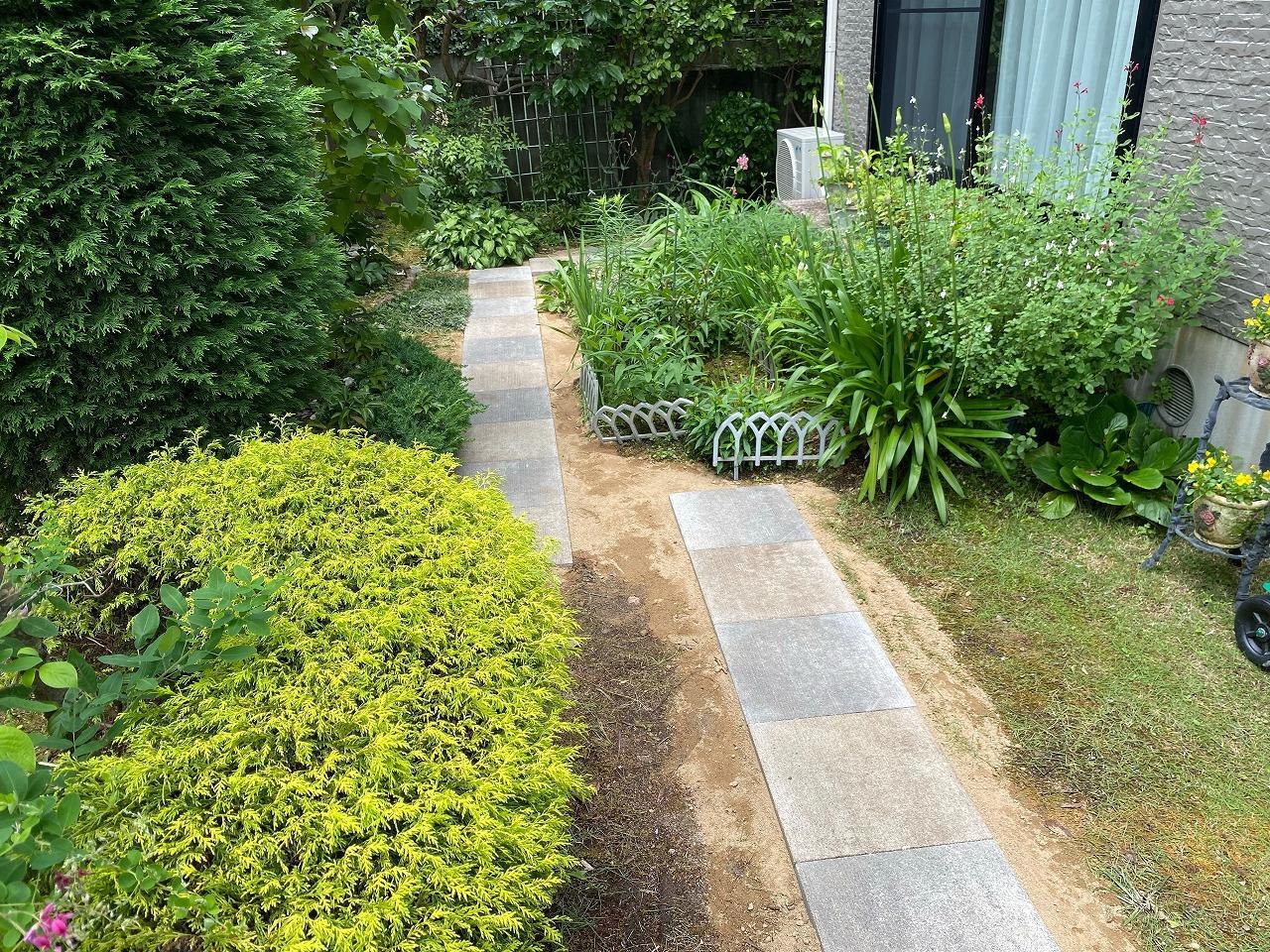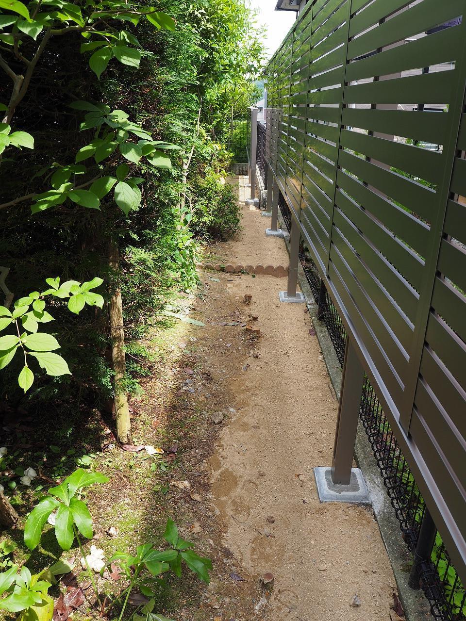 お庭のリフォームをさせていただきました。 「隣地との境に目隠しで生け垣を植えていたが、隣に葉っぱが落ちてしまうのが長年の悩み。」 「通路に敷いていた枕木が痛んで、足を引っかけてしまう事がある。」との事で 今回のリフォームになりました。