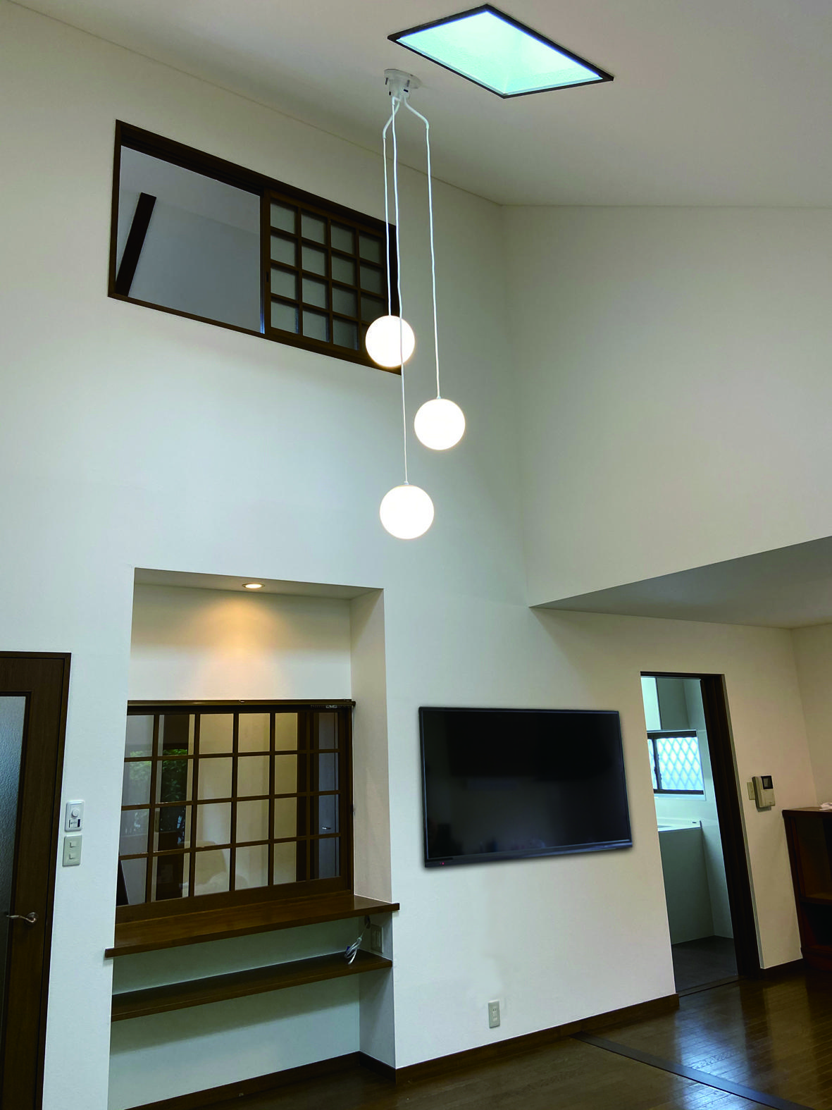 暗く感じていたリビングも真っ白なクロスの効果と、ダイニングとの間仕切り壁を取り払ったこともあって、明るく広いリビングダイニングになりました。 間仕切りなくなり、お部屋中央に壁掛けのテレビを付けられるということでしたので、リビングのソファーに座ってもダイニングの方から見れるような可動式のテレビ金具を取付ています。テレビの下には何も置かなくてよいように、隣にあるカウンターの棚を一段増やし、そこにオーディオ機器類を置けるよう提案させていただきました。 水回りも白を基調にされ、上品な雰囲気に仕上がり、お喜びいただいております。