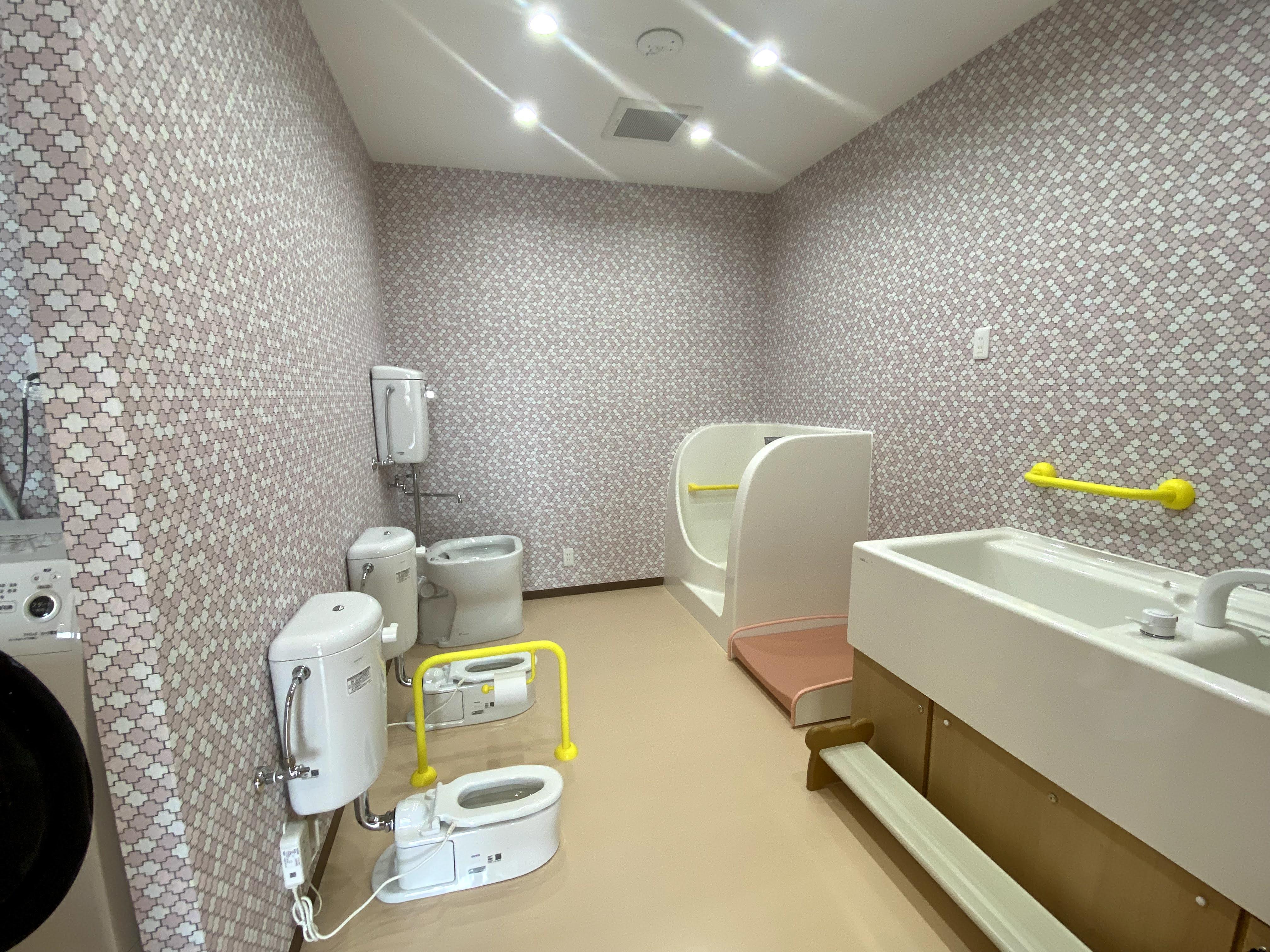 ピンクの壁紙で明るく楽しい印象のトイレ!