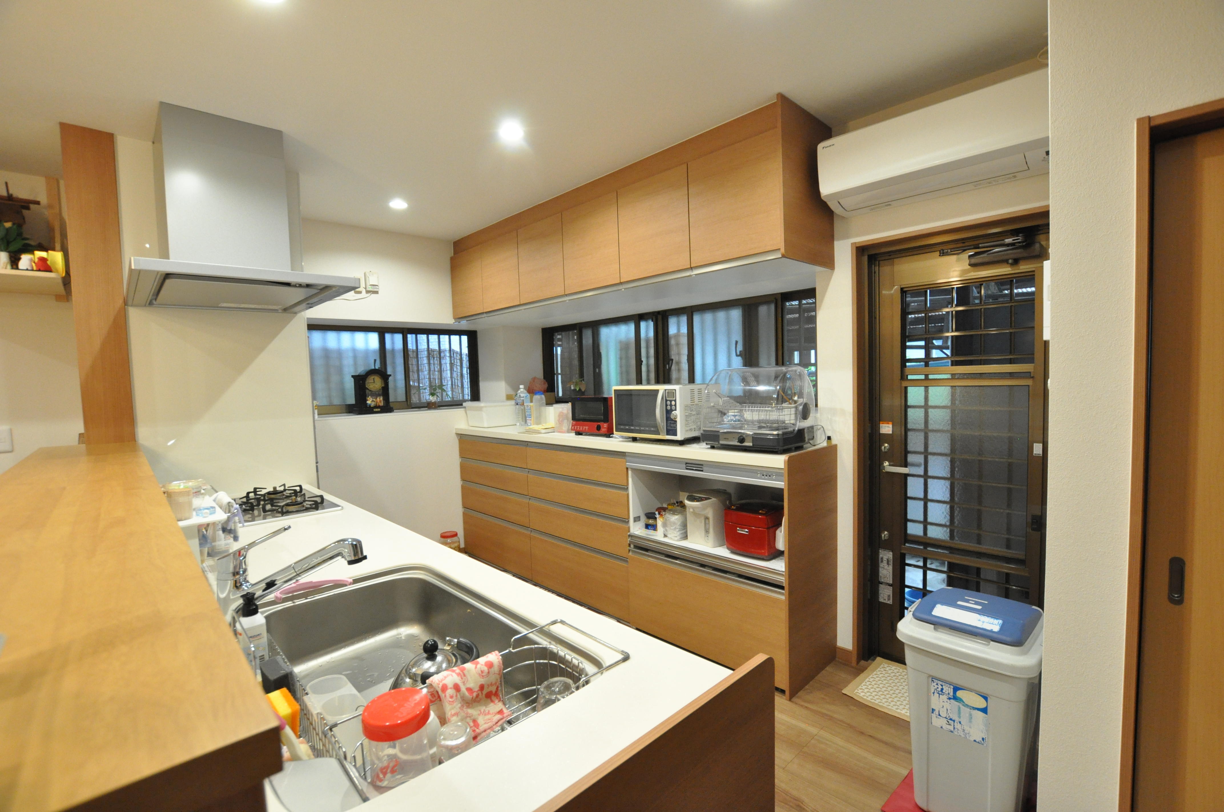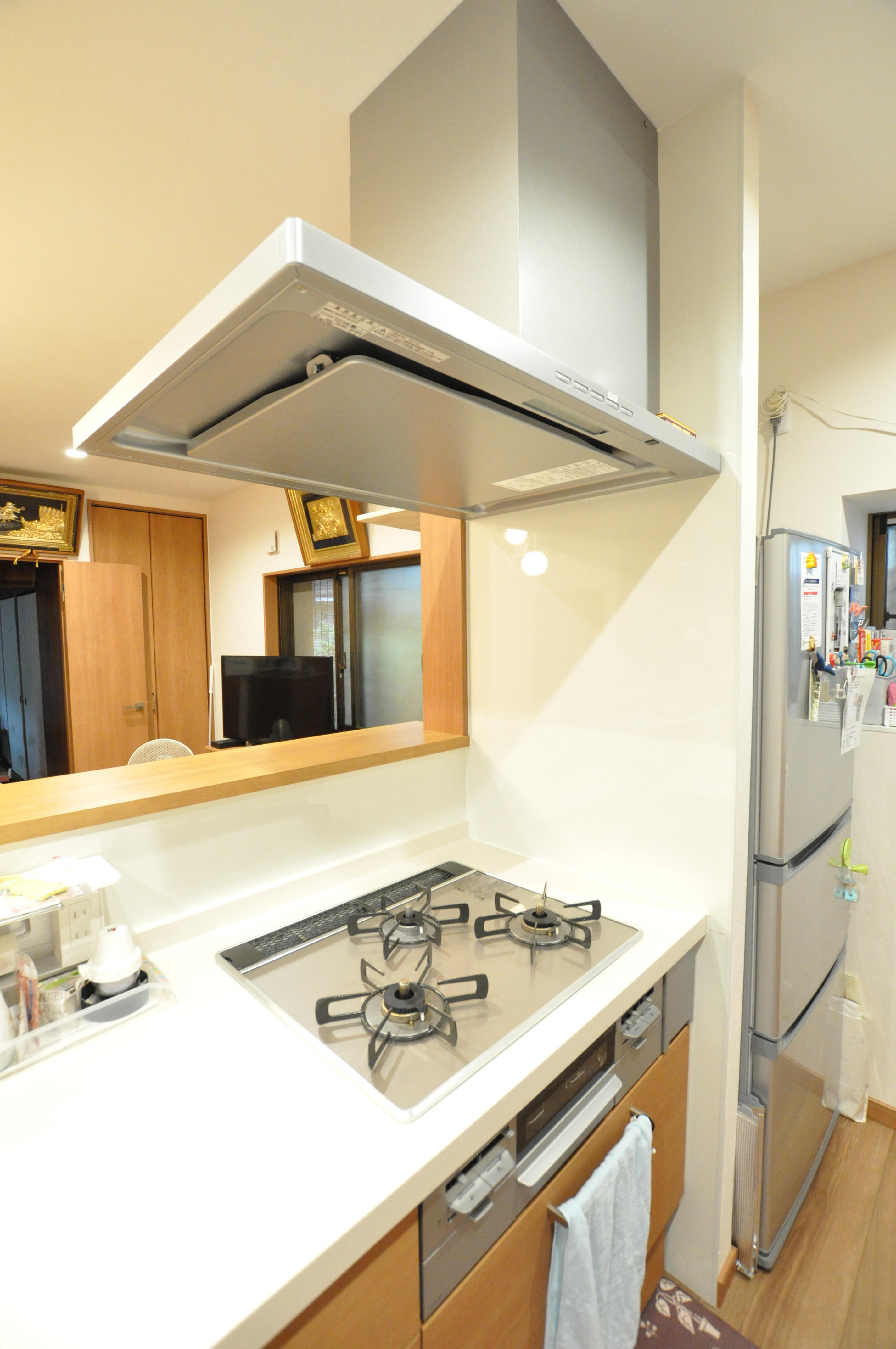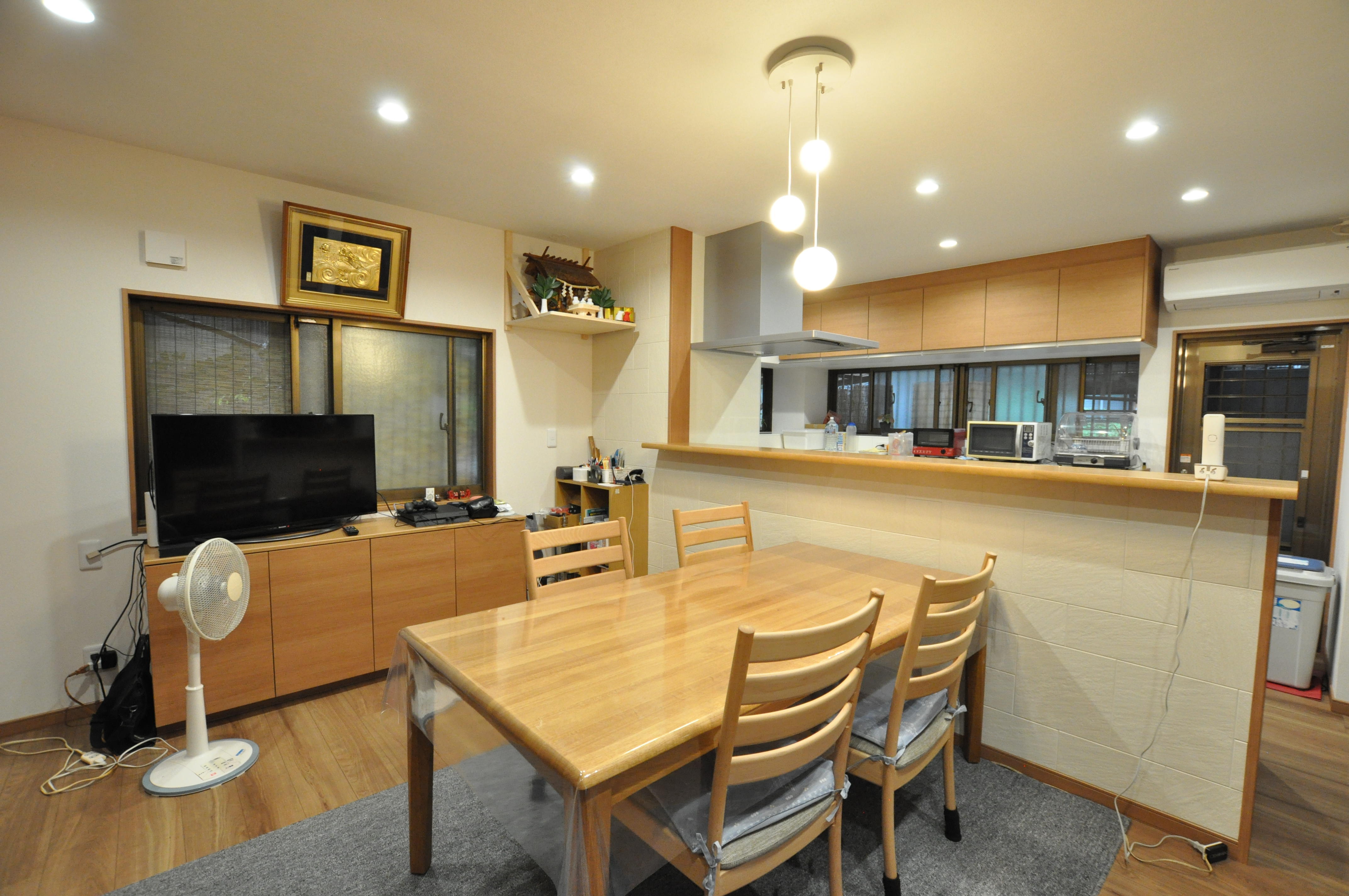 対面キッチンになったので家族も進んで配膳のお手伝いをしてくれます。掃除しやすくなった換気扇も主人に任せています。照明はプランナーさんに提案してもらい決めました。自分では選ばないデザインなので新鮮です!