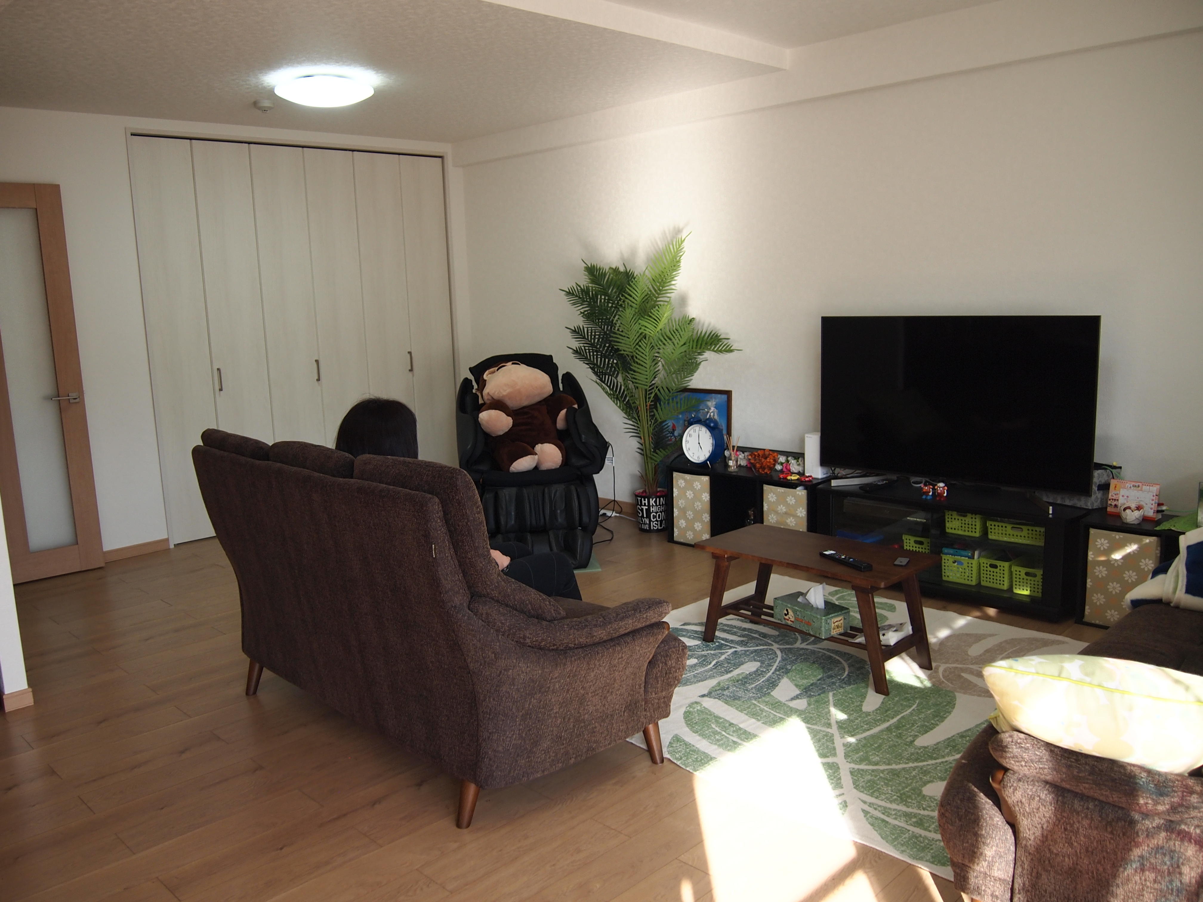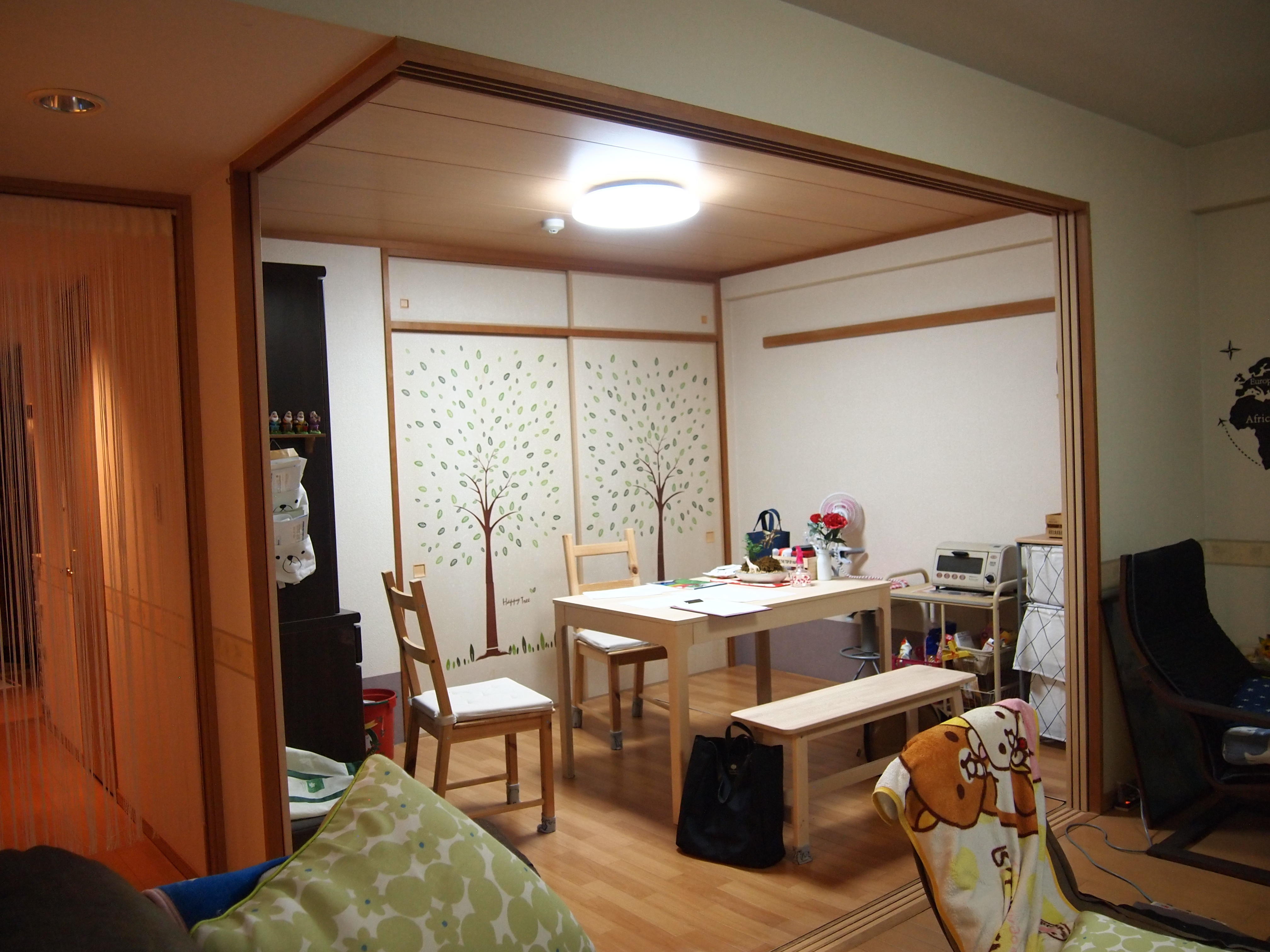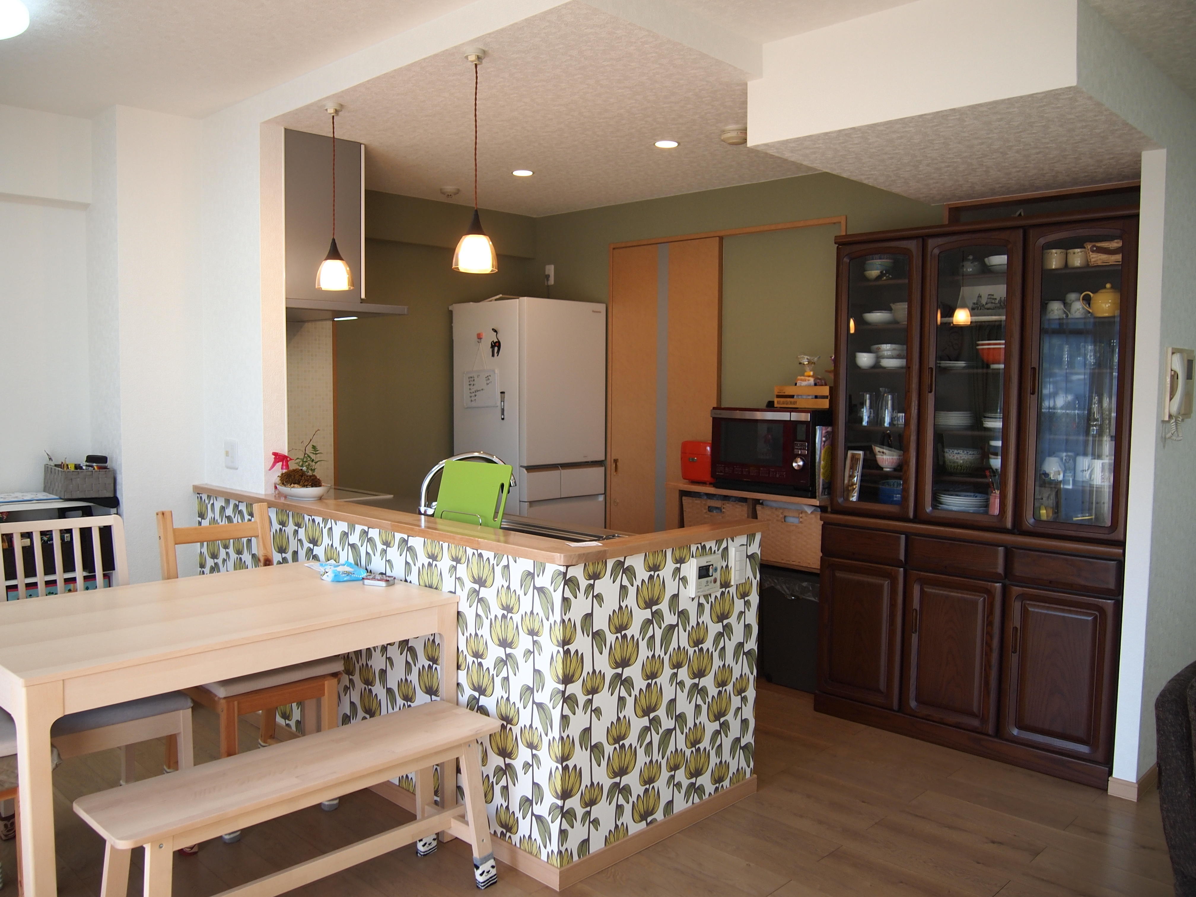 廊下の先にあった扉を移動させてキッチンスペースを広げ、食器棚を置くスペースを確保しました。 キッチン上の垂れ壁もなくし、より開放感のある空間に。 和室との間仕切り壁がなくなった事で大きなLDKになりゆったりくつろぎスペースが生まれました。