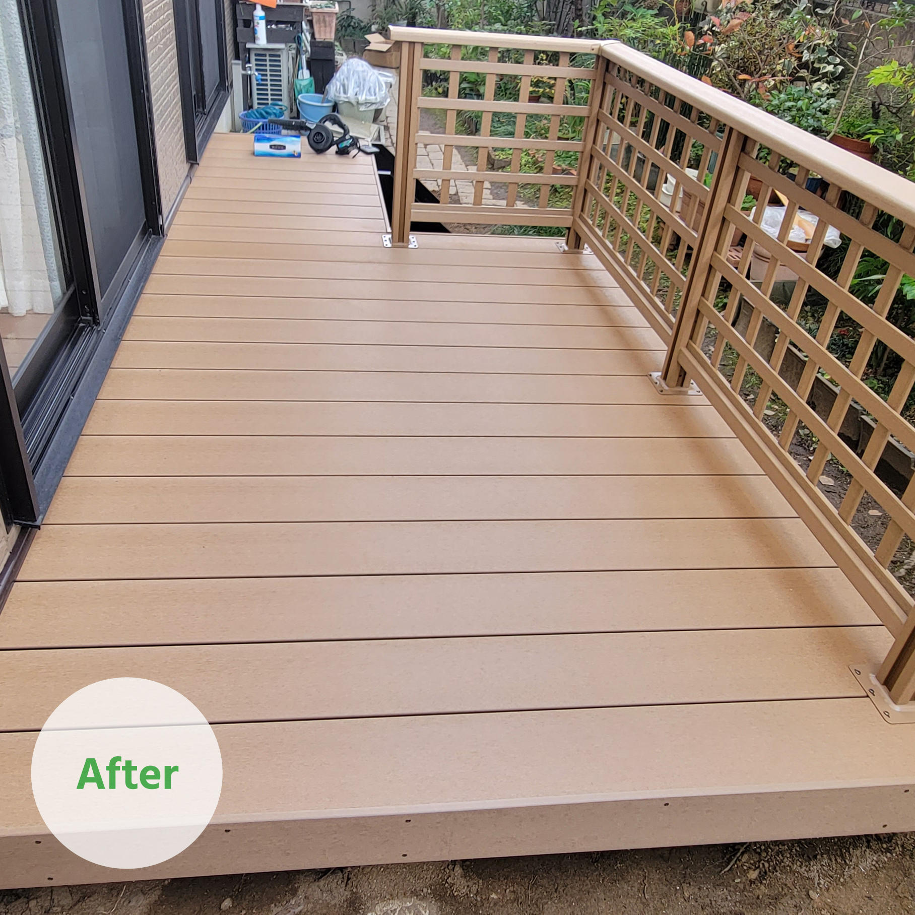 ウッドデッキのリフォームをさせていただきました。 ウッドデッキがあると住まいとお庭の 段差がなくなりお庭をもっと有効活用できます。 場所に合わせて自由な形で設置できます。 人工木のウッドデッキは汚れも落としやすく メンテナンスがラク! シロアリの心配もなくお子様やペットにも安心です。