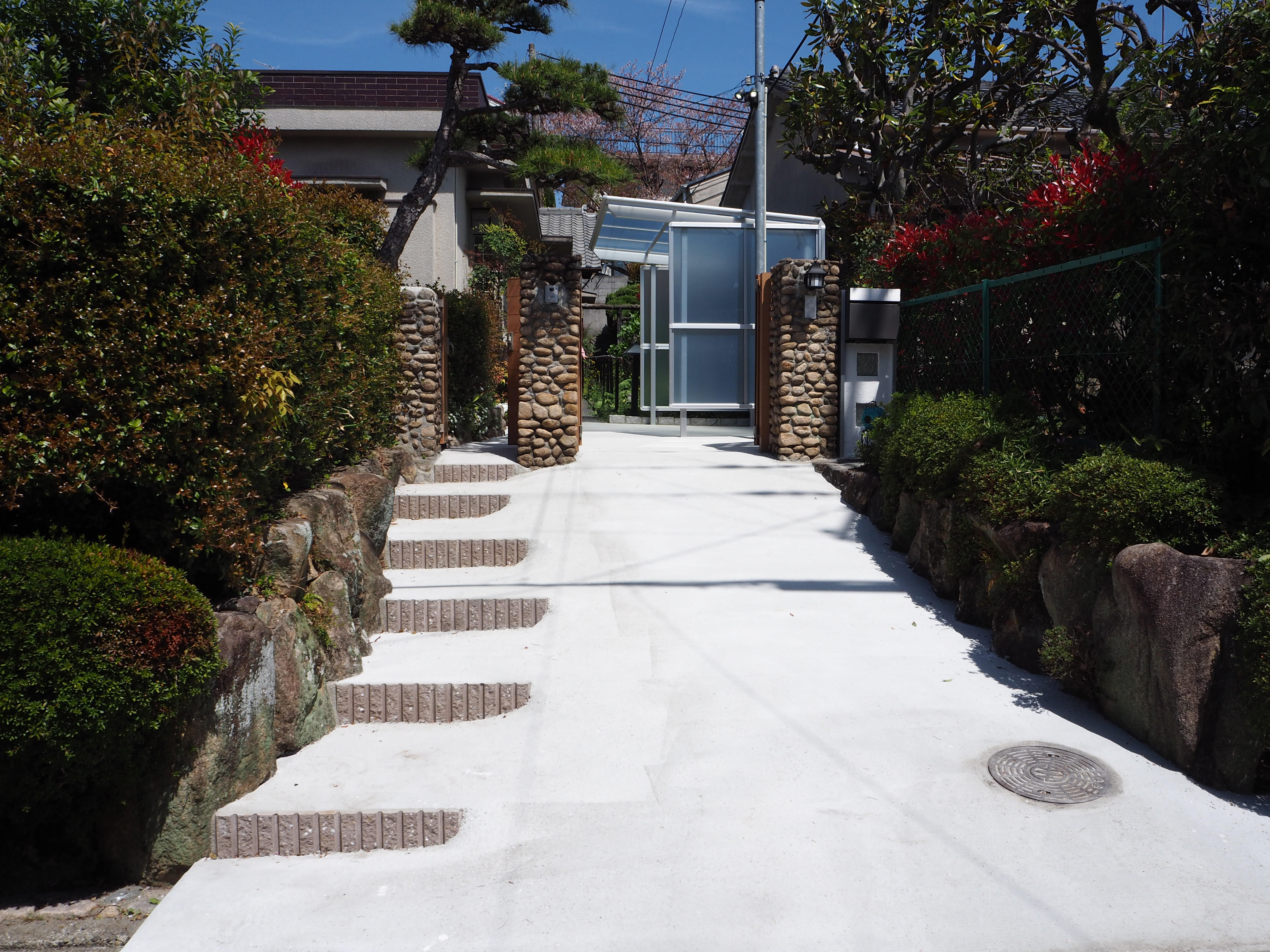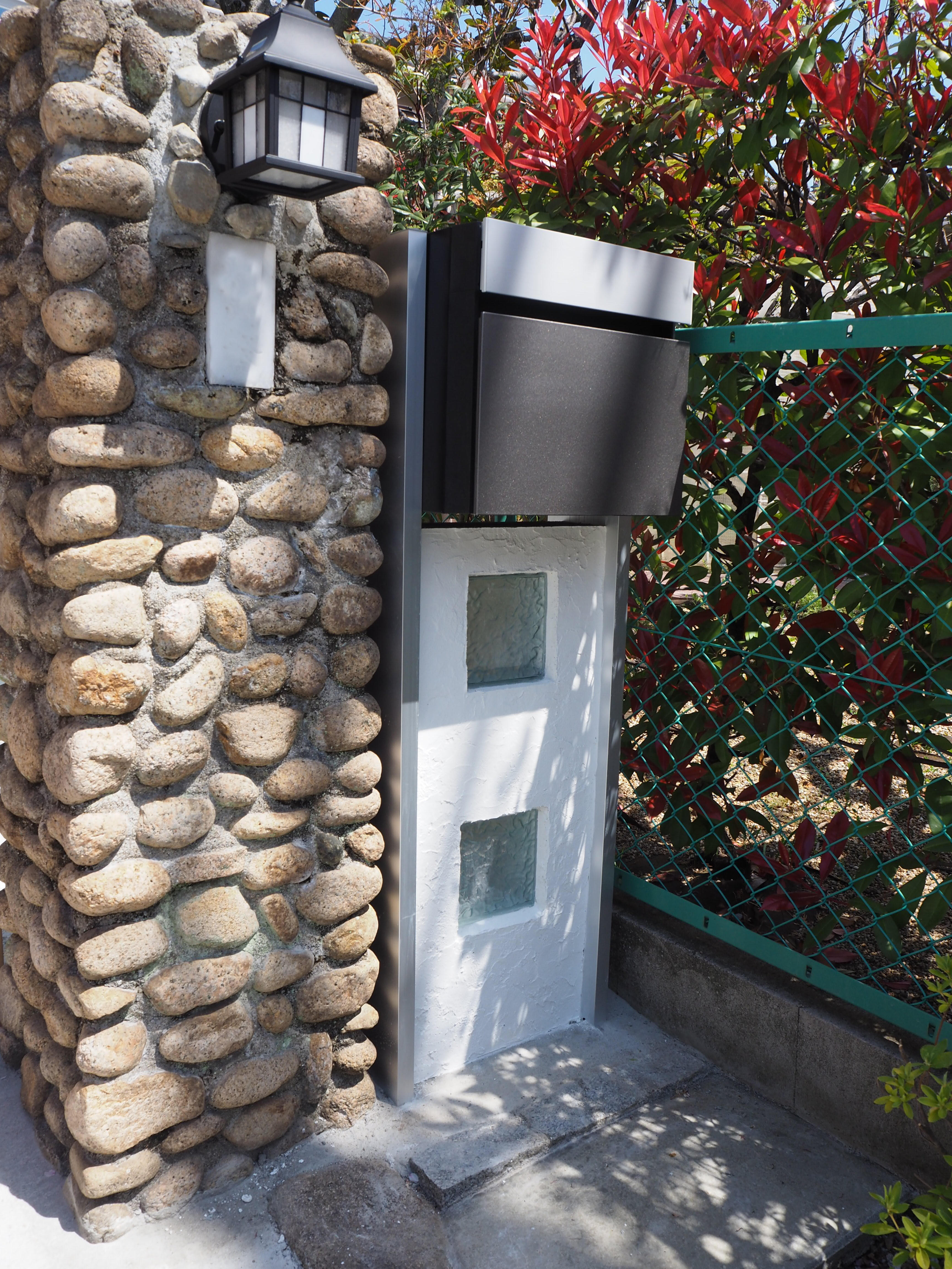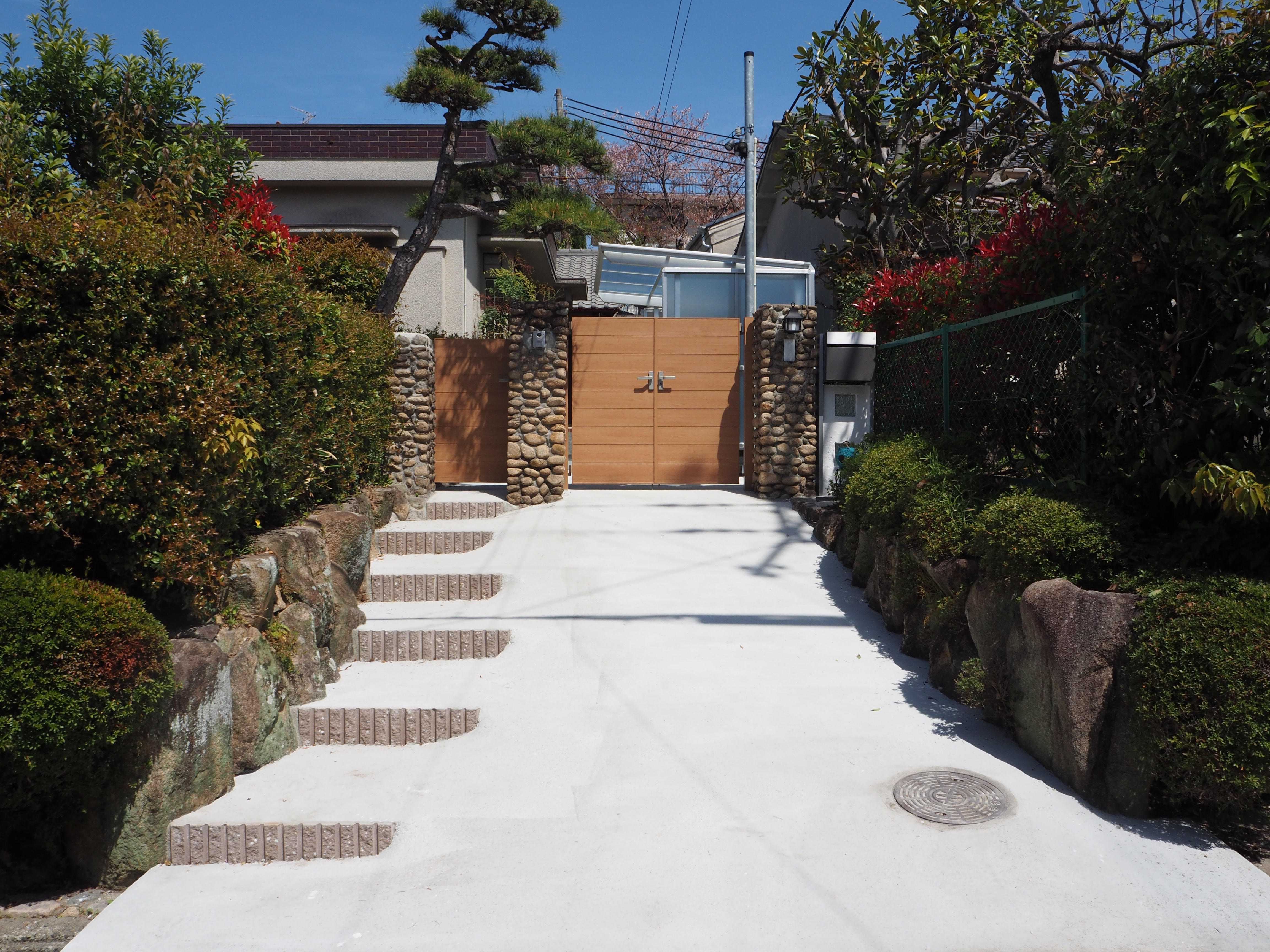 外構工事をさせていただきました。 足腰の弱ってきたお母さまの為に階段の幅を縮小し 残りをスロープにしました。 スロープにすることで門の内側にバイク置き場が設置可能に! 盗難防止になります。 石を積み上げた門柱は残し、門扉とポストを取りかえました。 和洋折衷、素敵な門まわりになりました。