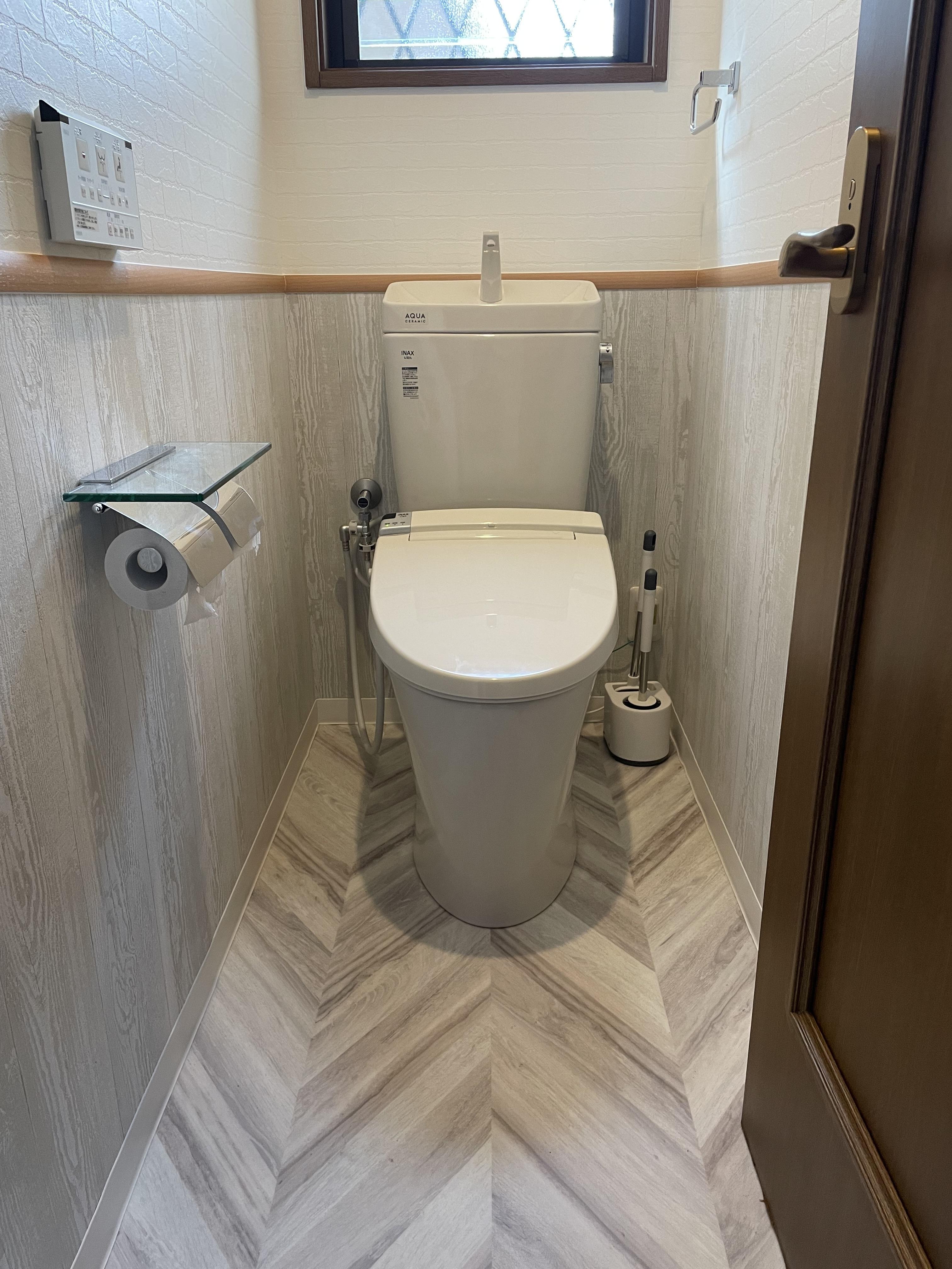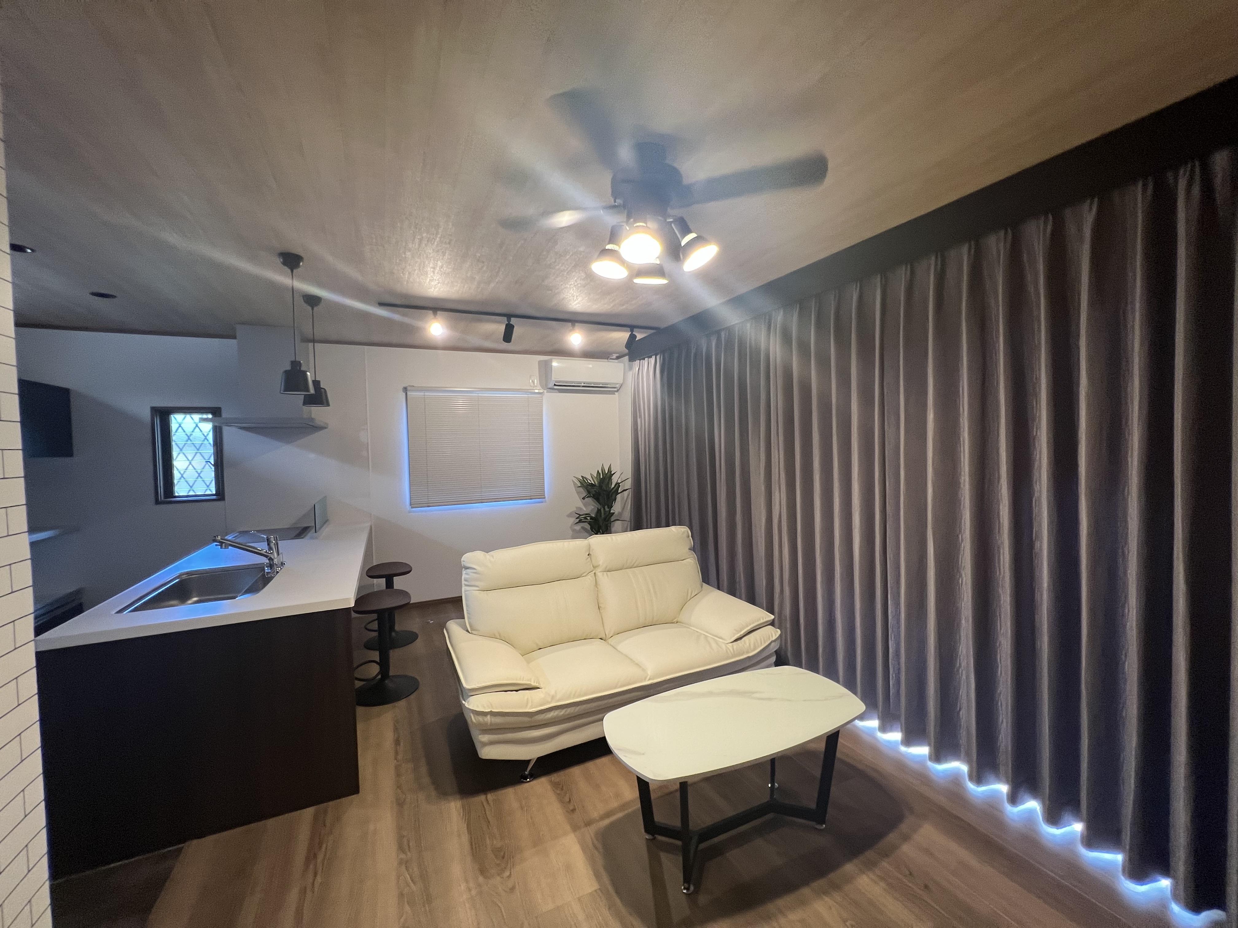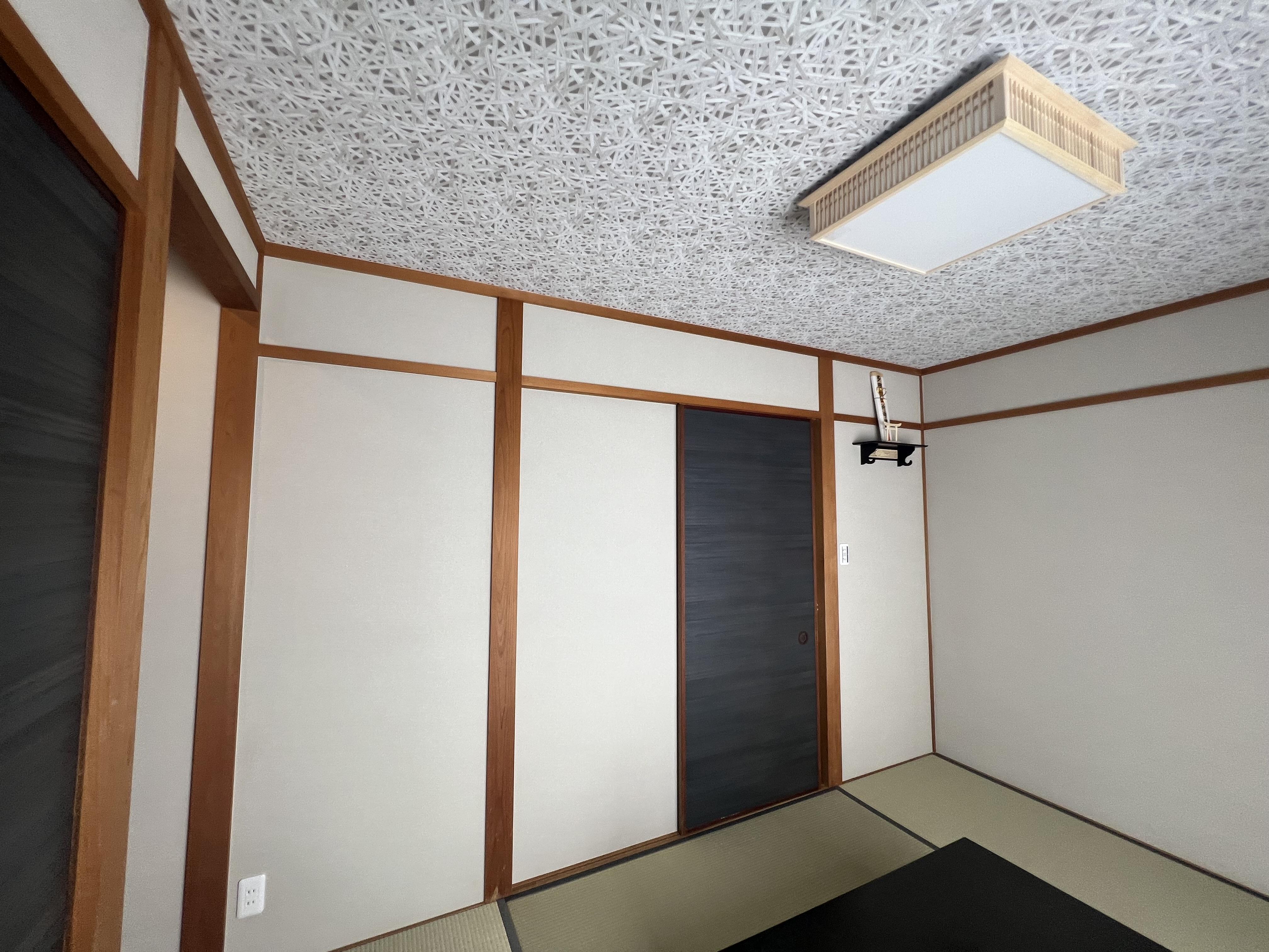 内装・水回りの工事をさせていただきました。 LDKは、木目+ブラックを基調に、 ヴィンテージ感のあるかっこいい雰囲気を目指しました 壁掛テレビにあわせたシンプルなテレビボードは、 お客様のご要望に合わせて造作しています。 またカーテンは電動で開閉できるので便利です。 和室の方も、クロスや襖紙・ブラックの掘り座卓も 雰囲気にぴったり合っていて、とても喜んでいただけました。
