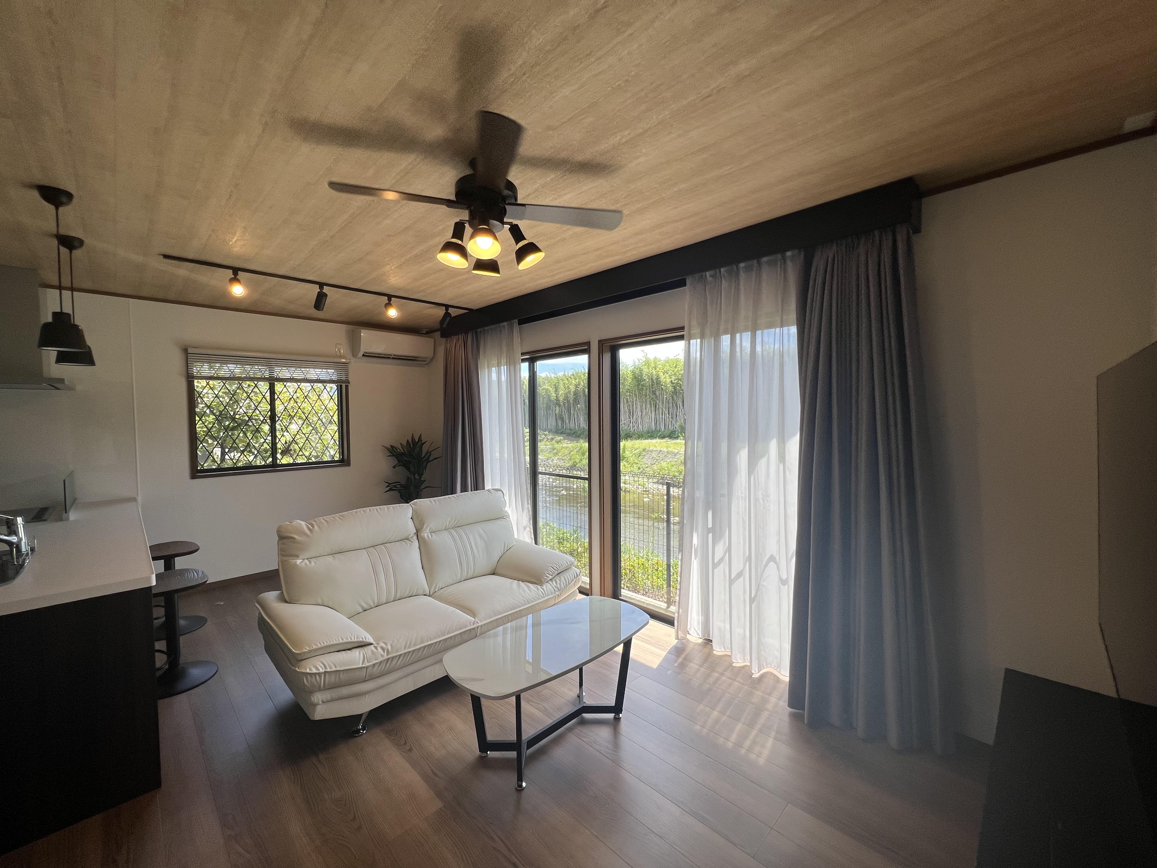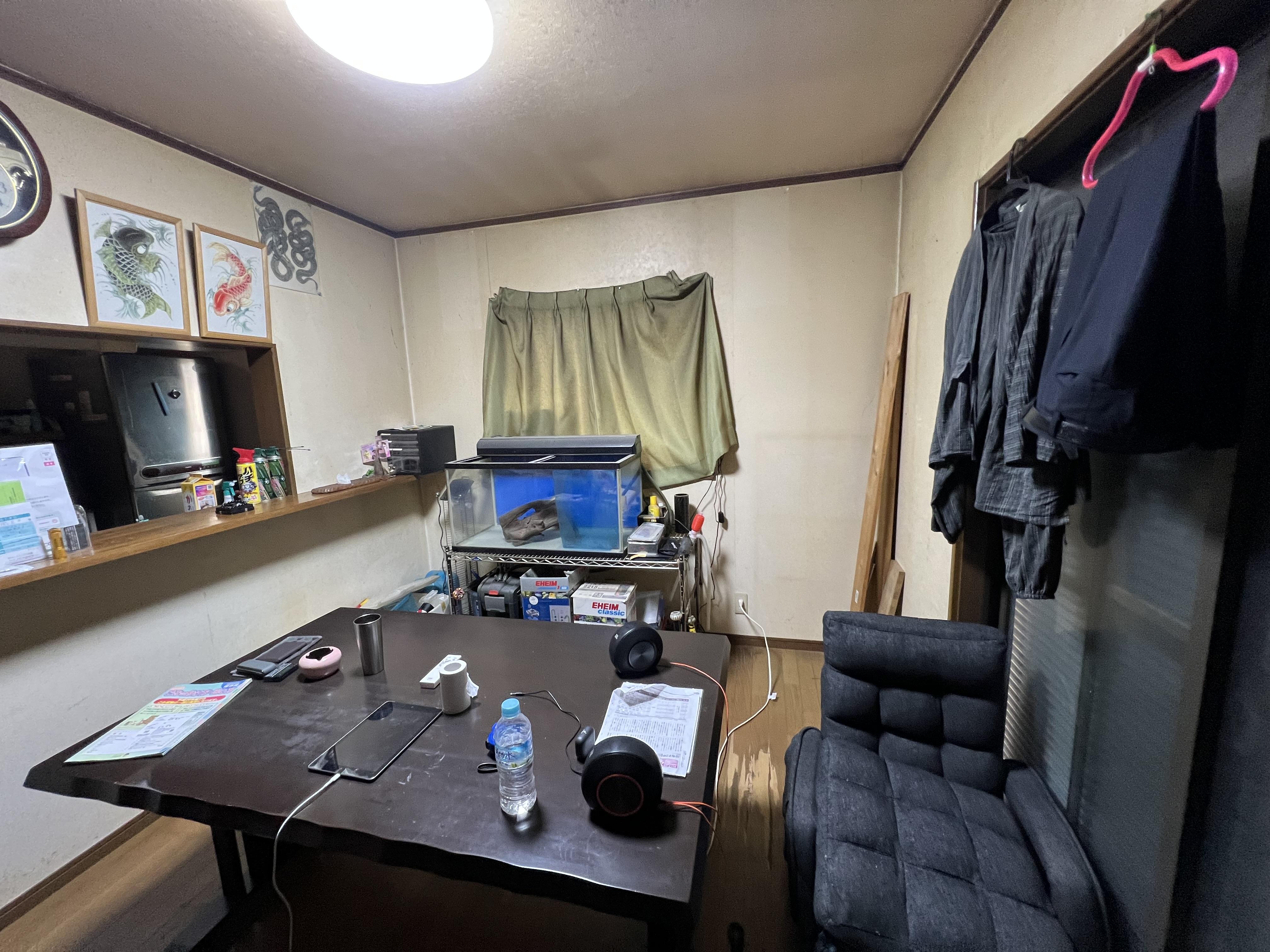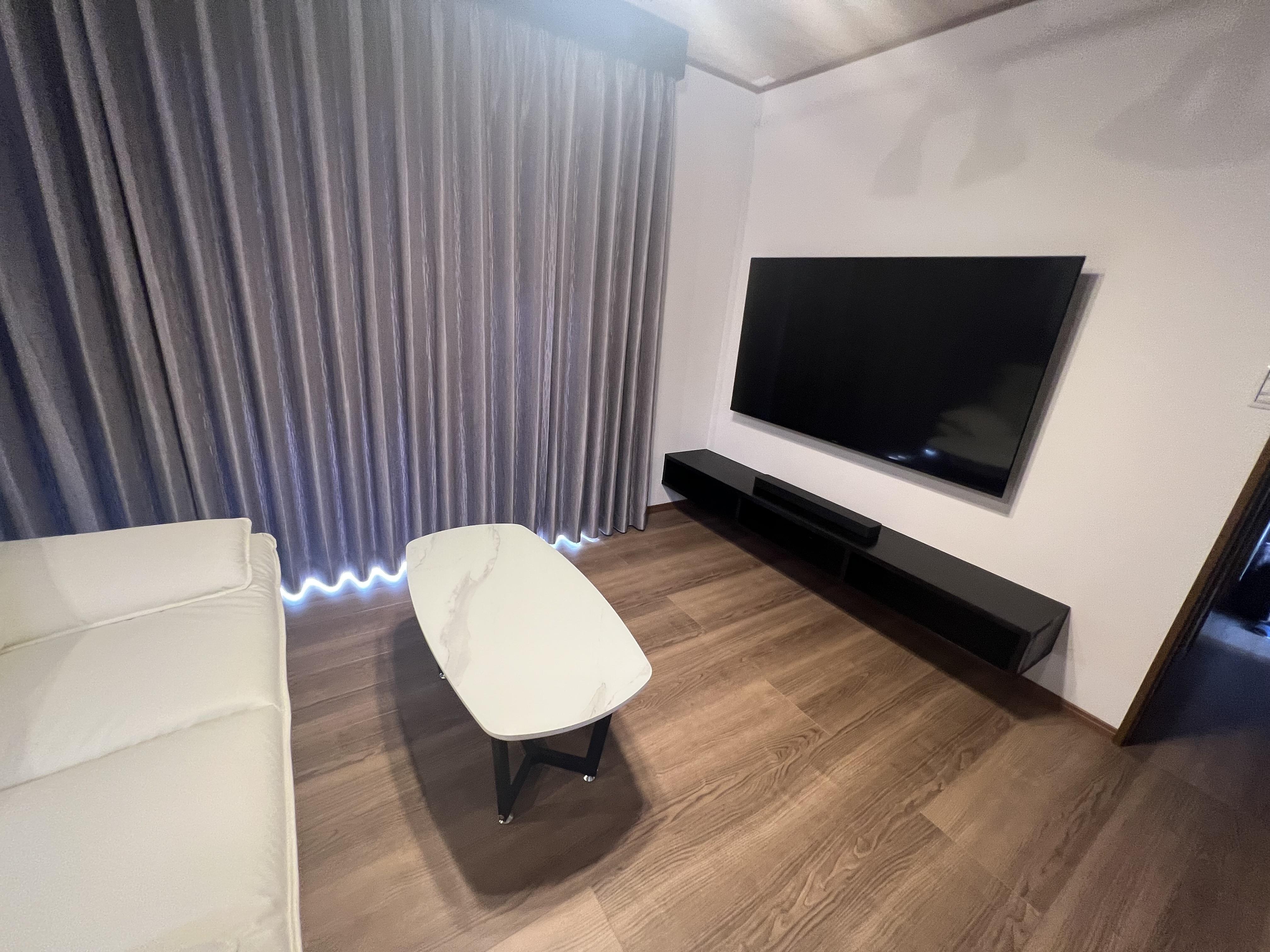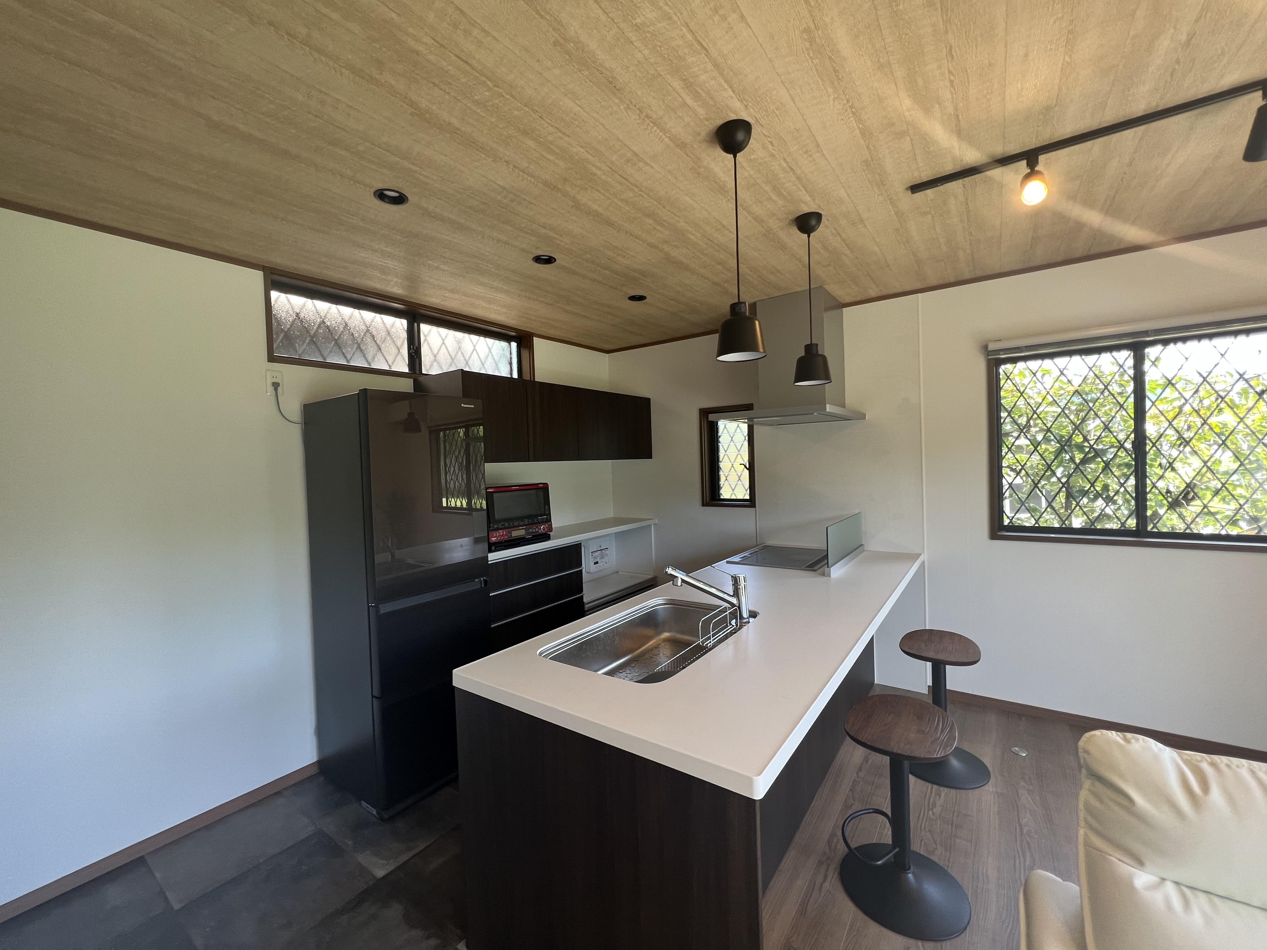 内装・水回りの工事をさせていただきました。 LDKは、木目+ブラックを基調に、 ヴィンテージ感のあるかっこいい雰囲気を目指しました 壁掛テレビにあわせたシンプルなテレビボードは、 お客様のご要望に合わせて造作しています。 またカーテンは電動で開閉できるので便利です。 和室の方も、クロスや襖紙・ブラックの掘り座卓も 雰囲気にぴったり合っていて、とても喜んでいただけました。