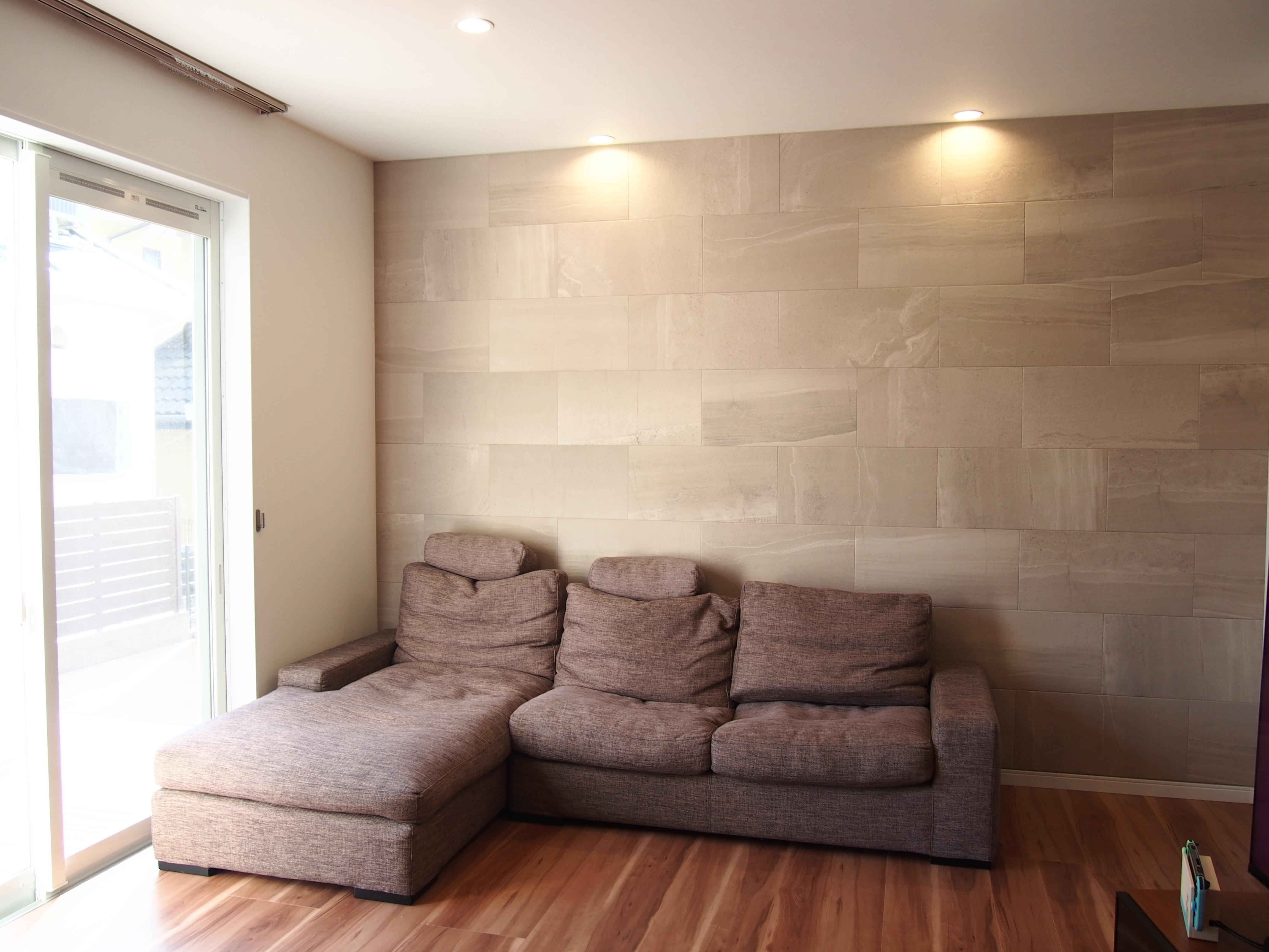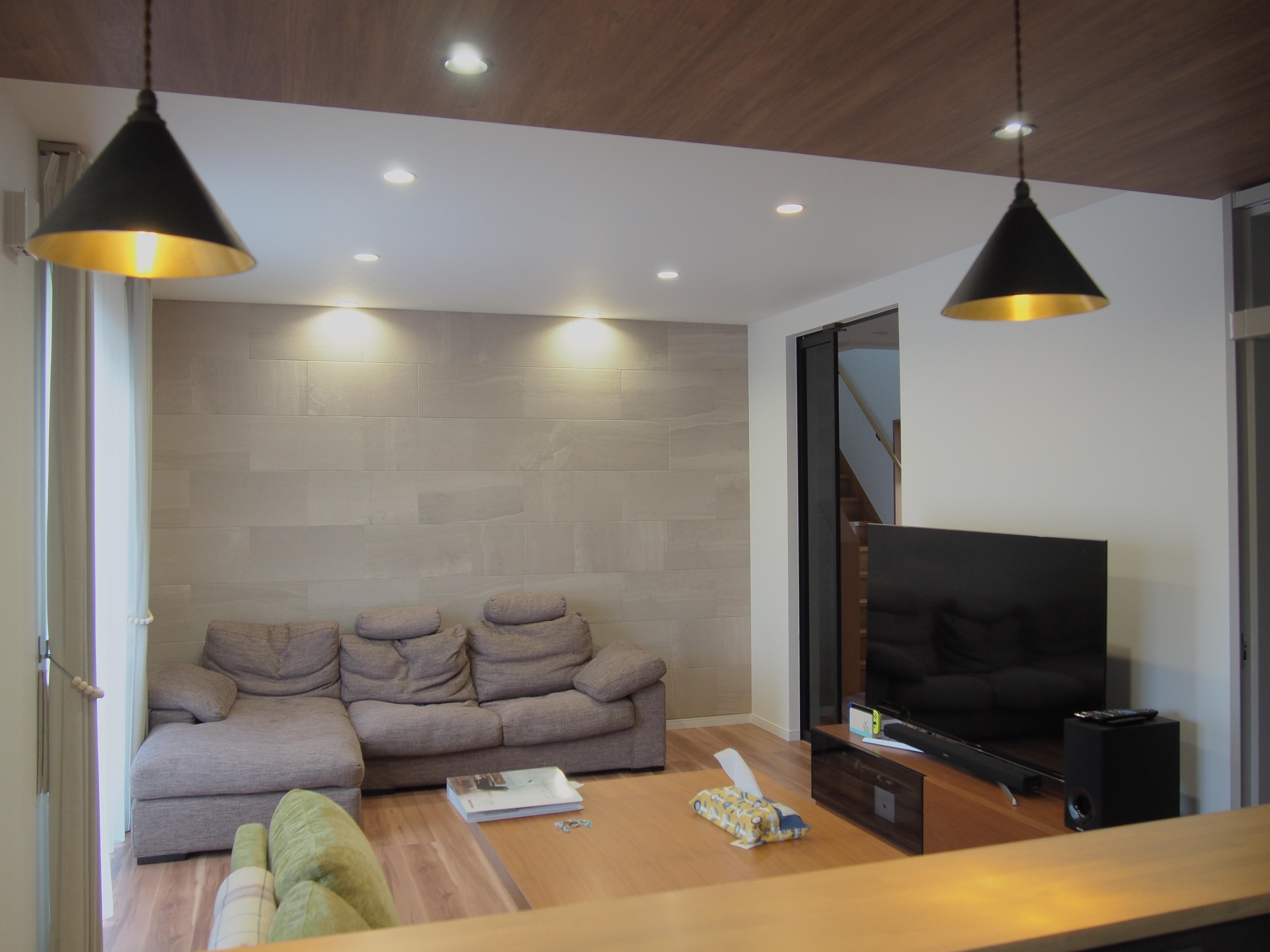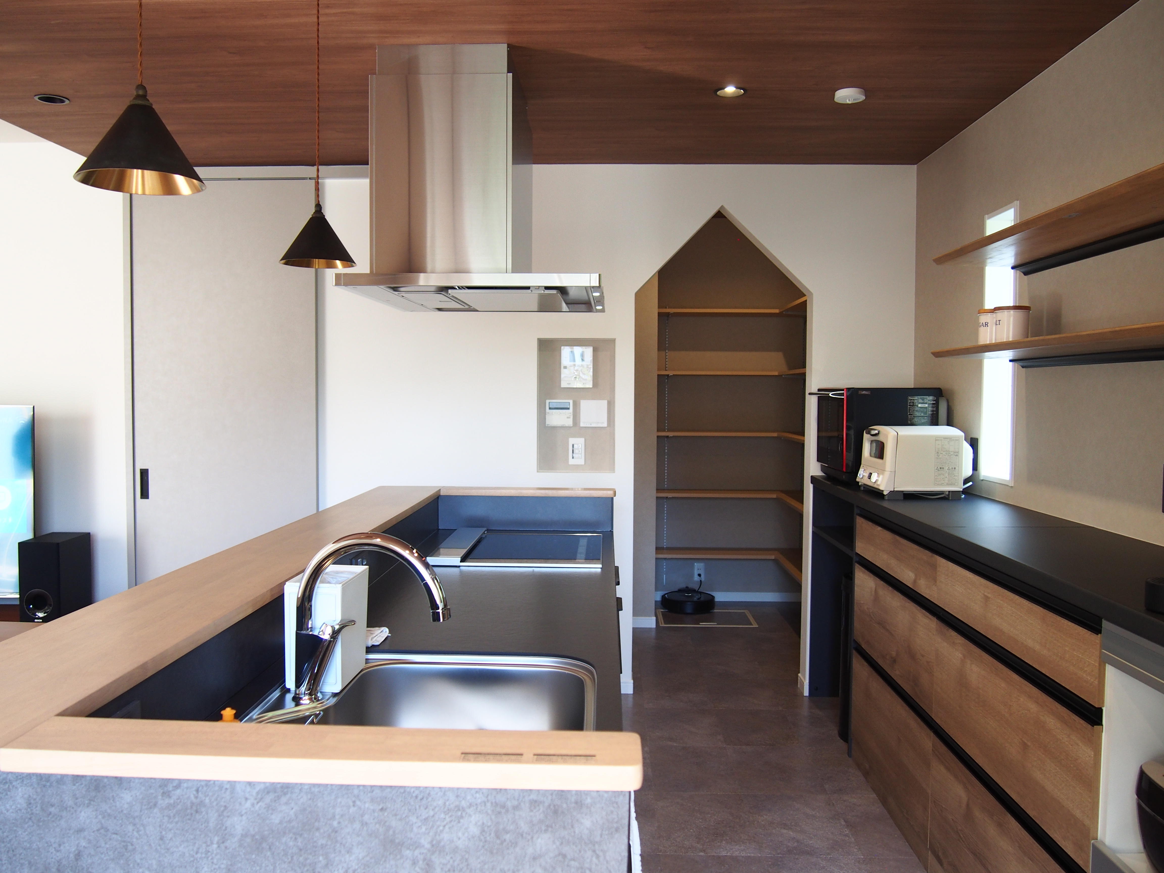 あえて和室との間の引き違い戸はなくし、一面エコカラット・ストーングレースをアクセントにしました。また広かった洗面スペースを小さくし、キッチンすぐのパントリーを作りました。入口はおうち型にしています。中にはマグボードを取付けて、お子様の学校のプリントなどを貼るなどに便利です。