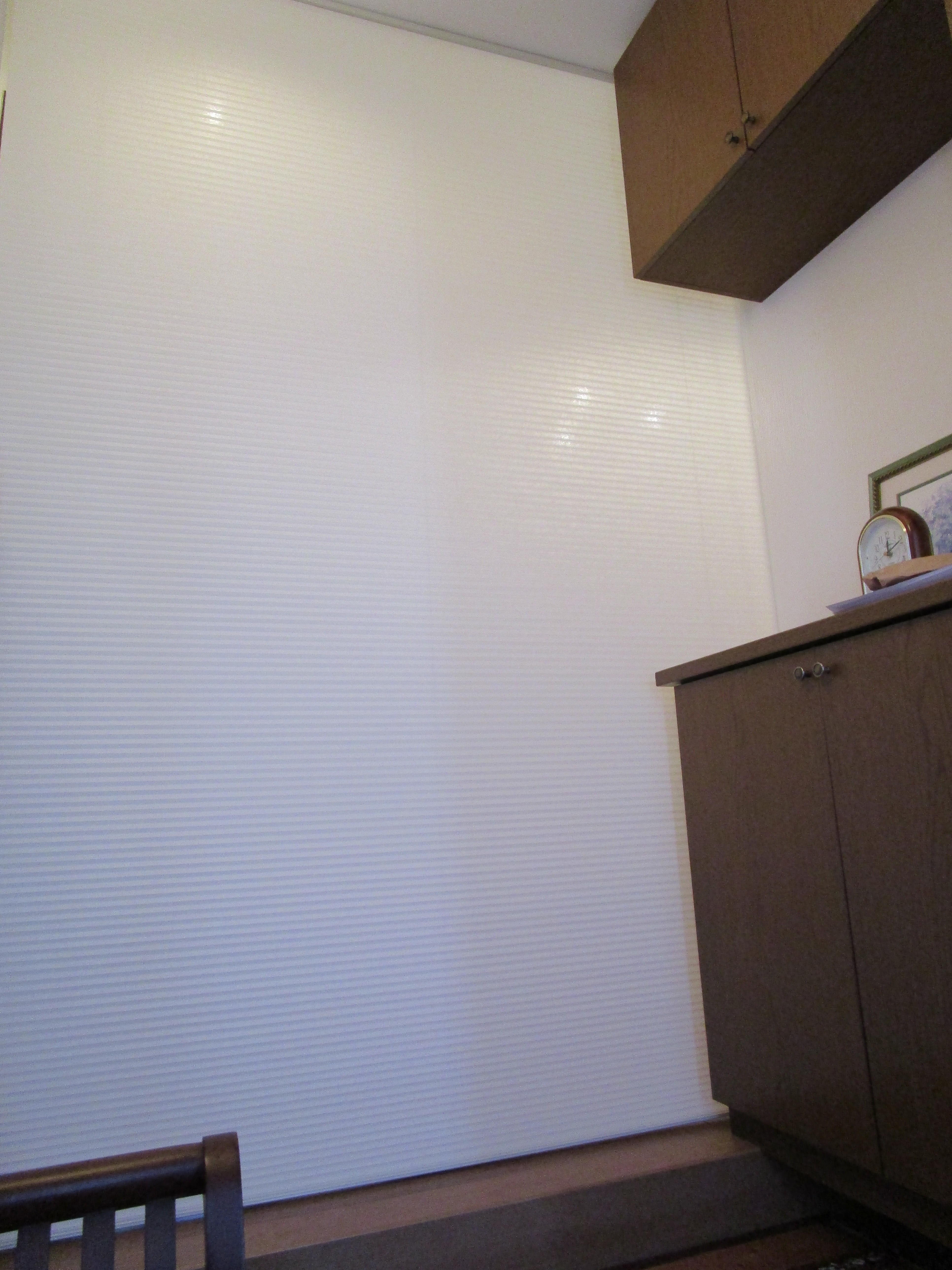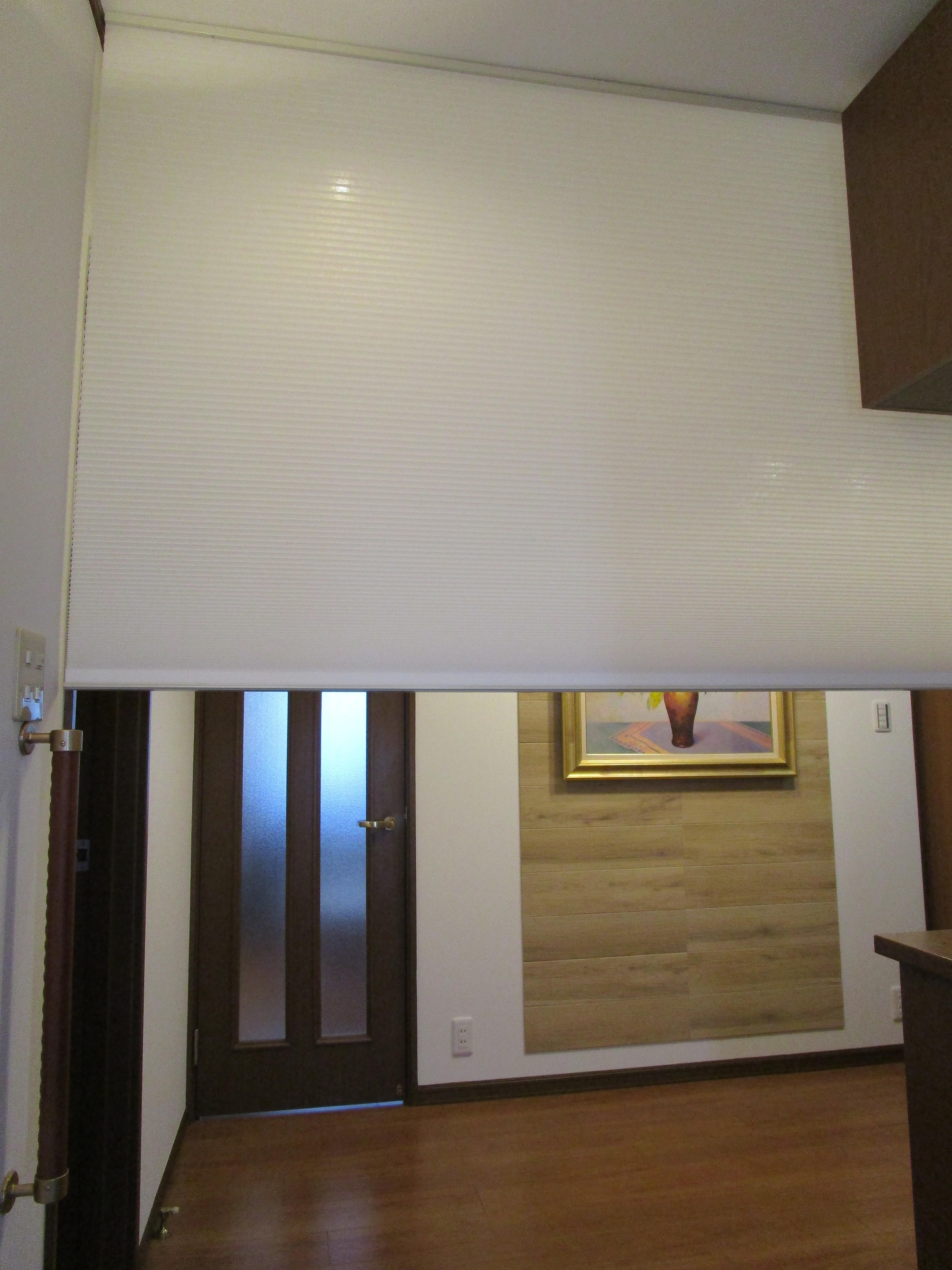 玄関ホール正面にエコカラットを設置しました。 断熱効果のあるハニカムスクリーンを設置して玄関と廊下を間仕切りる事で冷たい空気を遮断できます。 必要に応じてサッとおろすだけなので簡単に寒さ対策ができます。