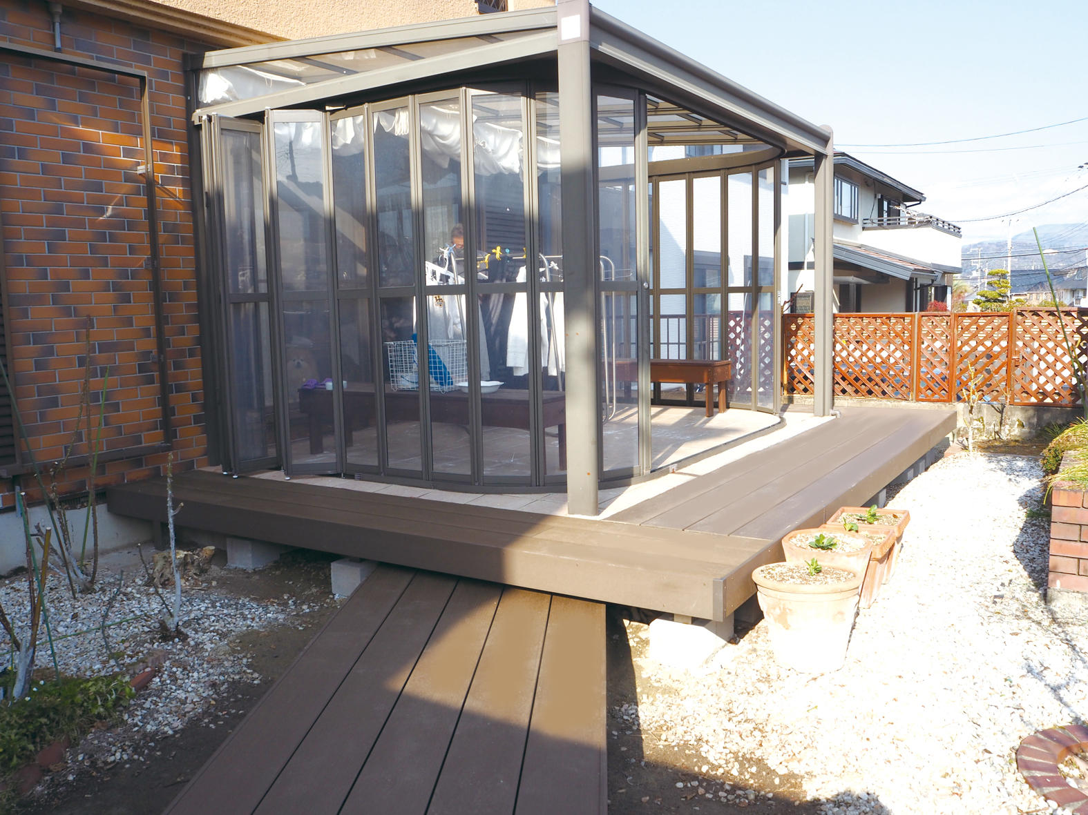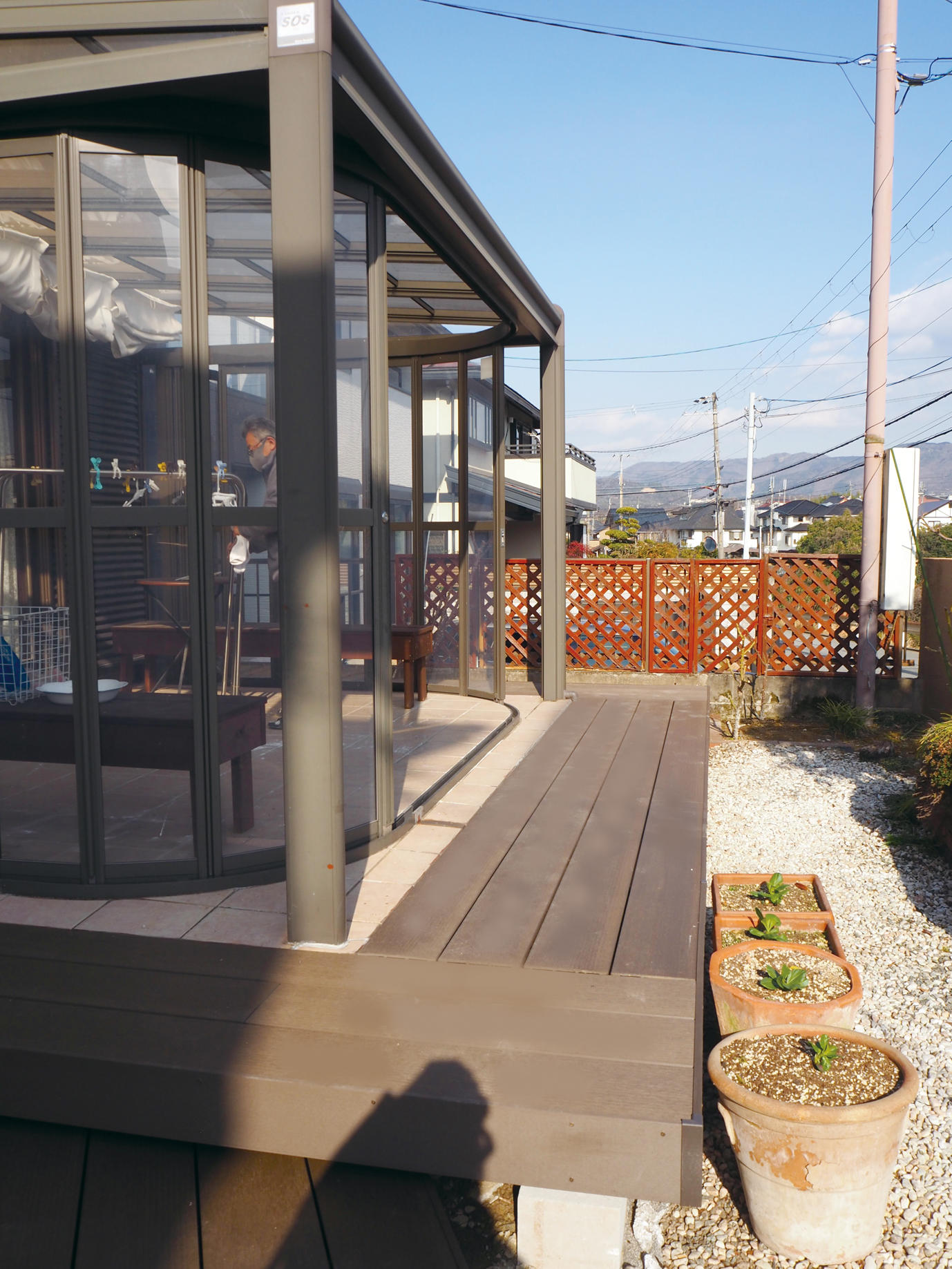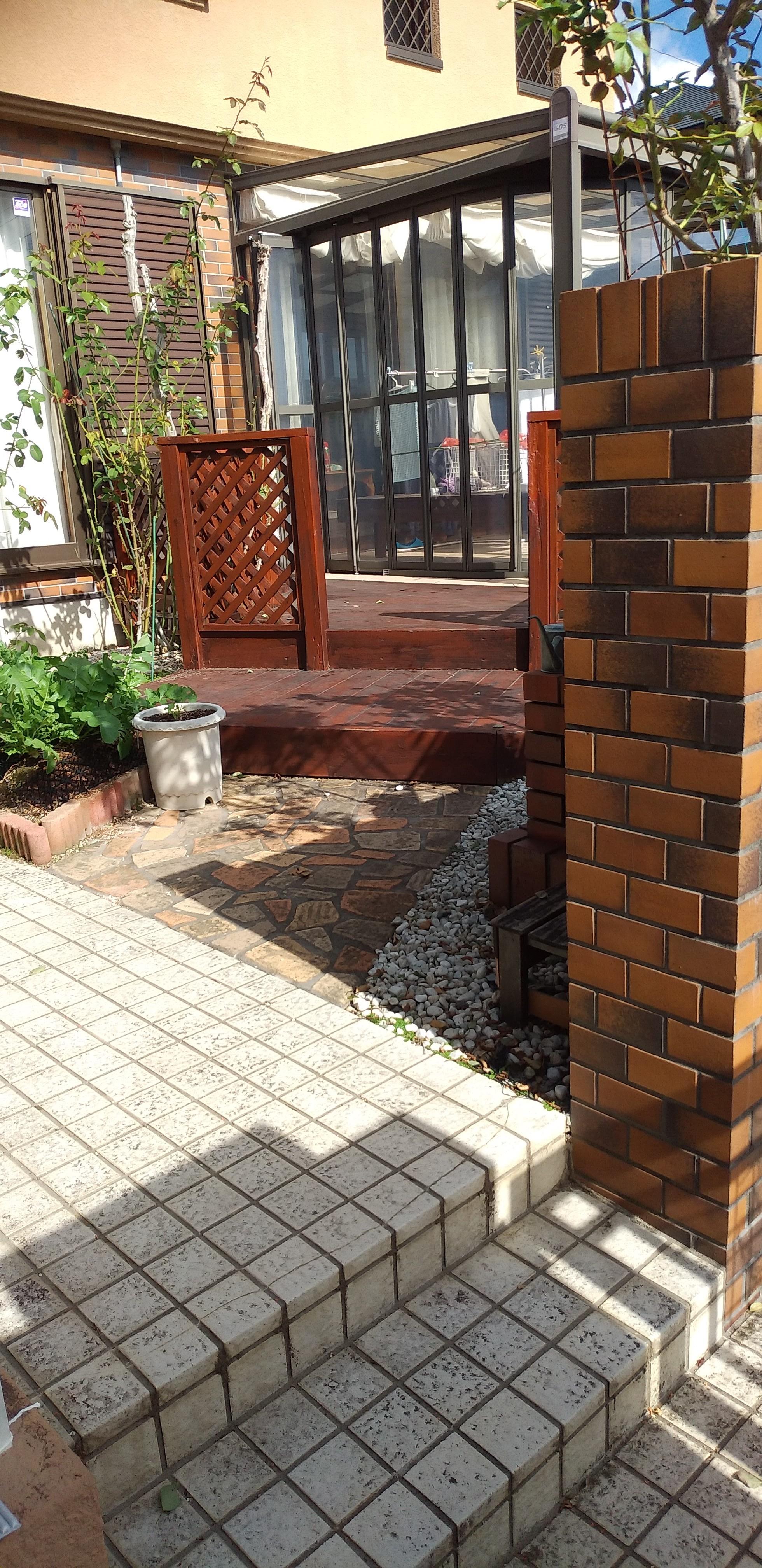 木製ウッドデッキが痛んできたので、耐久性の良い人工木製のウッドデッキ「LIXILレストステージ」に取替させていただきました。 サンルームとタイルデッキは既存の物を残し、雰囲気は変わらないようにしつつ、 色見は少し明るくしました。