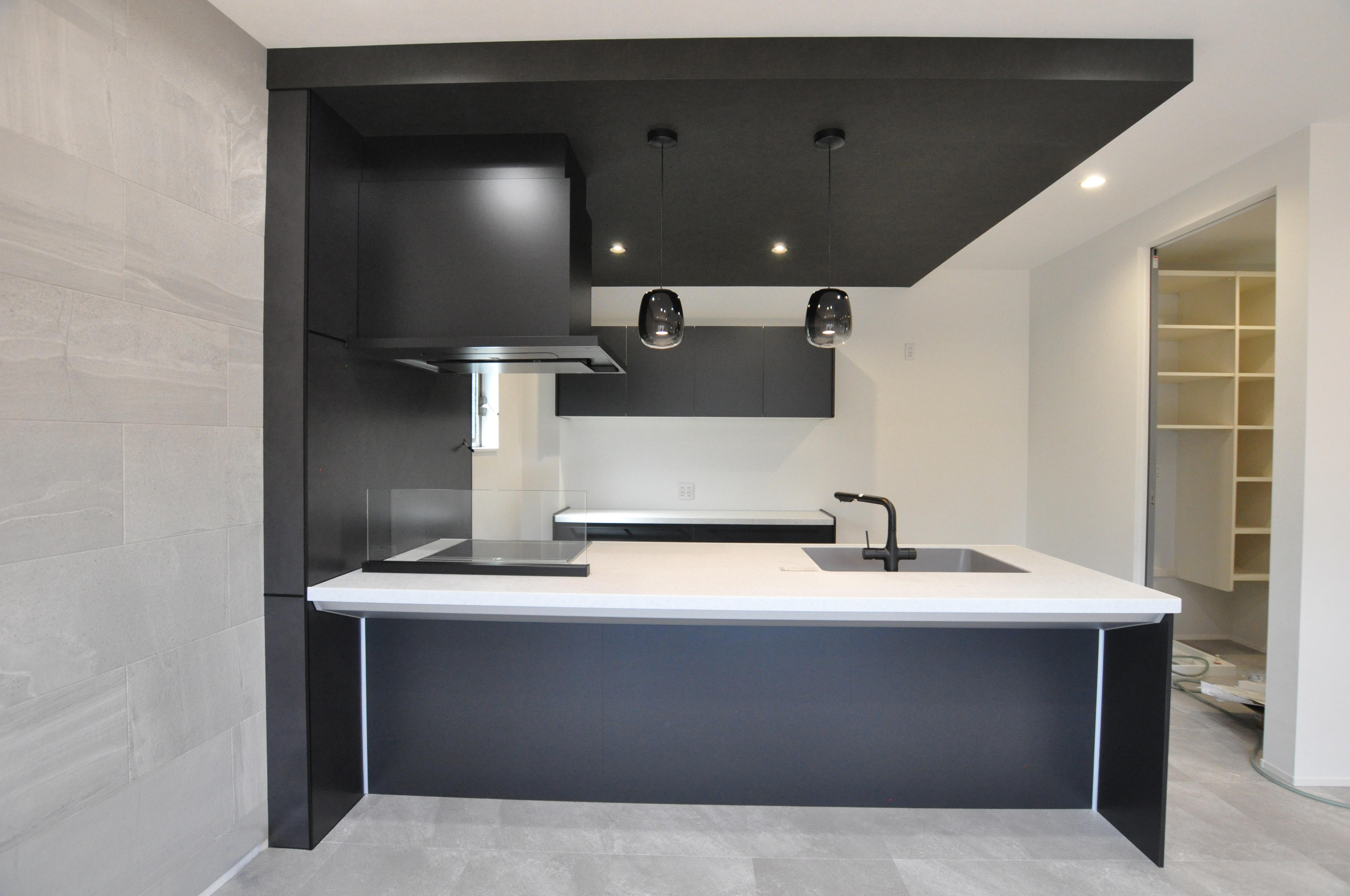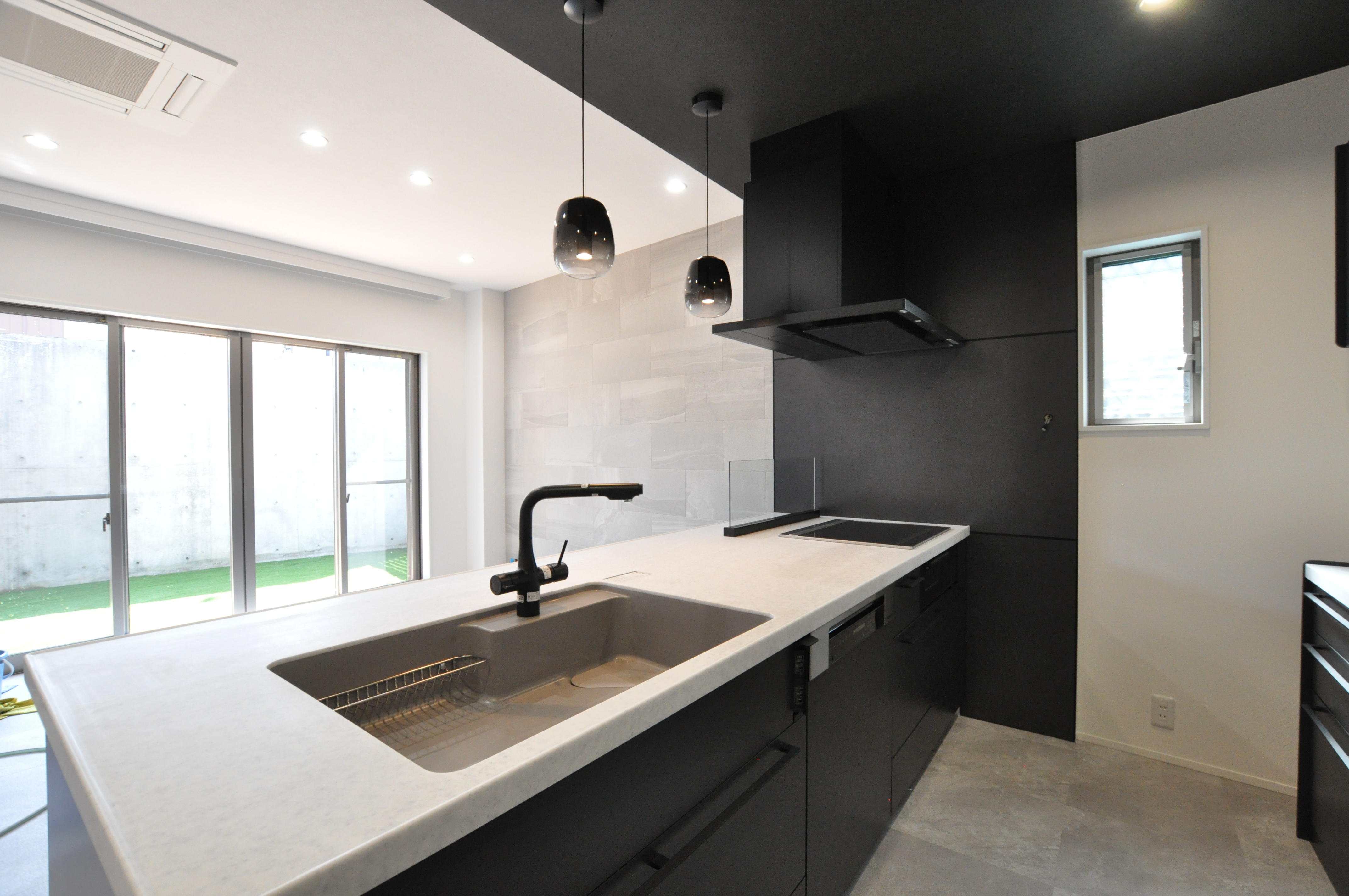 キッチンはご夫婦でこだわり、ブラックのペニンシュラ型(クリナップ)を選定いただきました。