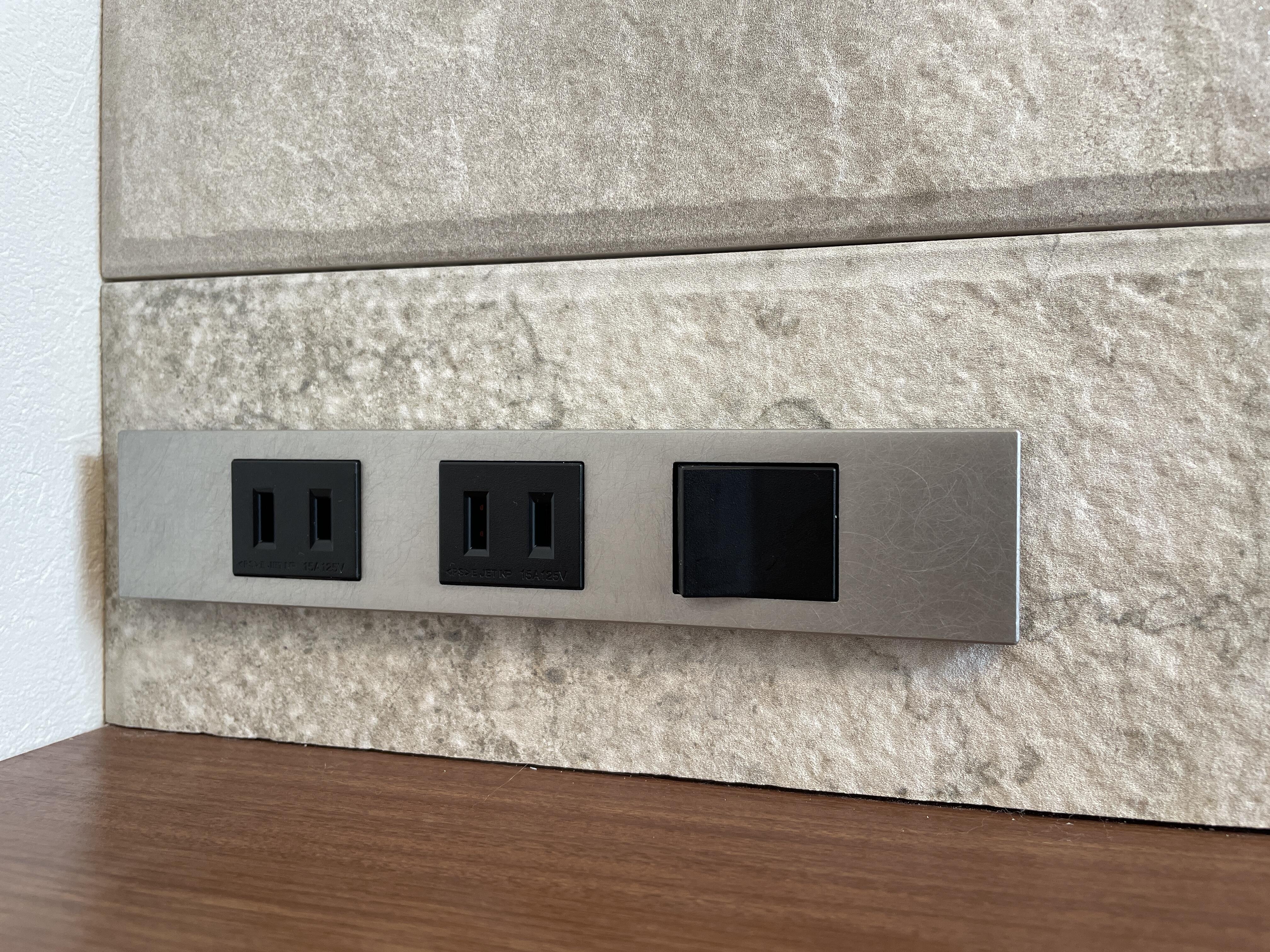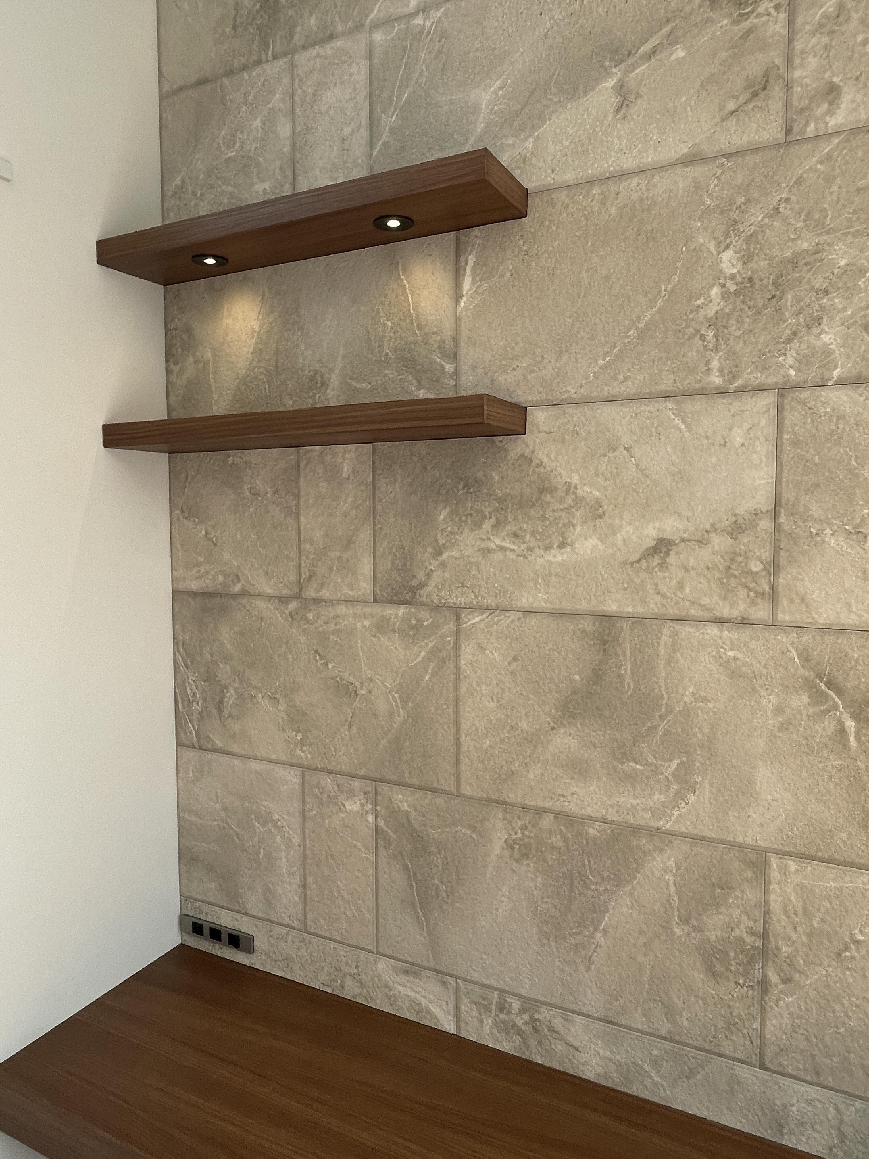 エコカラット、TVボード取付をさせていただきました。 エコカラットのサンティエは石を再現した質感が高級感もあってリビングのアクセントに! 建具メーカー南海プライウッドの飾り棚「リブニッチ」はお気に入りの小物をオシャレに美しくディスプレイできます! コンセントもエコカラットの雰囲気にあわせてスタイリッシュでスッキリとしたSプレート(エクストラメタル)を採用しました。
