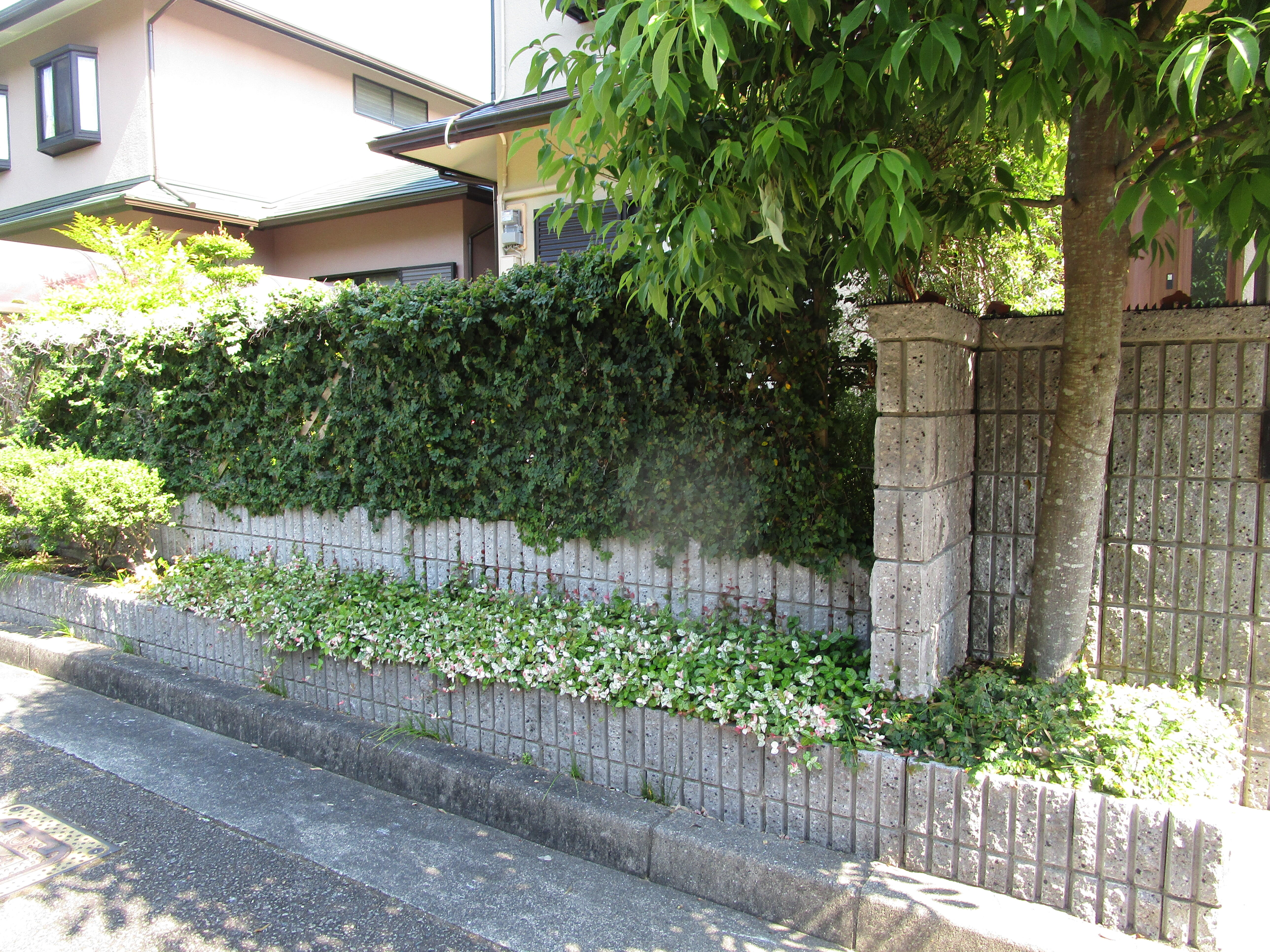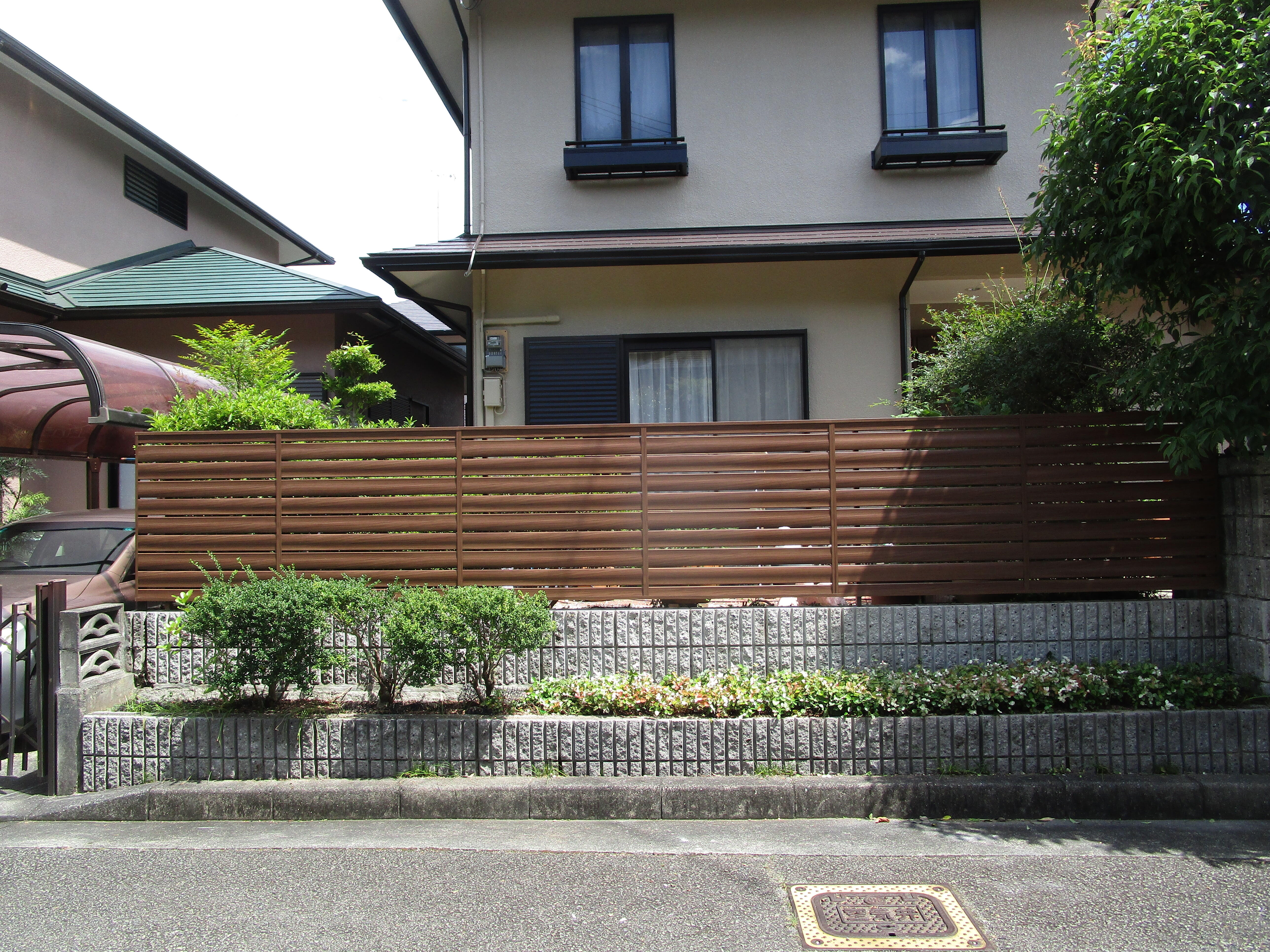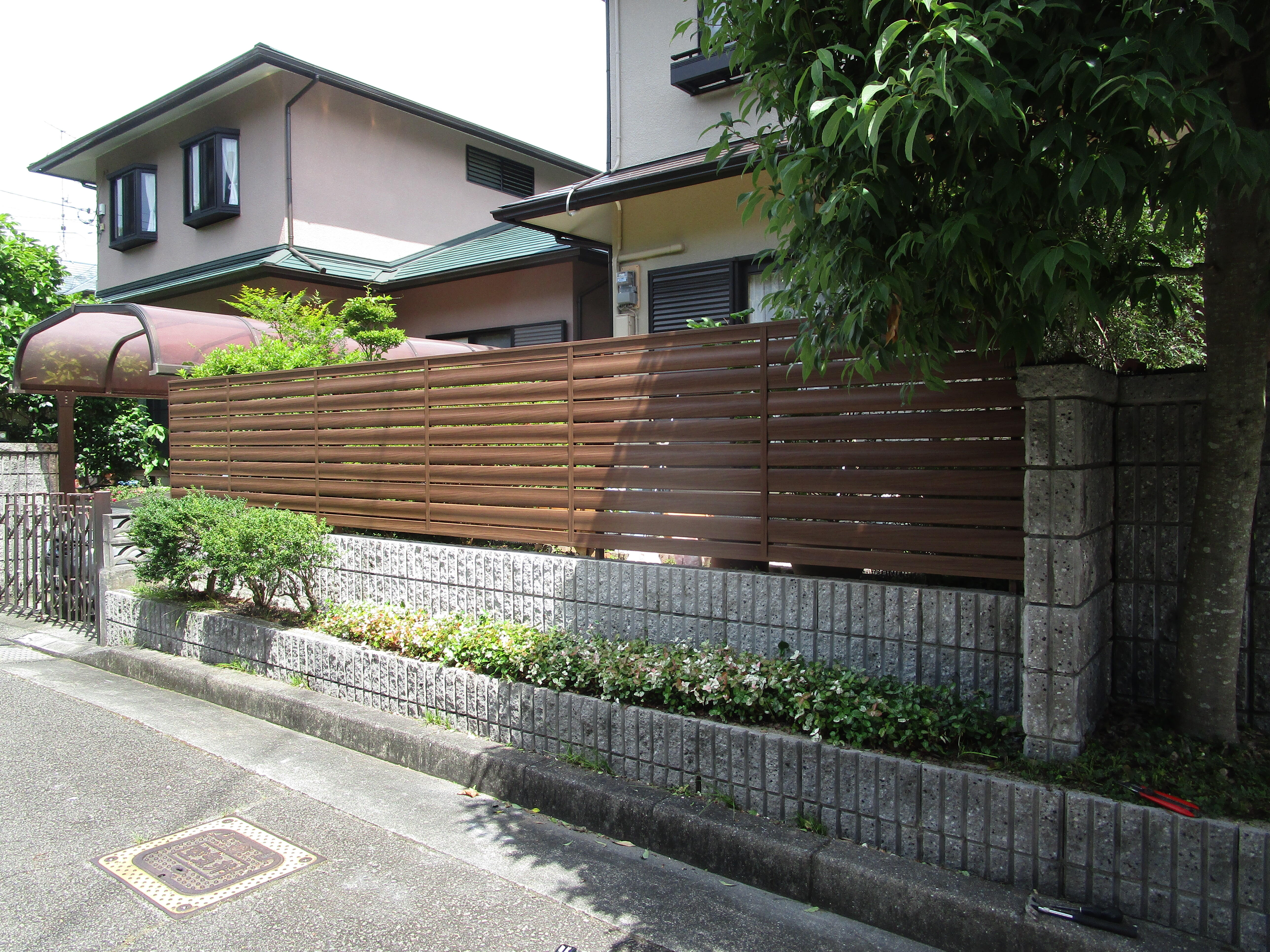 フェンスの取替をさせていただきました。 元は高さの低いスチールフェンスだったので木製のラチスにツタを這わせて目隠しがわりにしていたのですが、ラチスが傷みメンテナンスもしづらかった為LIXILのフェンスAA:YS1型に取替ました。