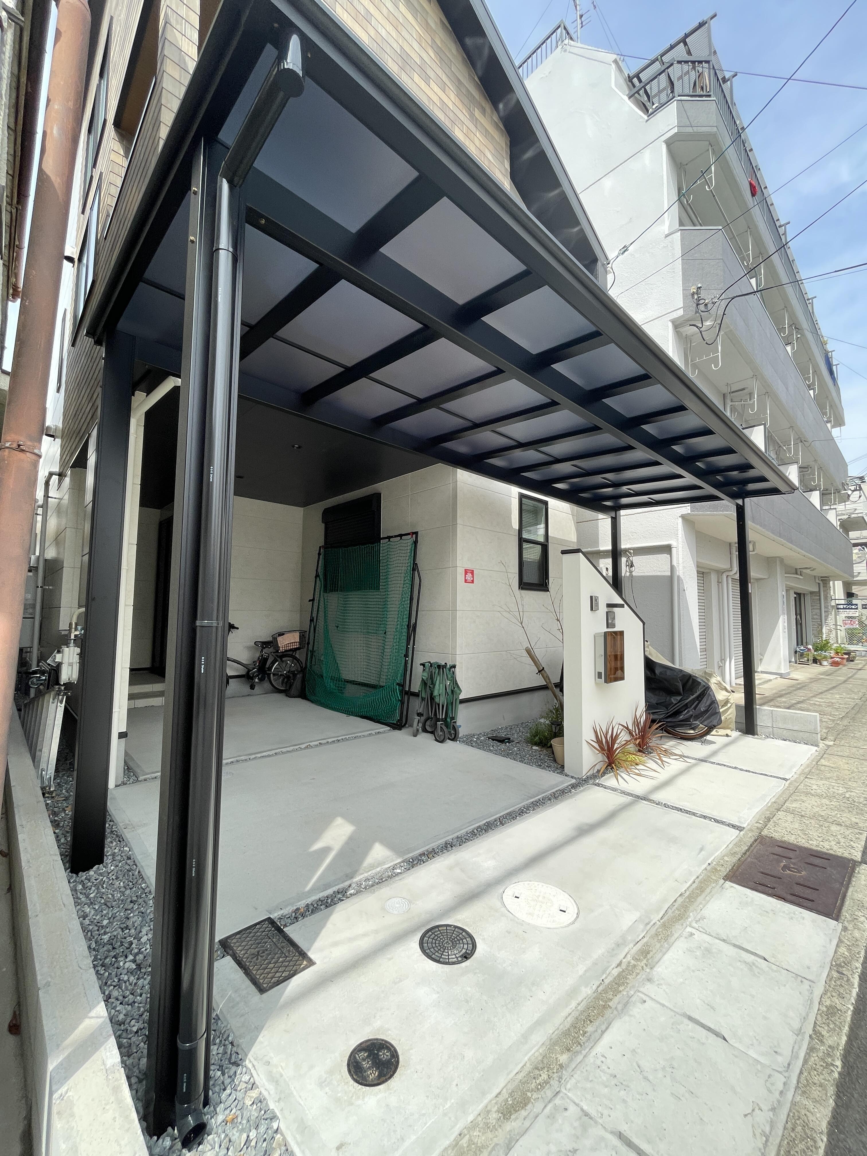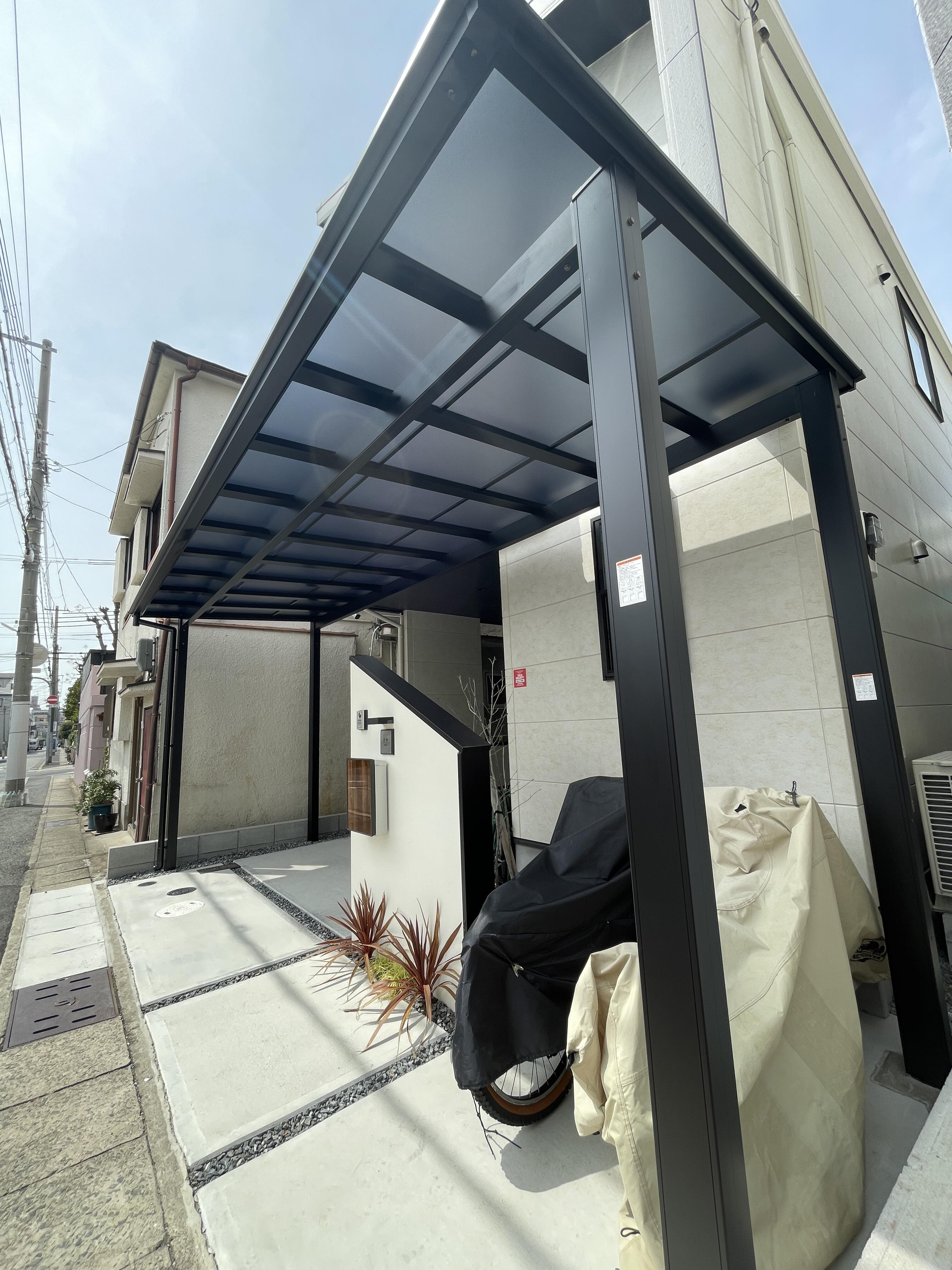 カーポート設置工事をさせていただきました。 カースペースだけでなくサイクルスペースにも屋根が届くようにサイズを検討して設置させていただきました。